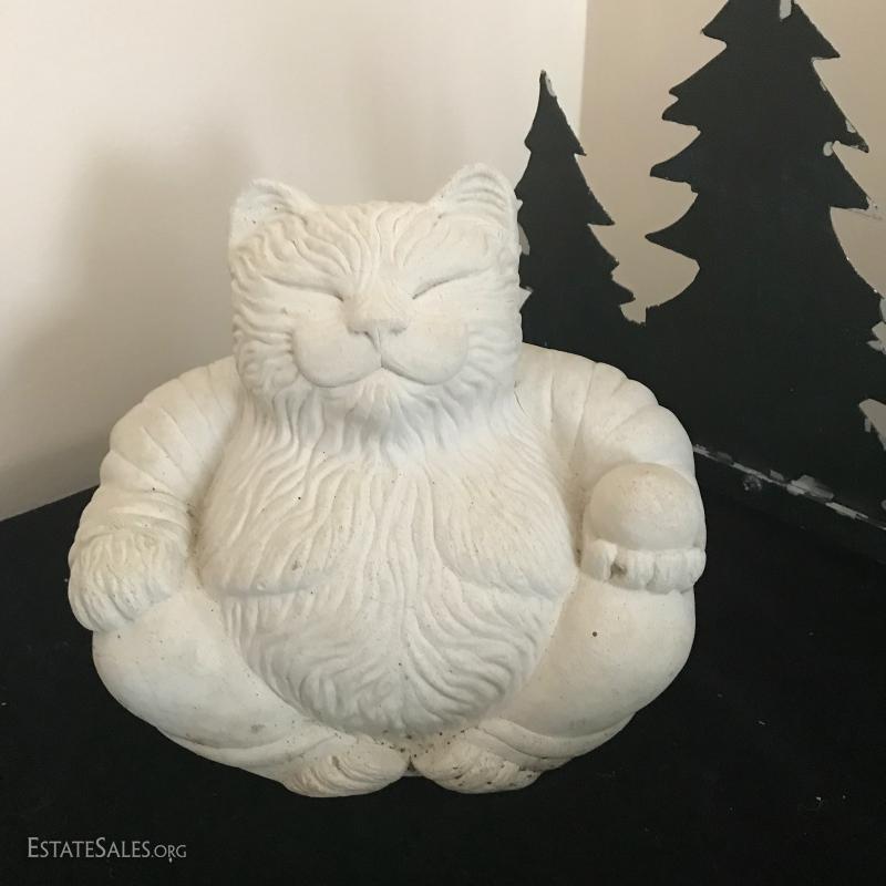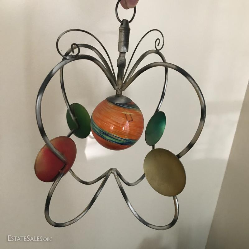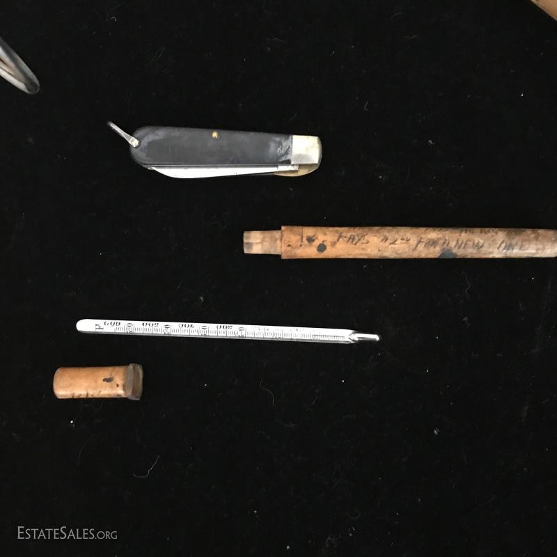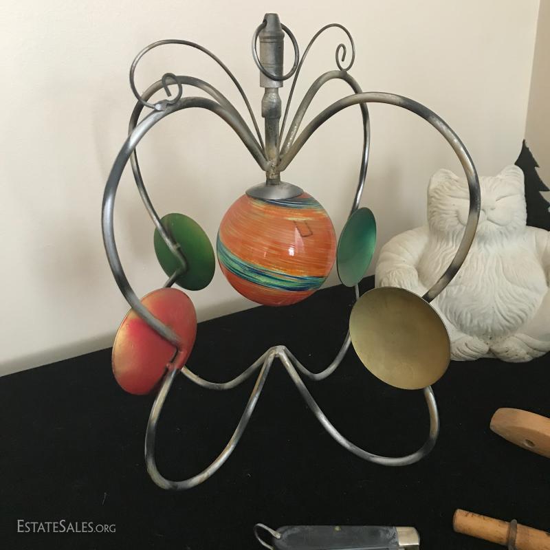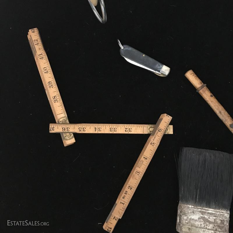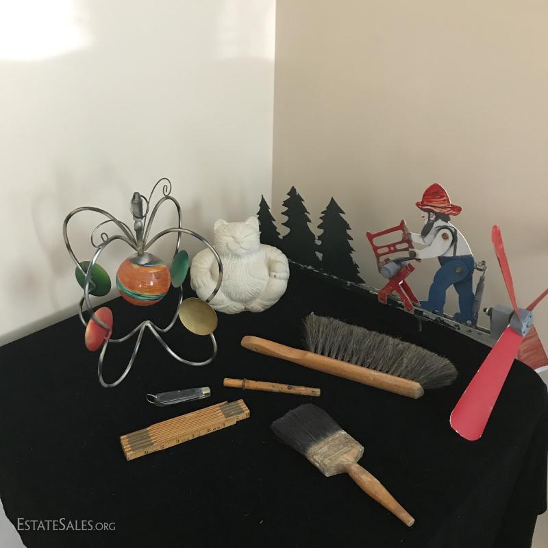 Hand made whirly gig of lumberjack. Needs stand or post. Buddha cat made from concrete, glass ball and metal whirly gig looks like a butterfly. Can be hung. Vintage tools including folding ruler, thermometer in wood case, pocket knife, dust brush, and paint brush. This lot is available for shipping or local pick up in Mills, River, NC.