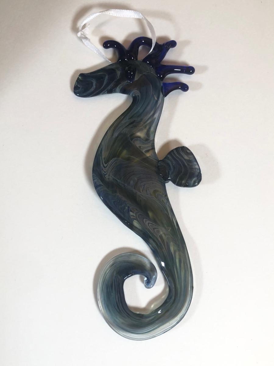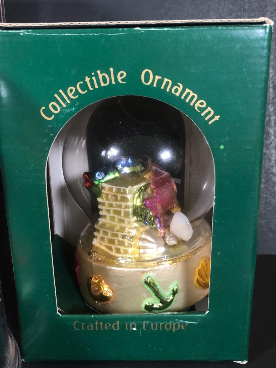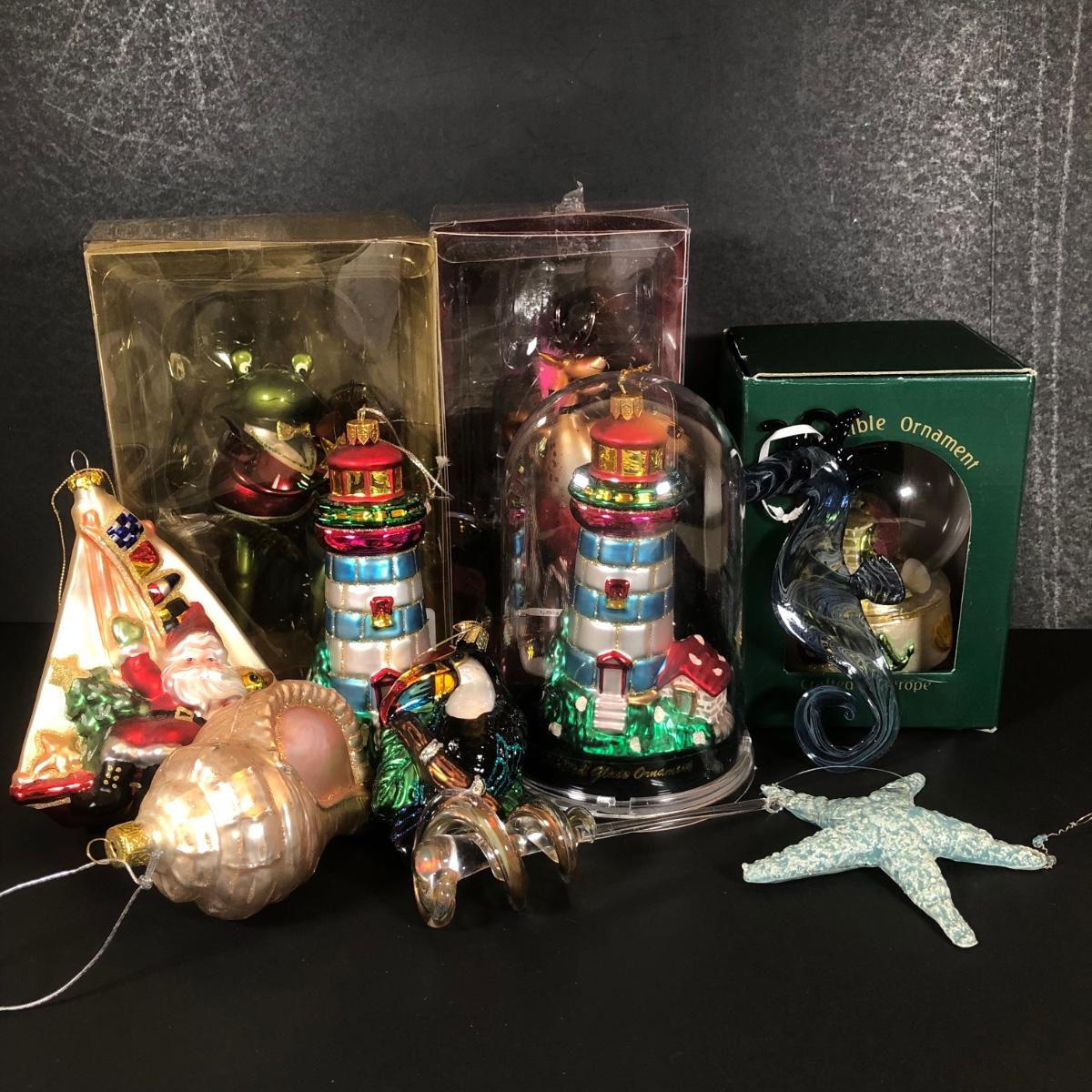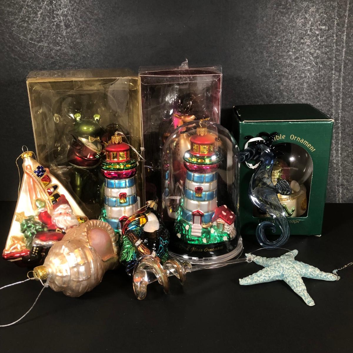 LOT 41: Collection of Aquatic Themed Christmas Ornaments - Signed Ceramic Starfish, Hand Blown Glass Seahorse, Department 56 Glass Dressed Frog & More