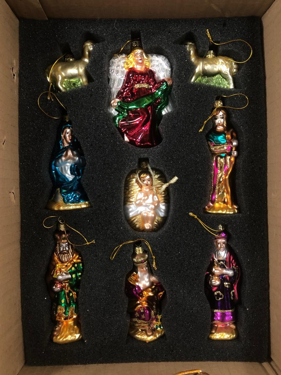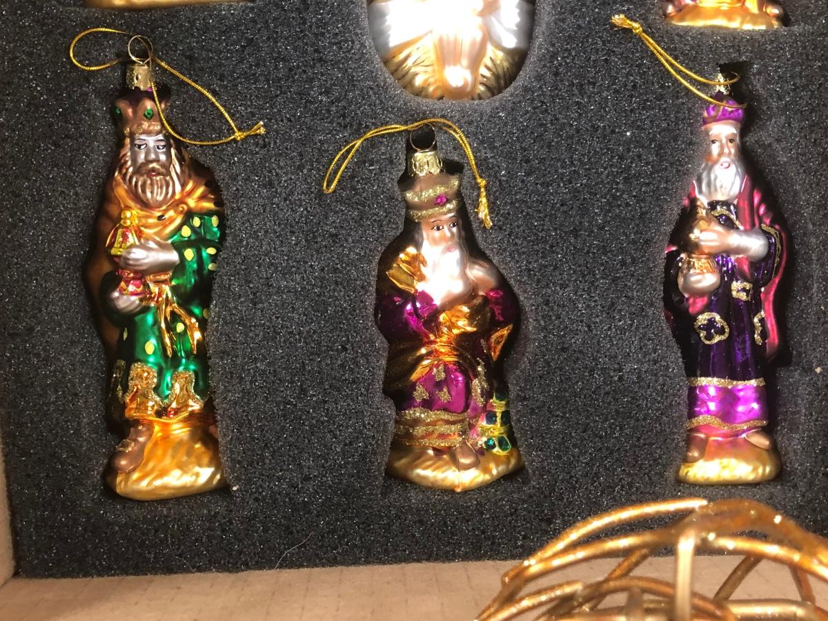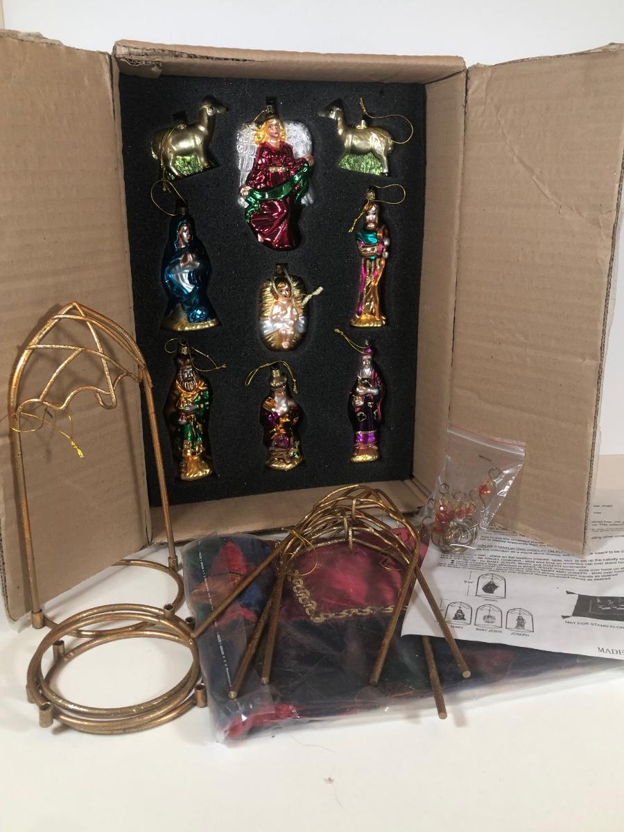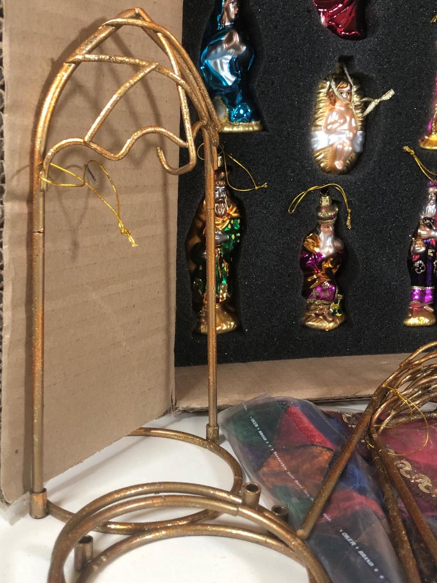 LOT 42: Glass Ornament Nativity Figures w/ Metal Display Arches & Mat