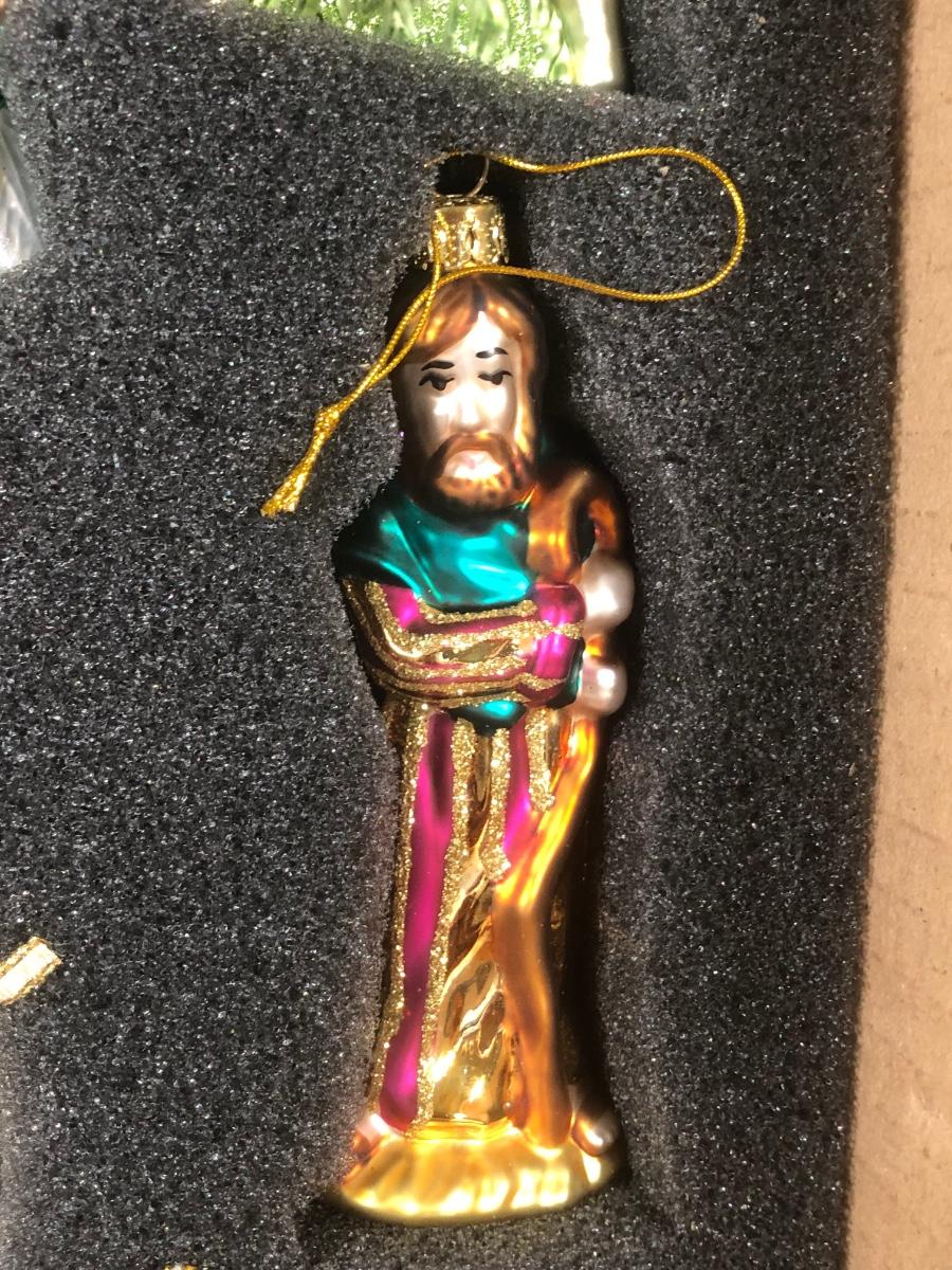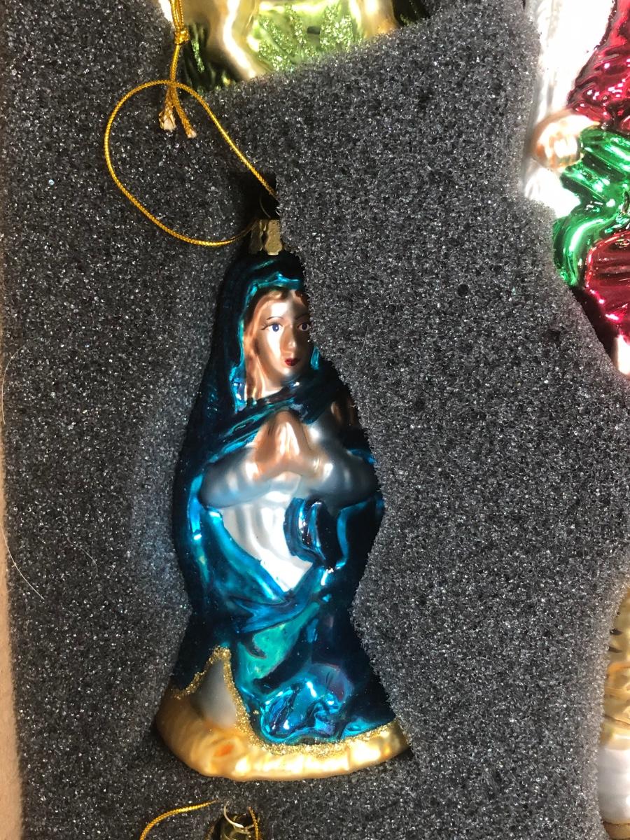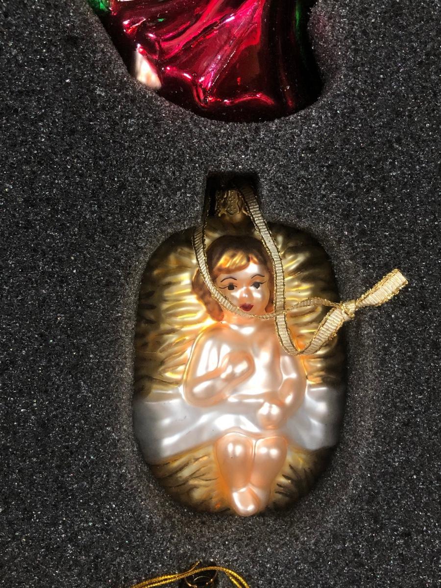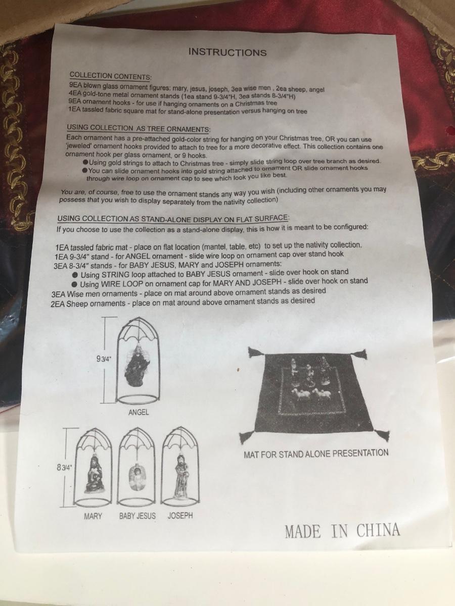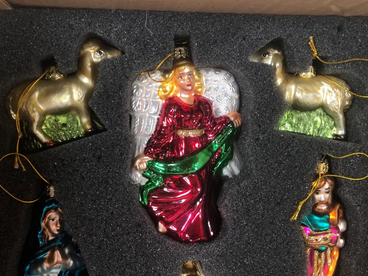 LOT 42: Glass Ornament Nativity Figures w/ Metal Display Arches & Mat
