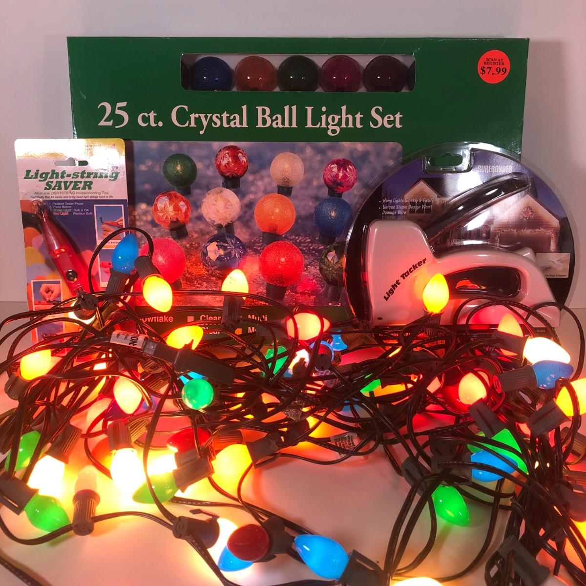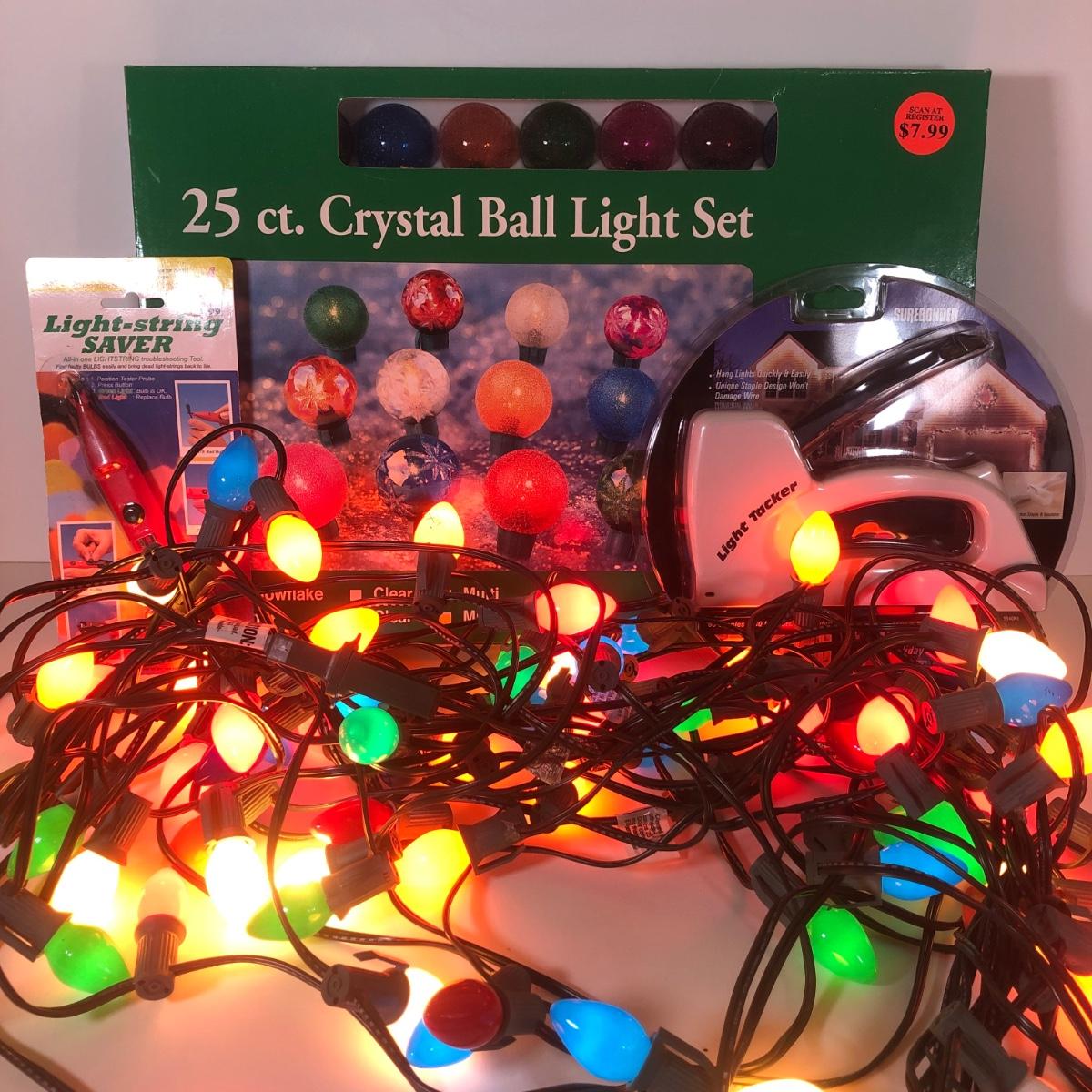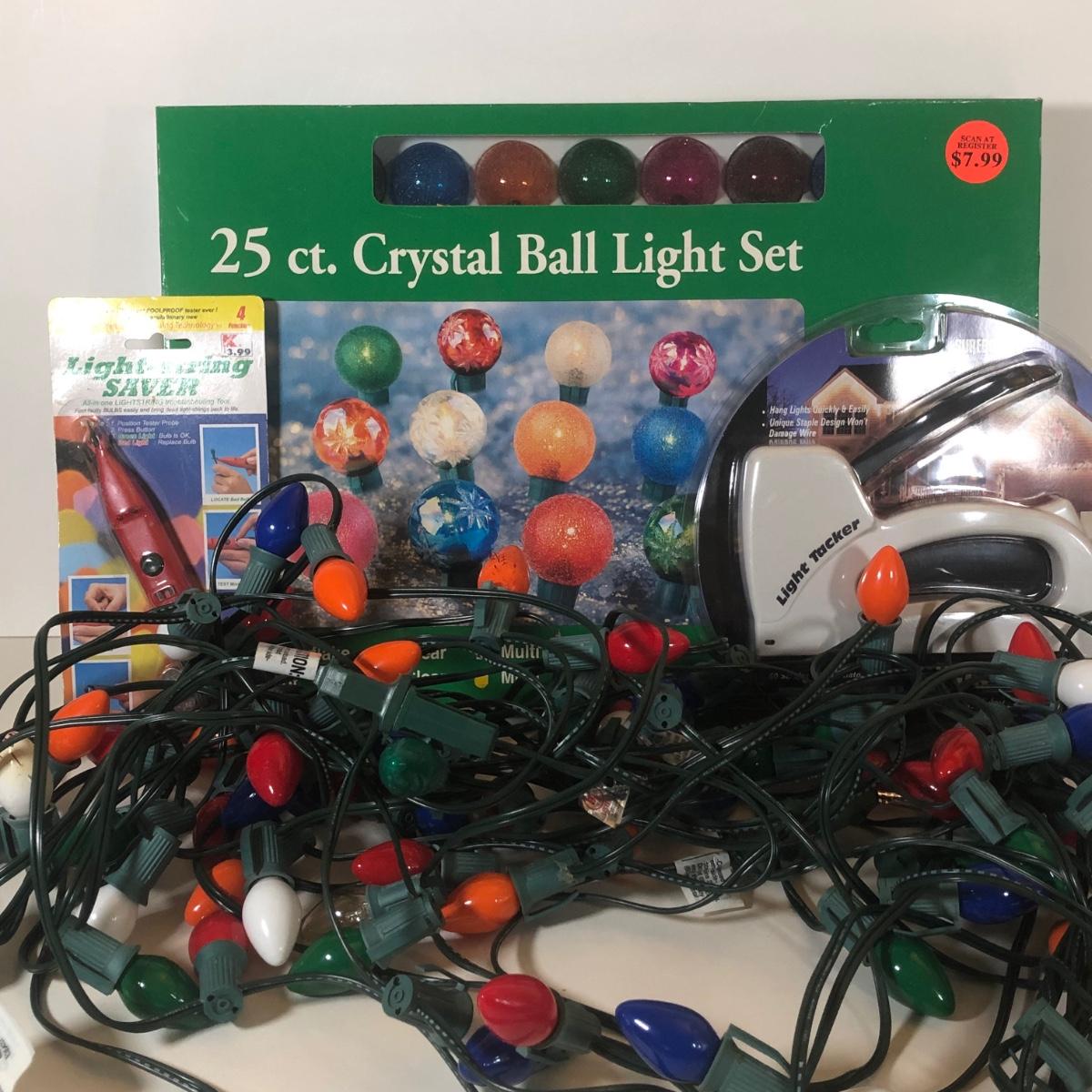 LOT 43: Three Strands of Multi-Color Big Bulb Holiday Lights, NIB Crystal Ball Light Set, Green Extension Cord w/ On/Off Button & More