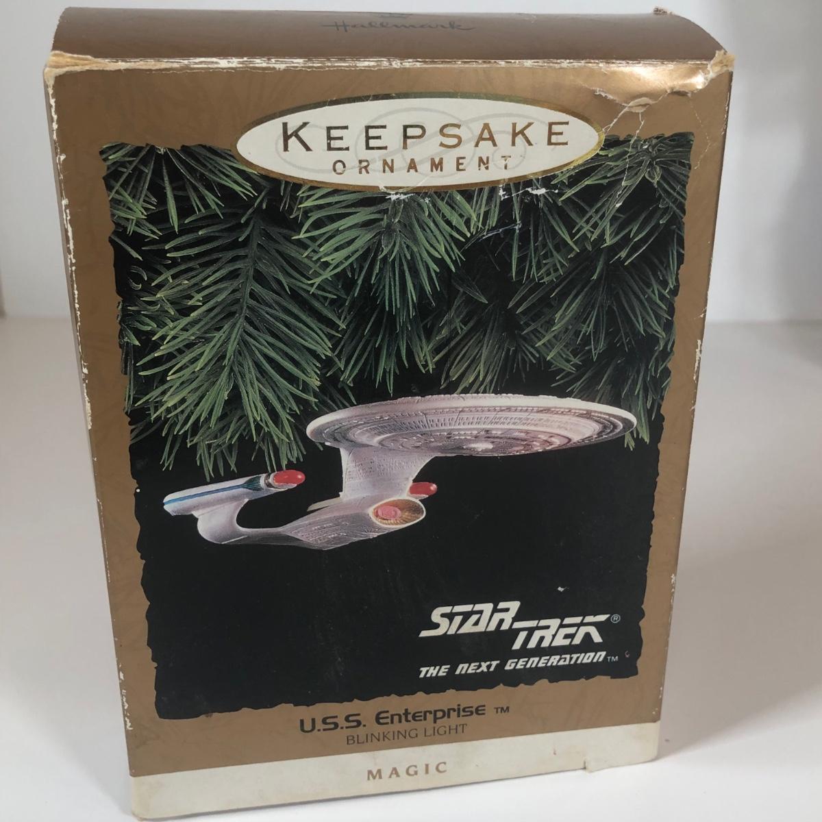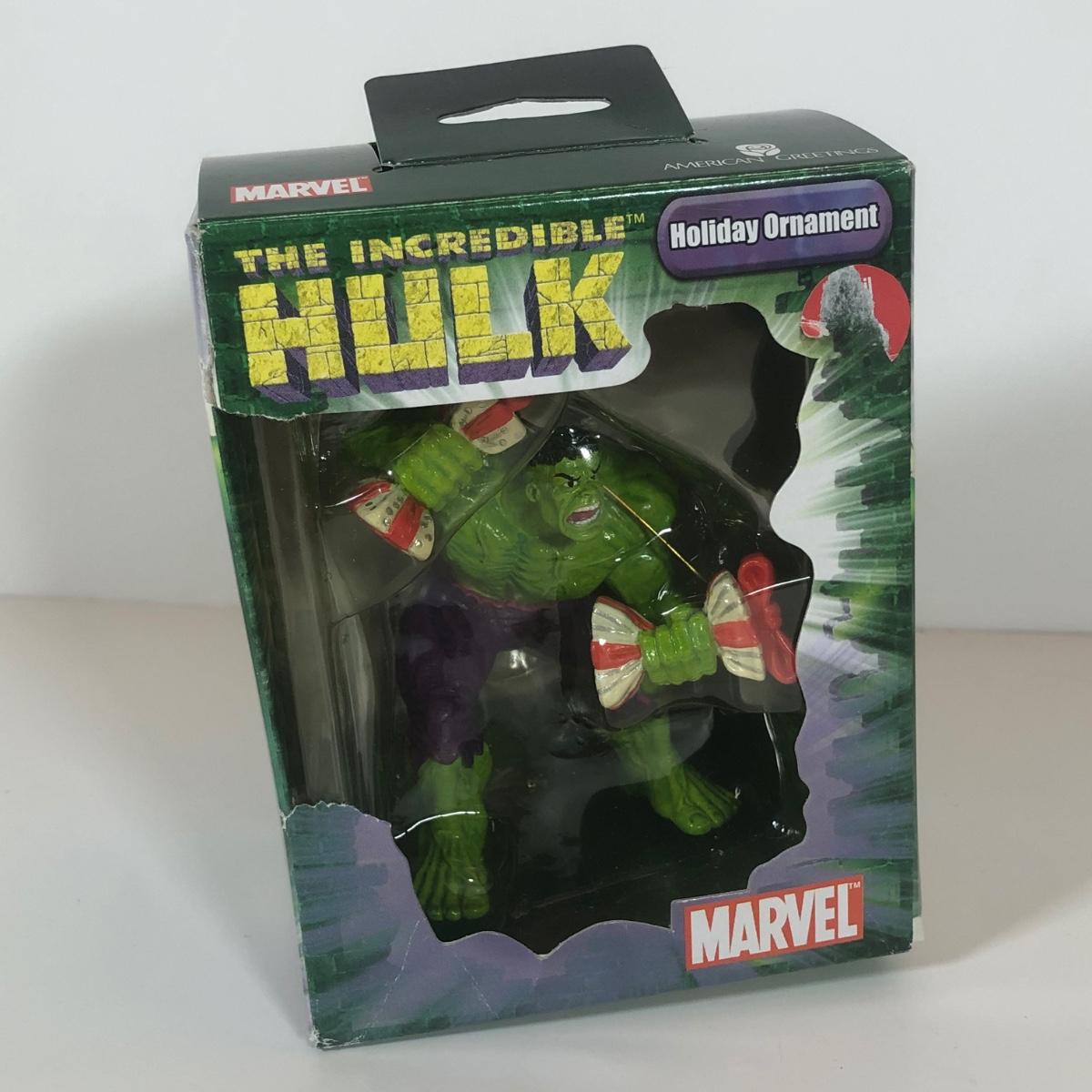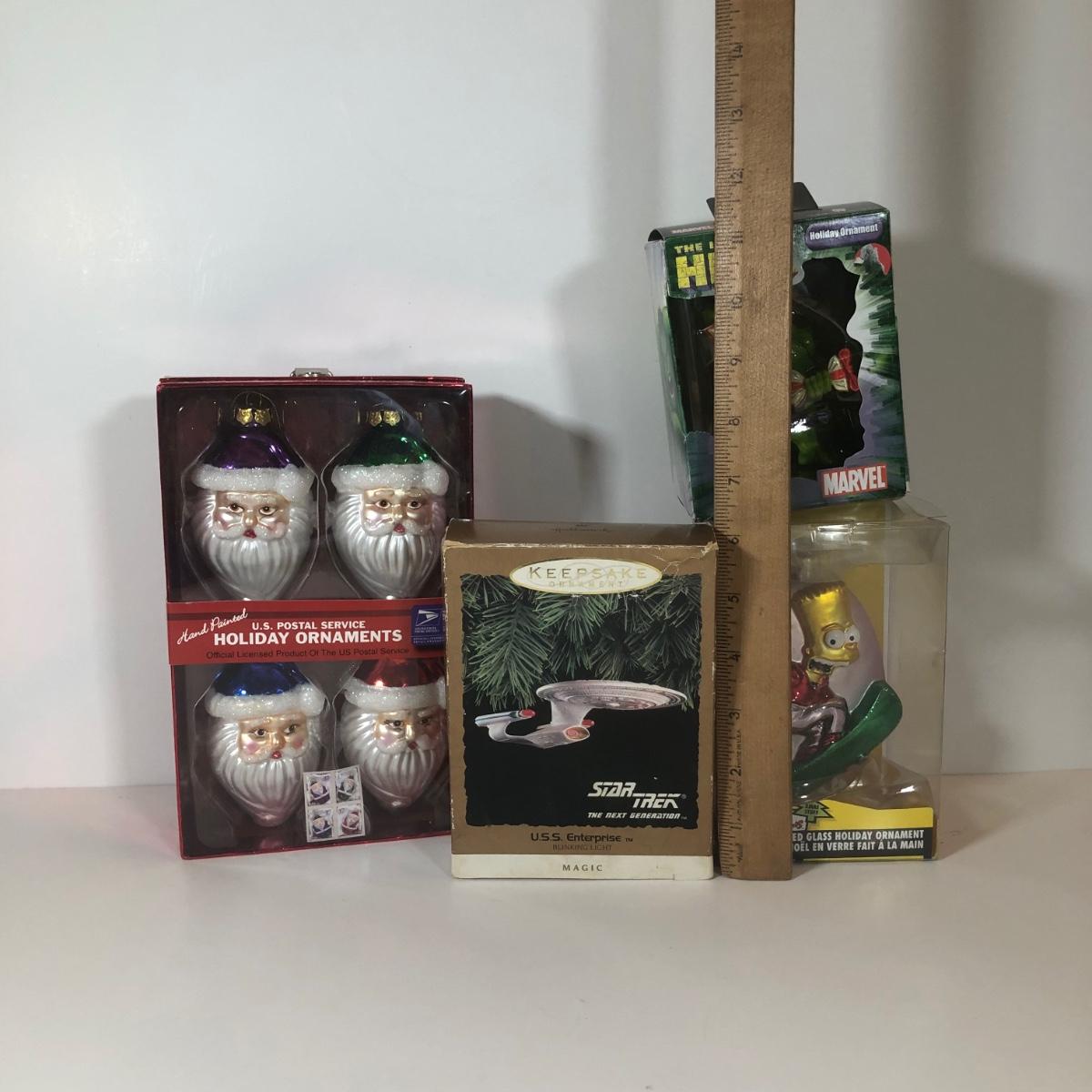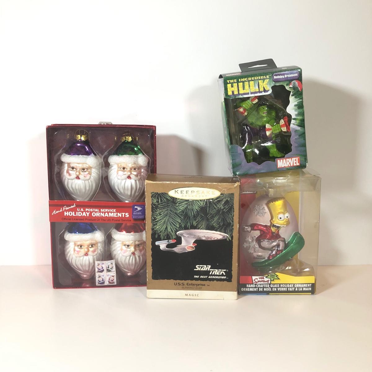 LOT 48: Collectible Christmas Ornaments in Boxes - Hallmark Keepsake Star Trek TNG USS Enterprise, Kurt S Adler Bart Simpson, American Greetings Marvel Hulk & Hand Painted USPS 4-Pack