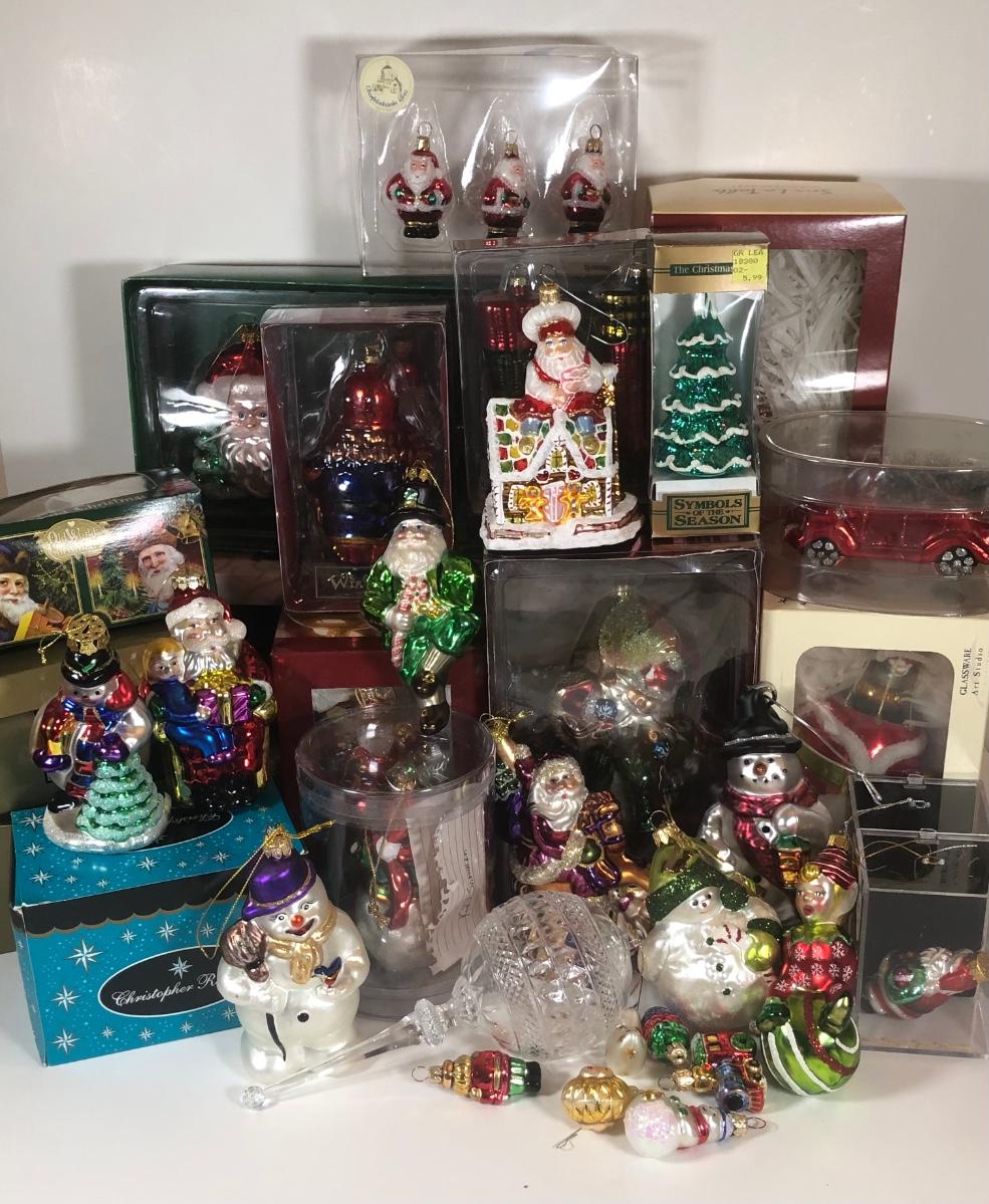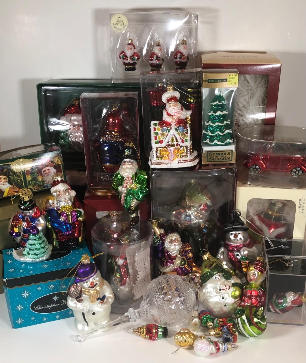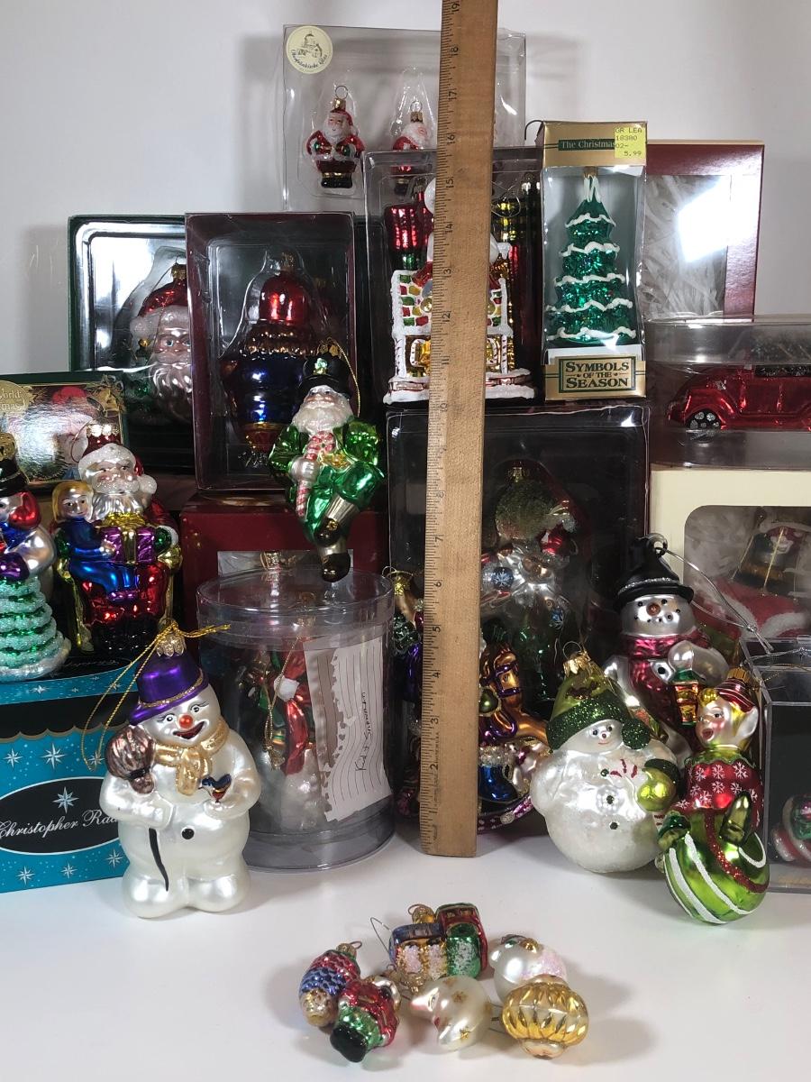 LOT 49: Large Collection of Glass Christmas Ornaments - Some w/ Boxes - Sur la Table, Golden Grandeur, Polonaise Collection by Komozja Cowardly Lion, Christopher Radko & More