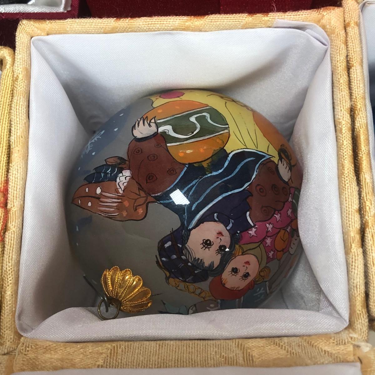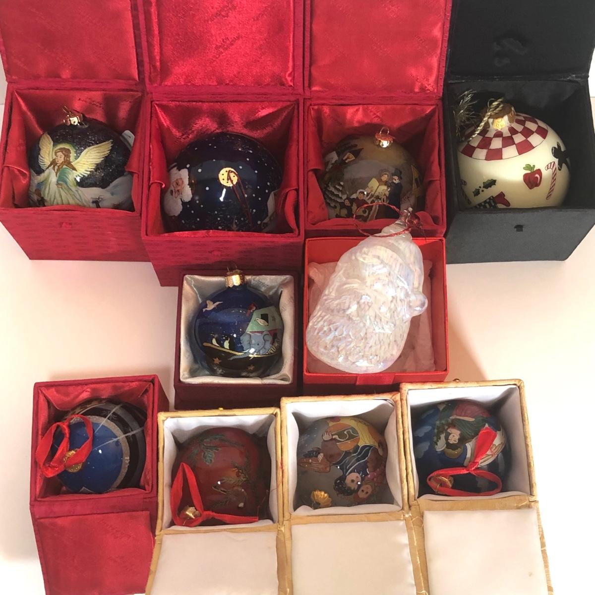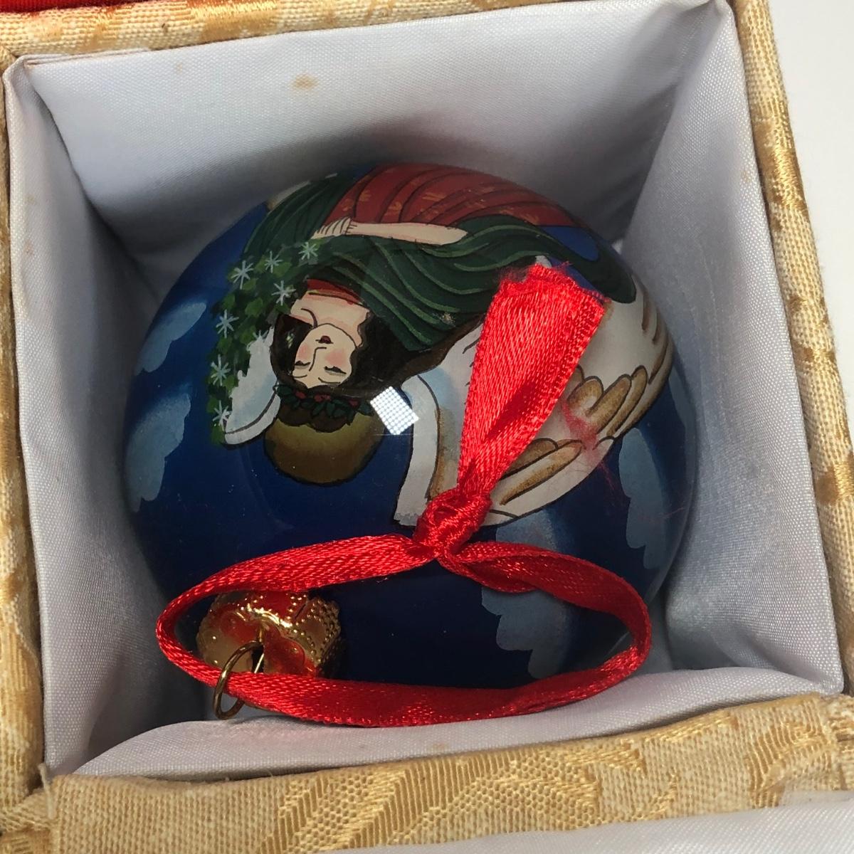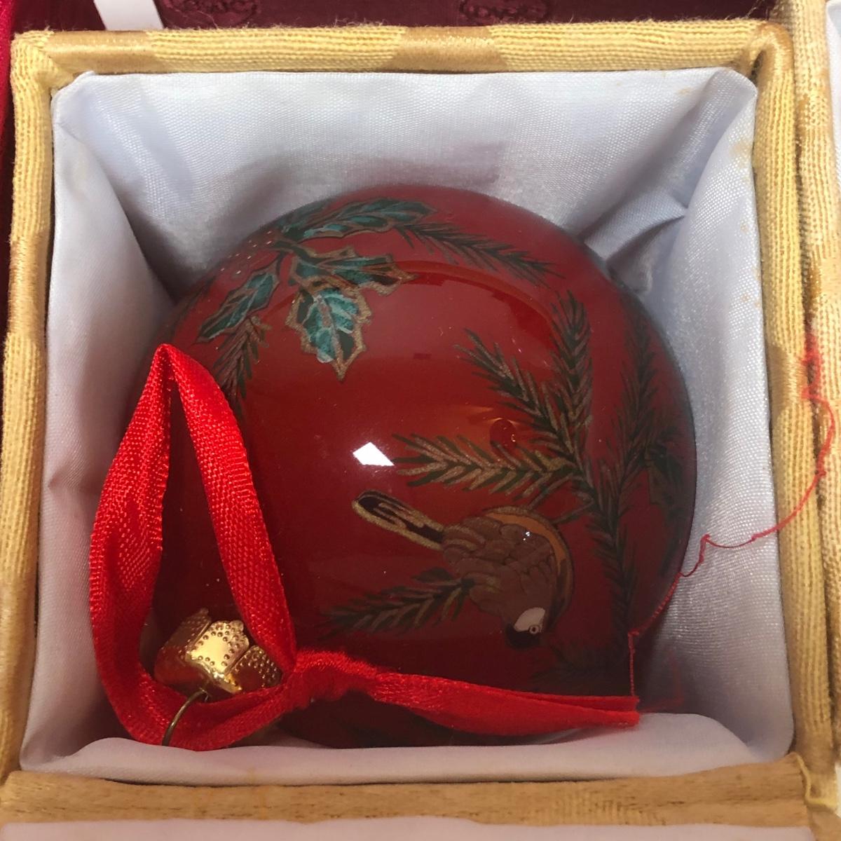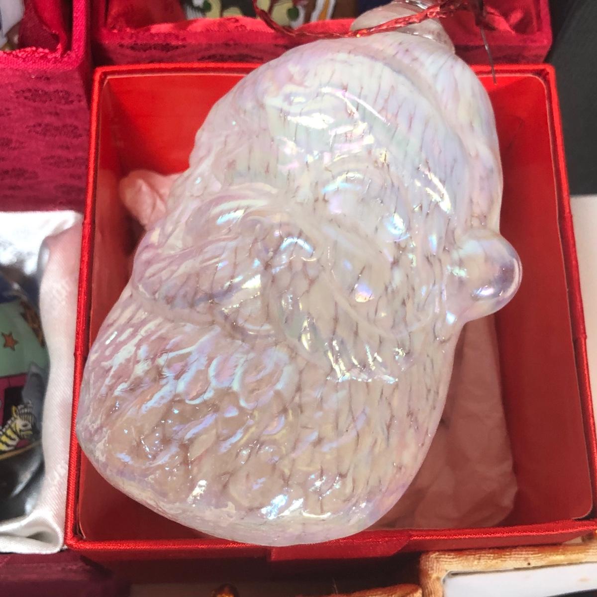 LOT 50: Frosted Glass Santa Head Ornament w/ Collection of Hand Painted Glass Ball Ornaments w/ Cushioned Boxes