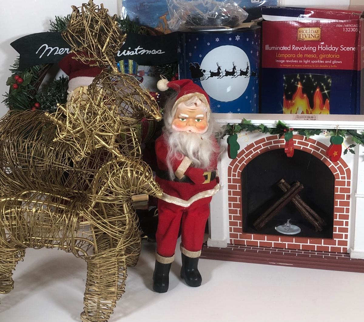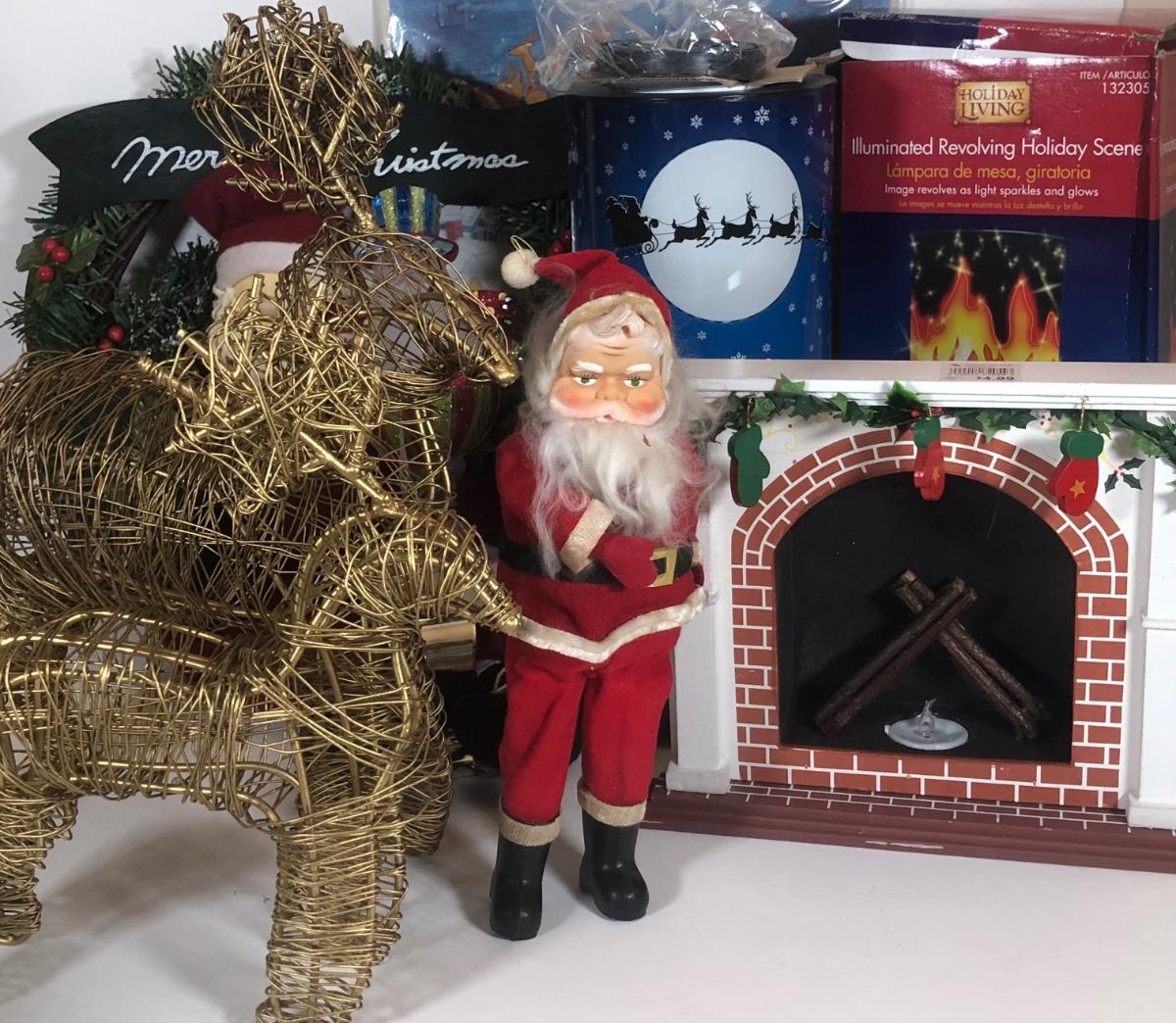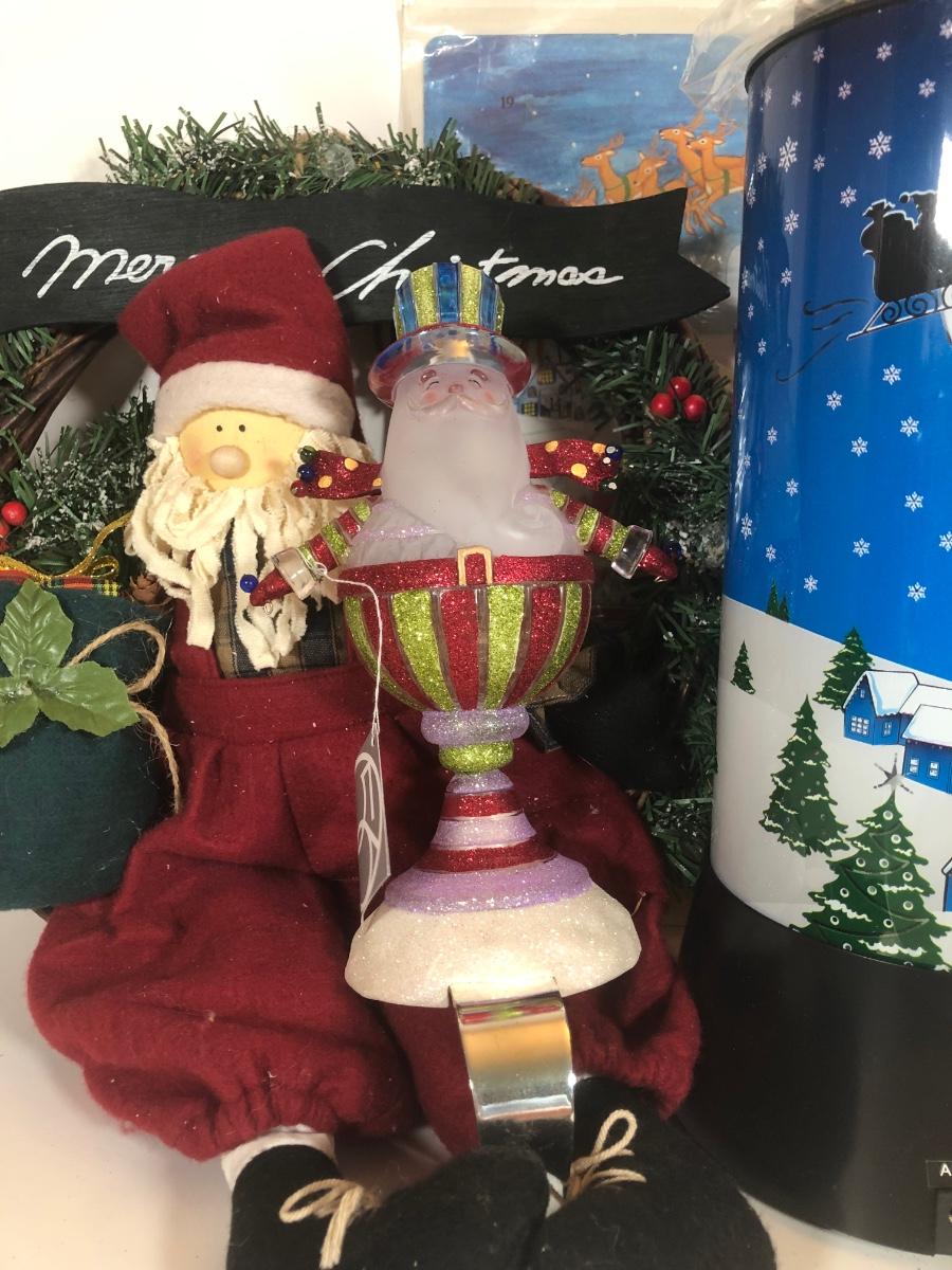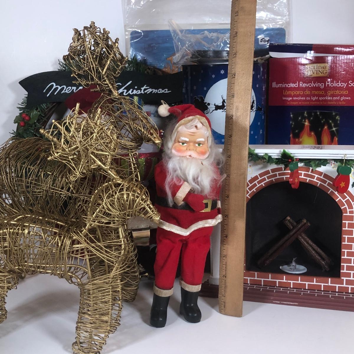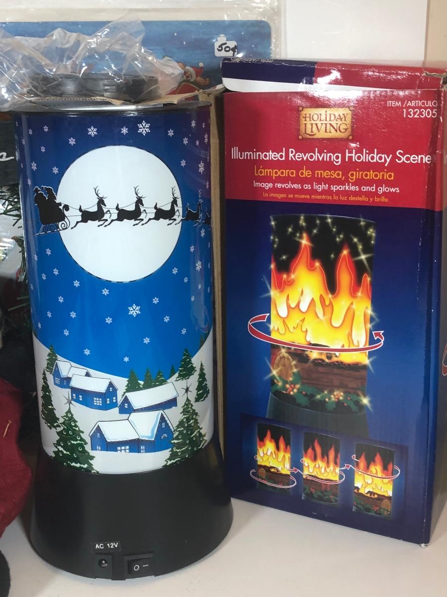 LOT 52: Christmas Decor Collection - Vintage Santa Figure, Department 56 Glass Stocking Holder, Illuminated Revolving Holiday Scene Lamps & More