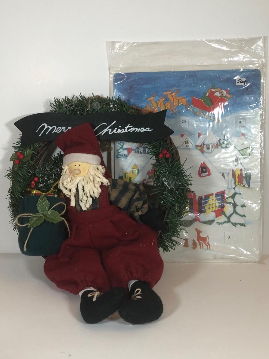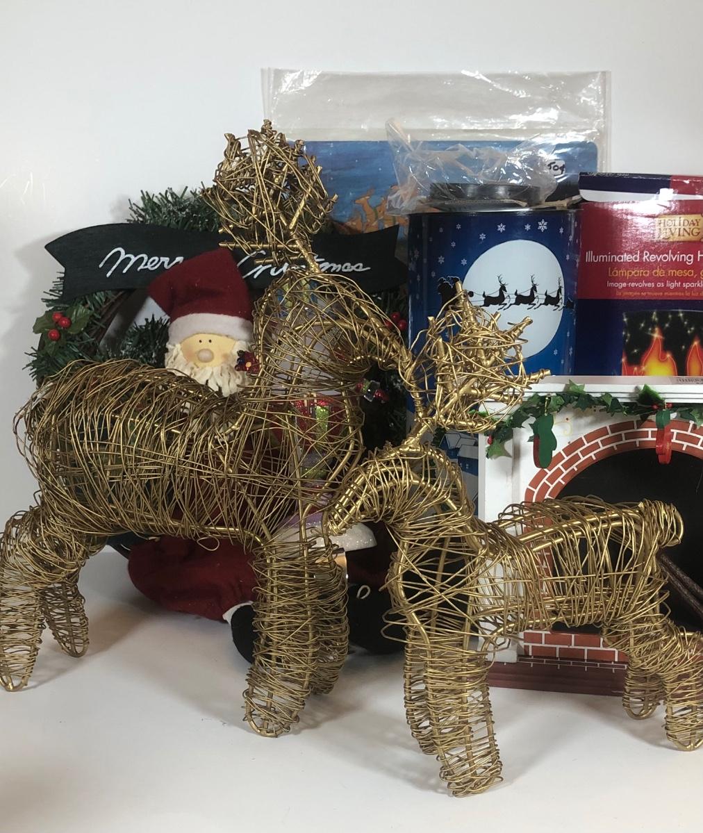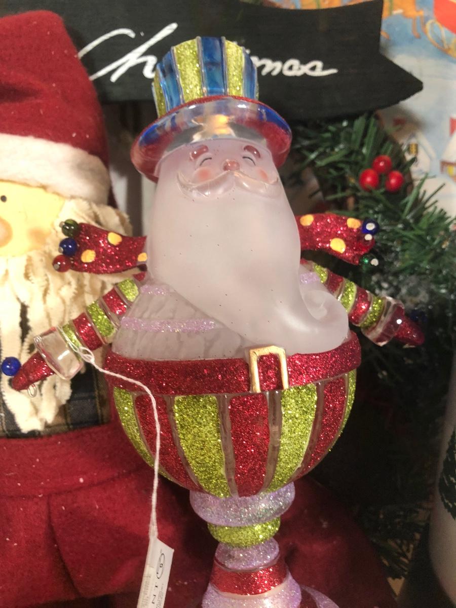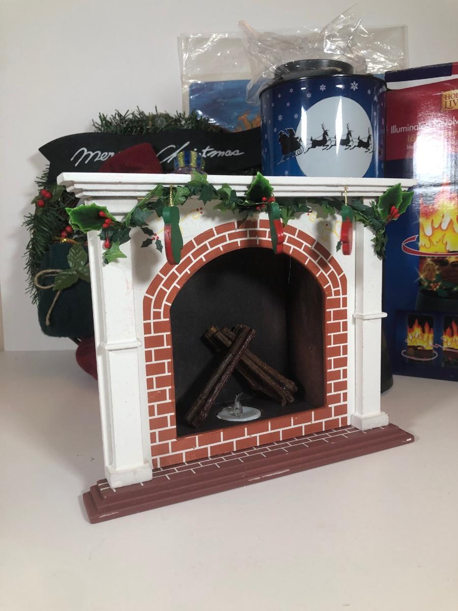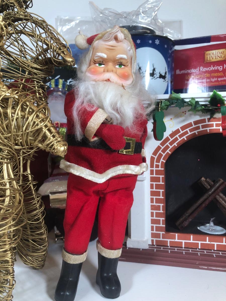 LOT 52: Christmas Decor Collection - Vintage Santa Figure, Department 56 Glass Stocking Holder, Illuminated Revolving Holiday Scene Lamps & More