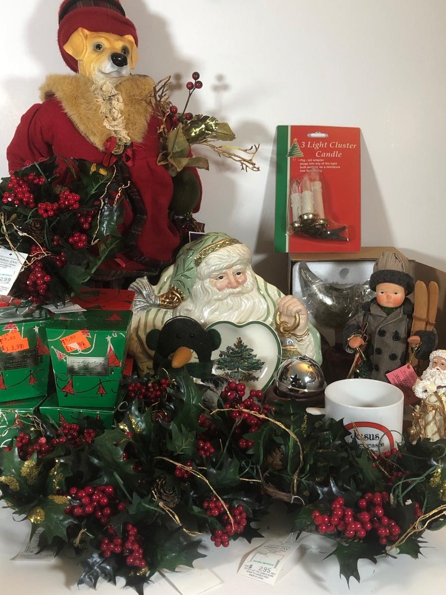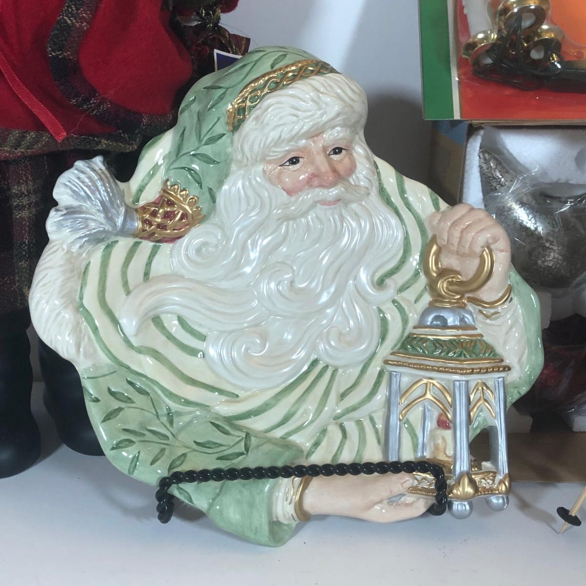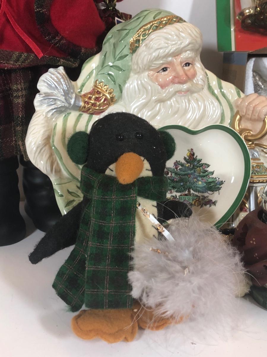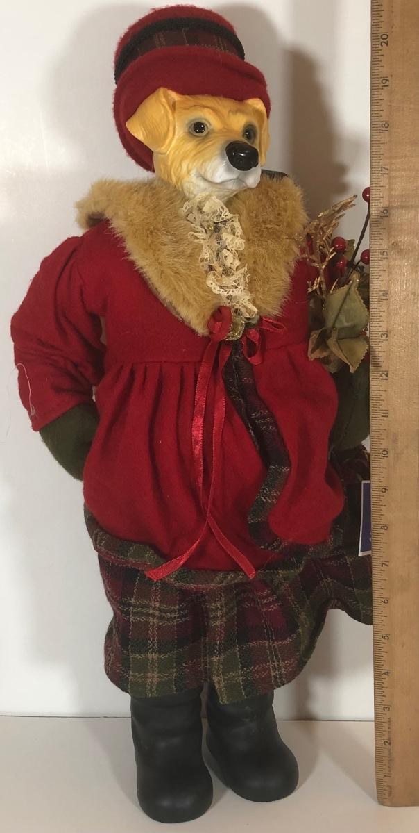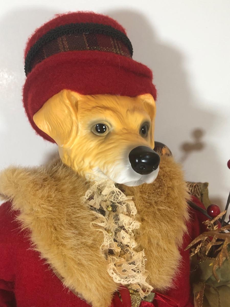 LOT 53: Christmas Collection - Tall Fancy Dog Caroller, Fitz & Floyd Santa Cookie Plate, Spode Christmas Tree Trinket Dish, Winter Wonderland Collectible Porcelain Doll & More