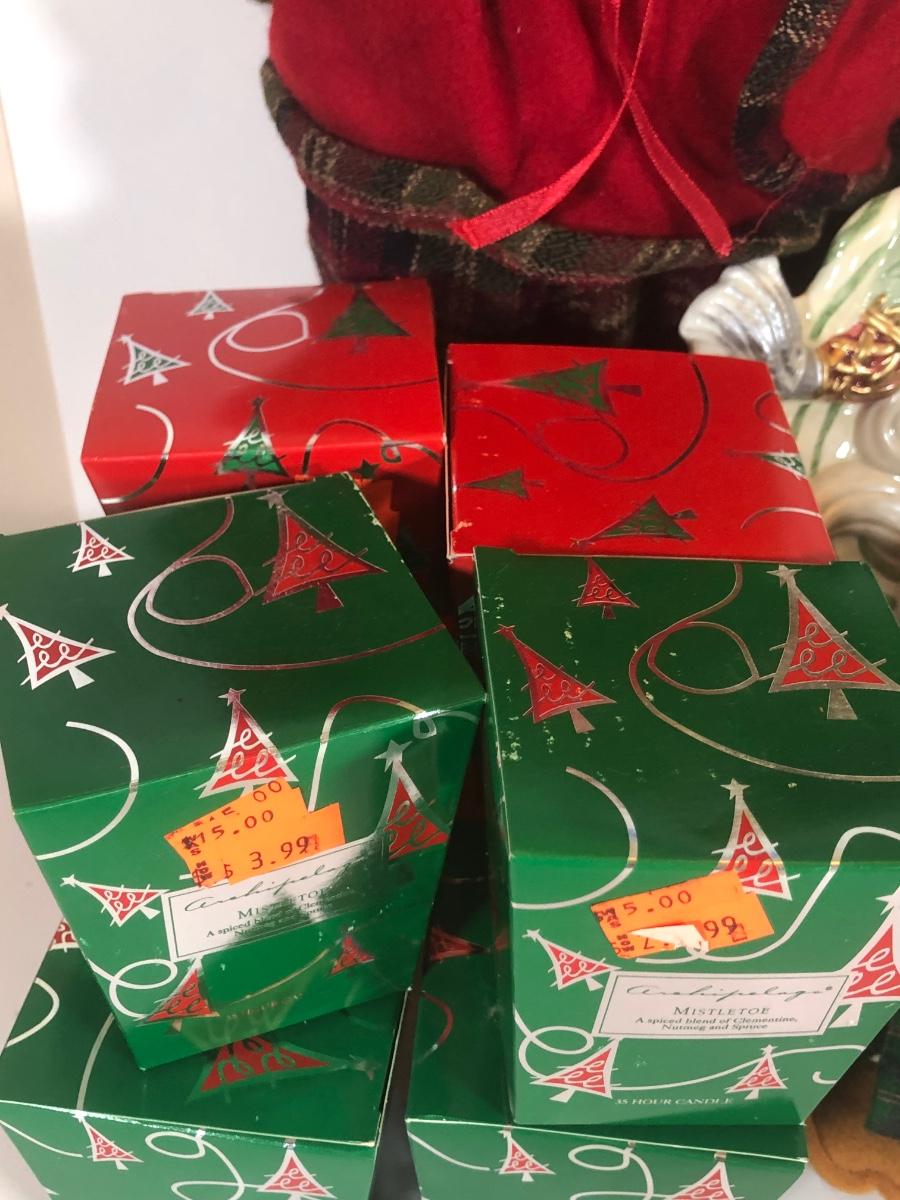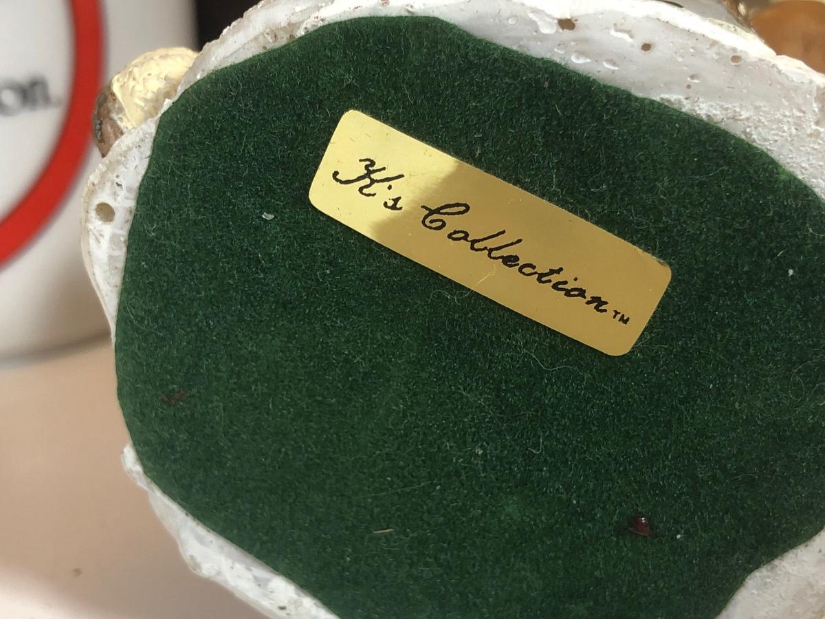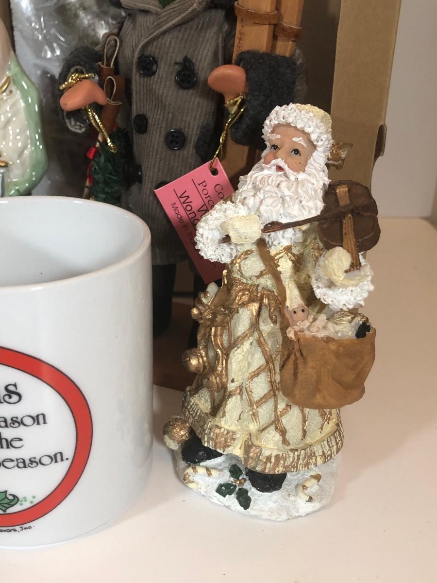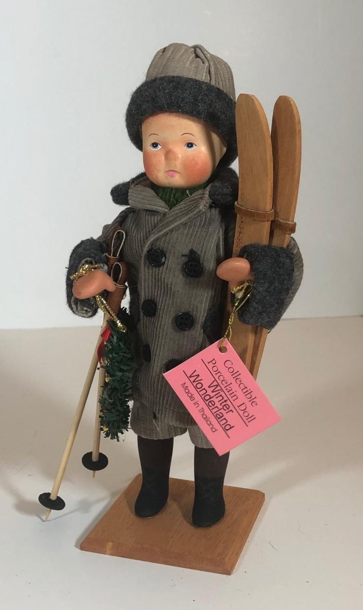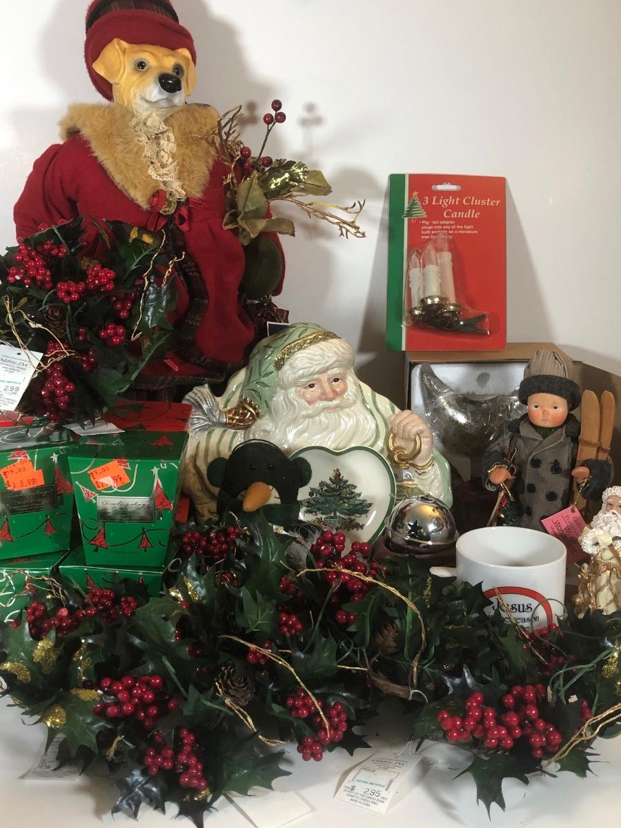 LOT 53: Christmas Collection - Tall Fancy Dog Caroller, Fitz & Floyd Santa Cookie Plate, Spode Christmas Tree Trinket Dish, Winter Wonderland Collectible Porcelain Doll & More