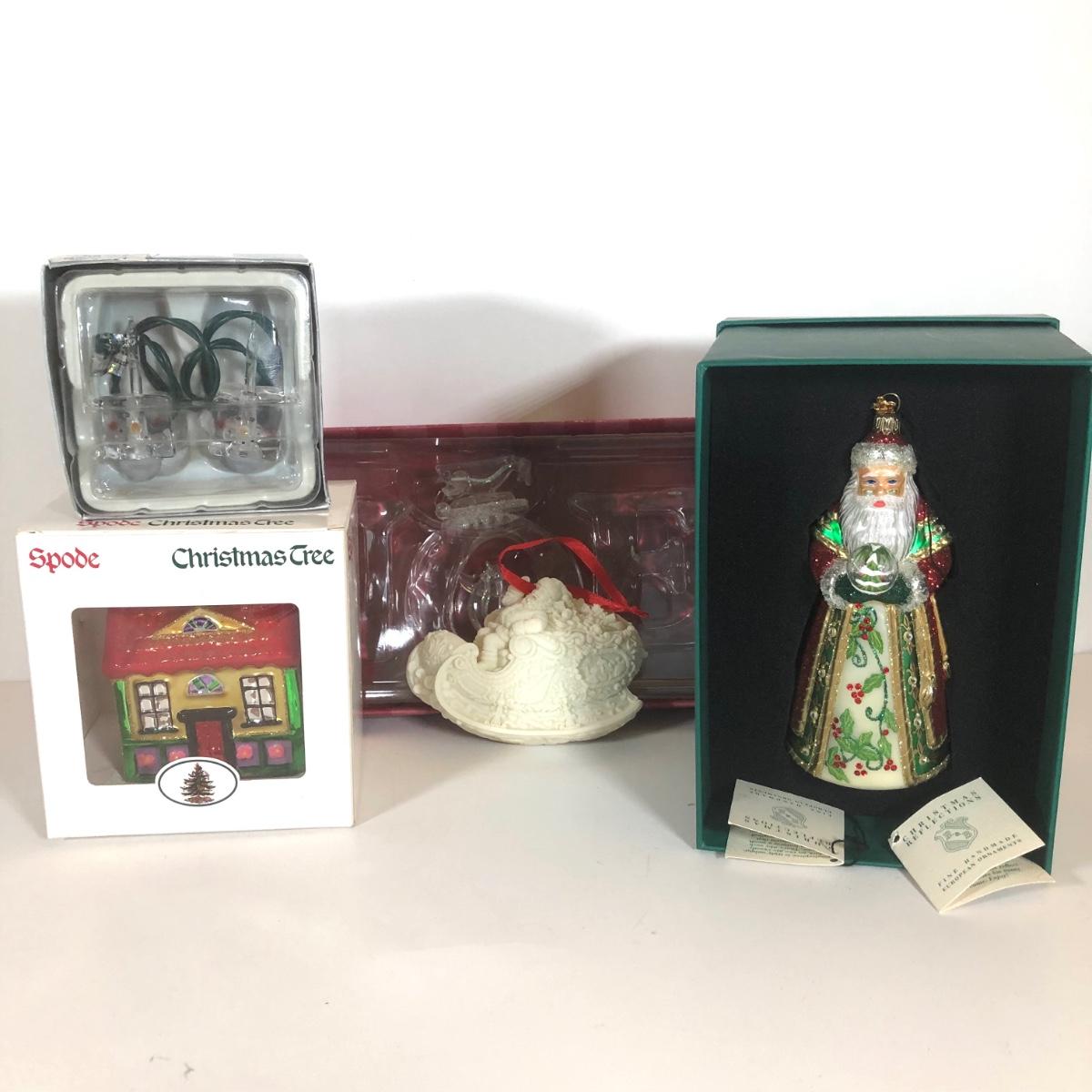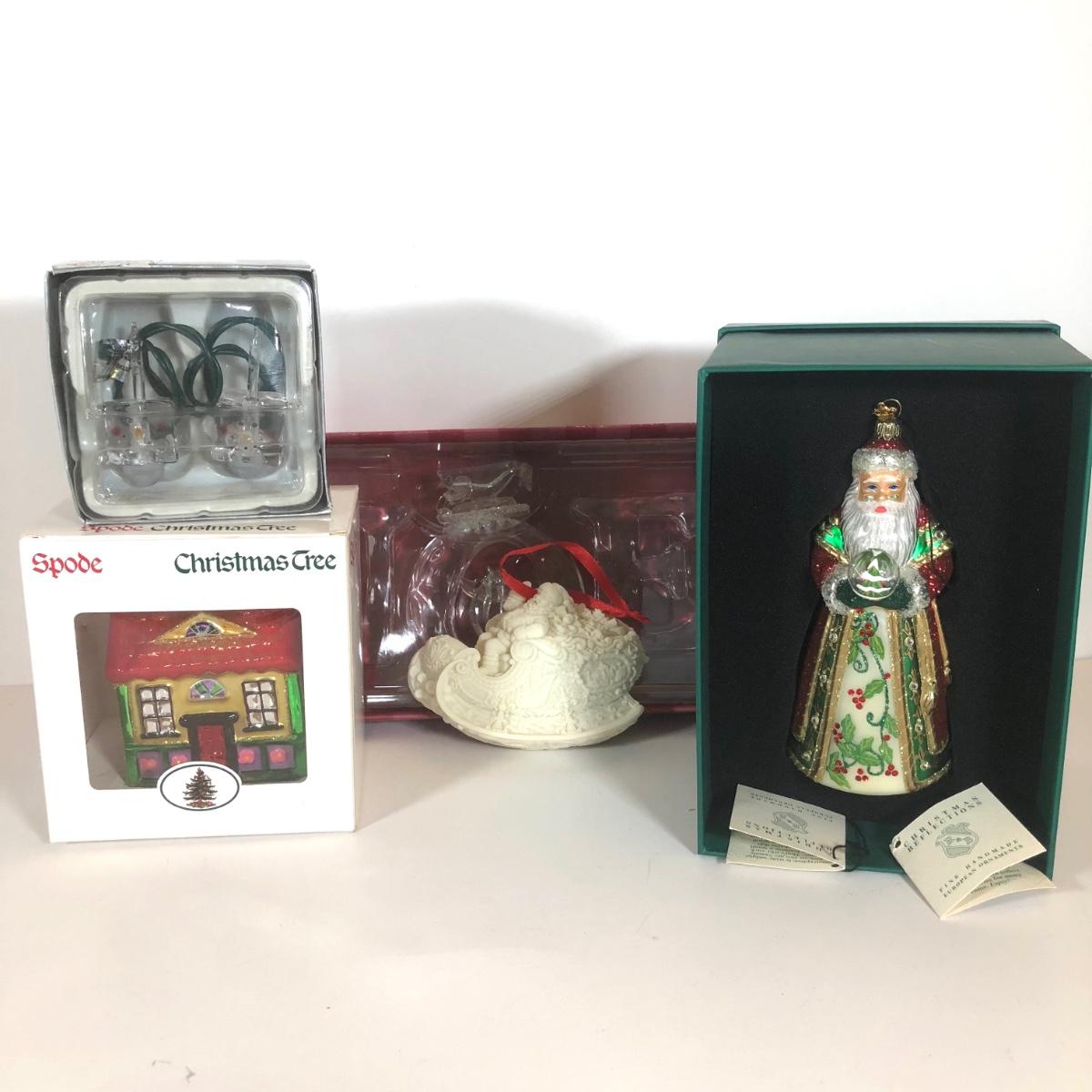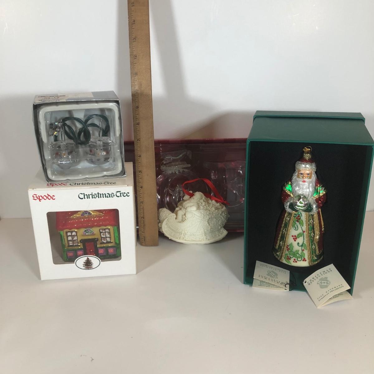 LOT 58: Numbered Porcelain Double Sided Christmas Ornament, Christmas Reflections Handmade Glass Santa w/ Box, Department 56, Spode Christmas Tree House Ornament w/ Box & More
