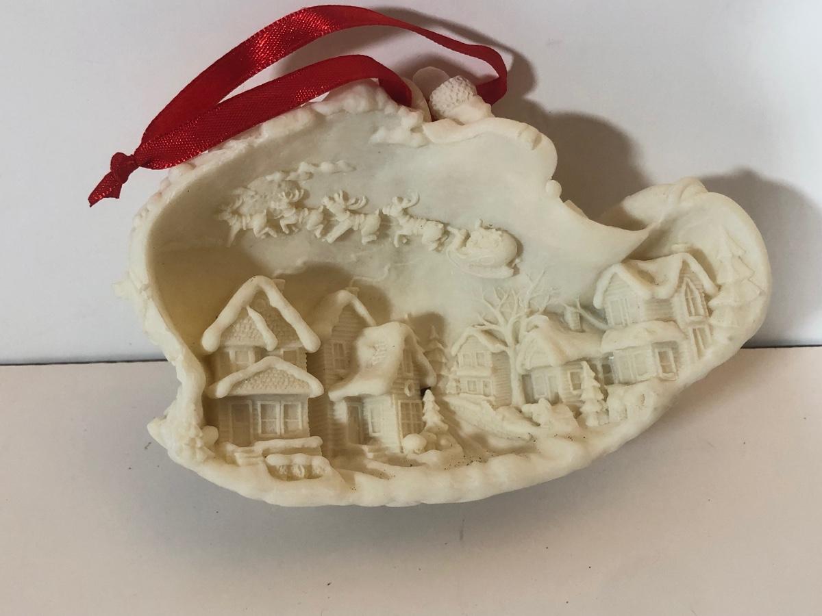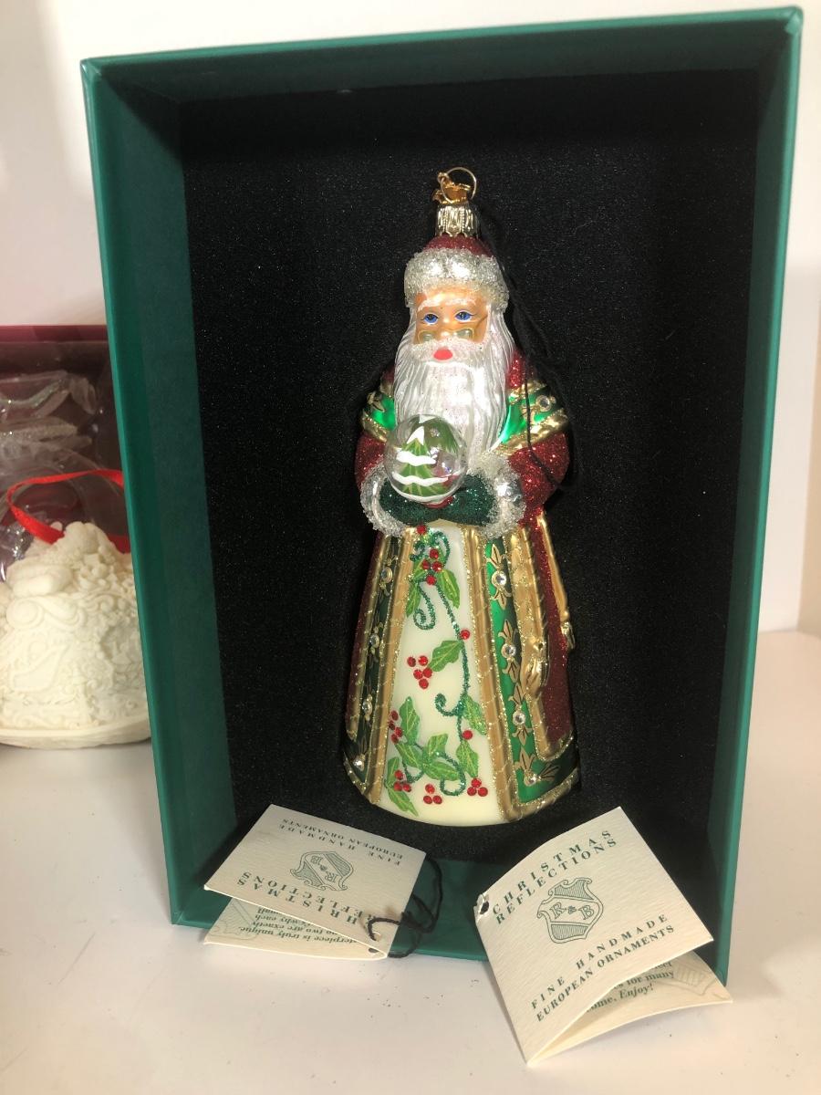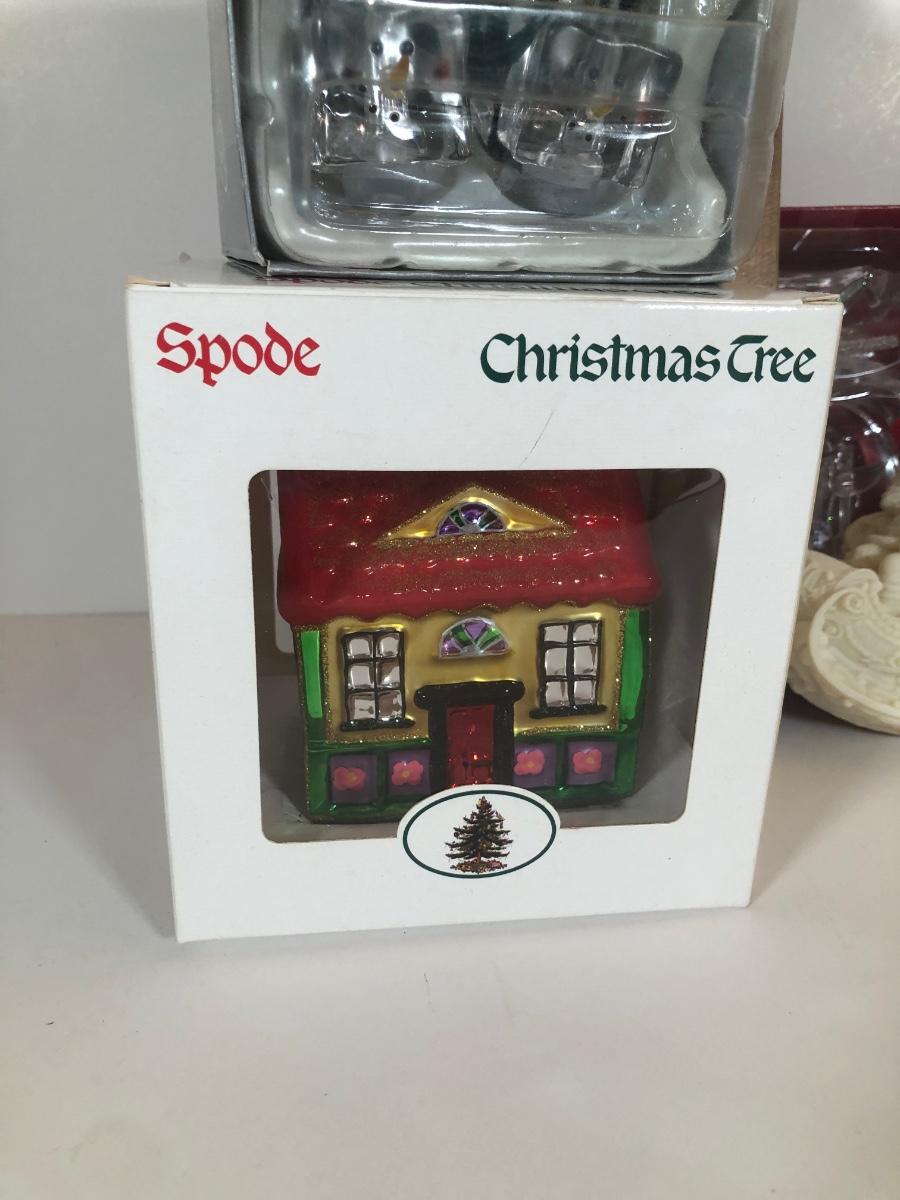 LOT 58: Numbered Porcelain Double Sided Christmas Ornament, Christmas Reflections Handmade Glass Santa w/ Box, Department 56, Spode Christmas Tree House Ornament w/ Box & More