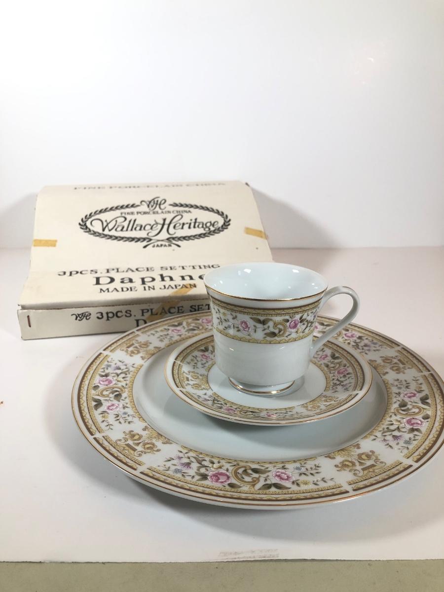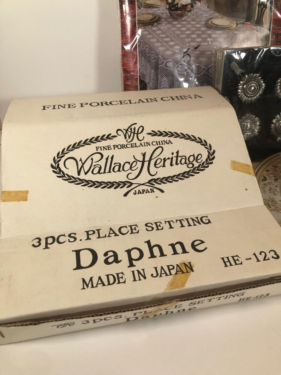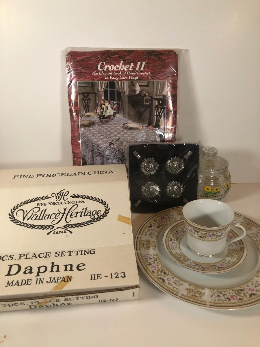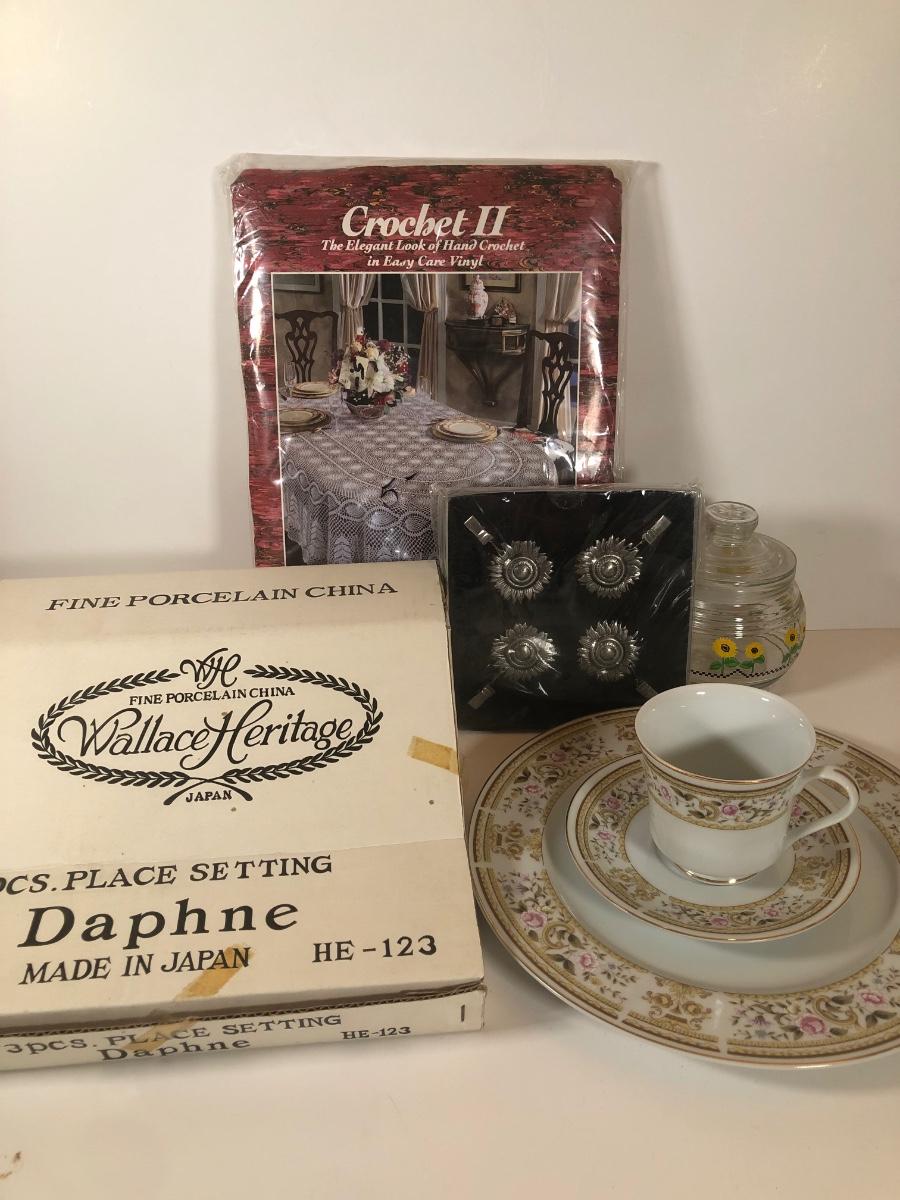 LOT 63: Two Wallace Heritage Daphne China 4pc Place Settings in Boxes, NIP Crochet II Vinyl Table Cover & More