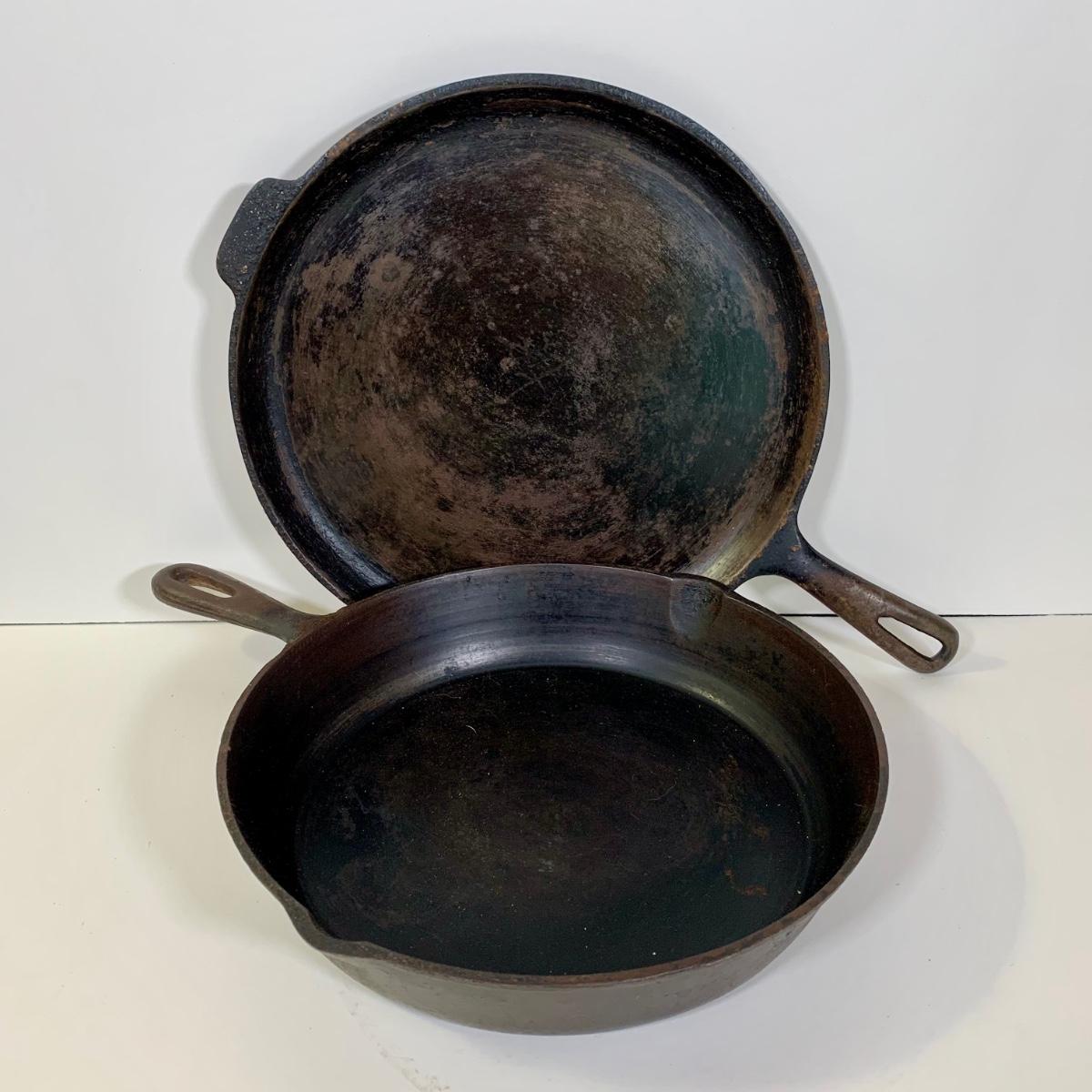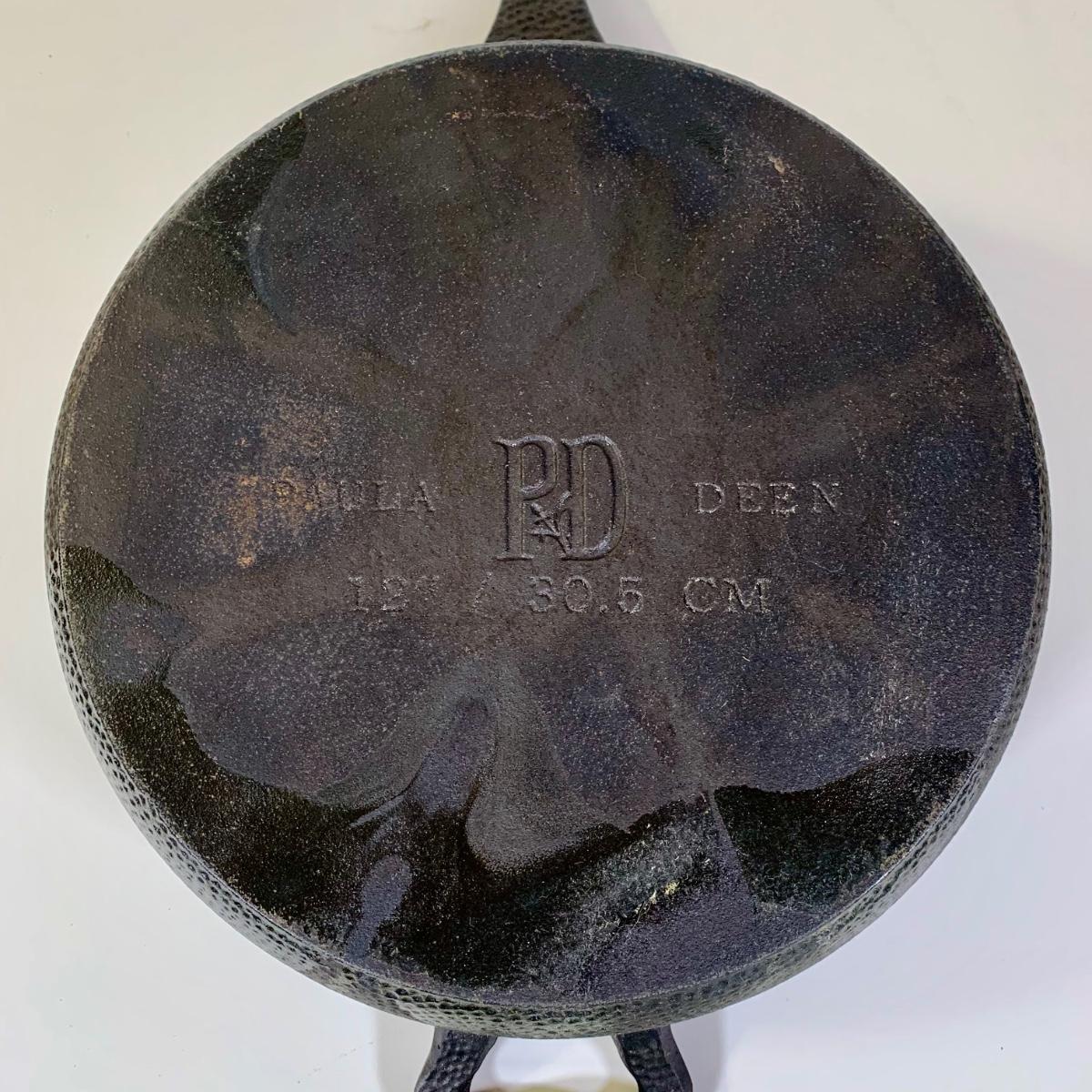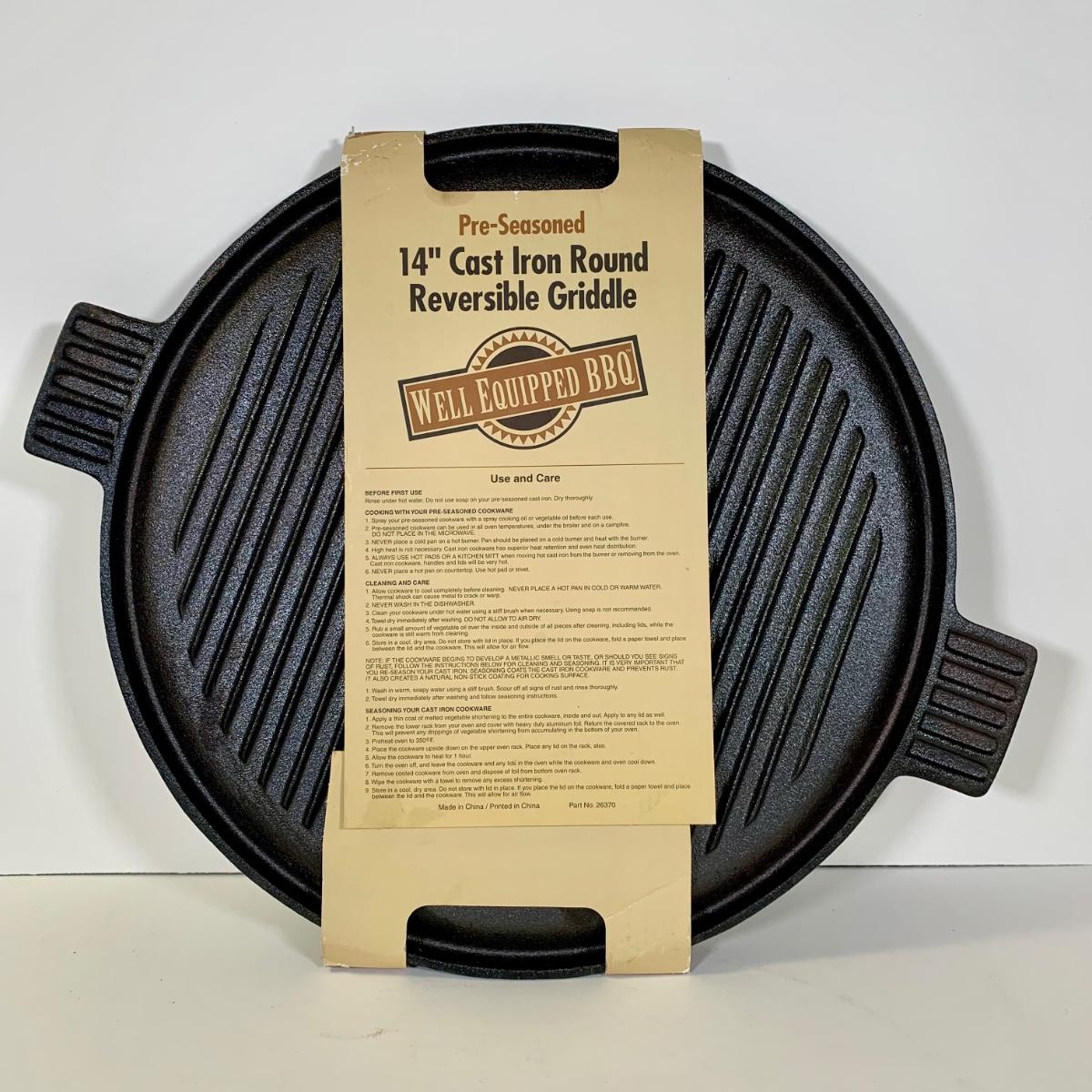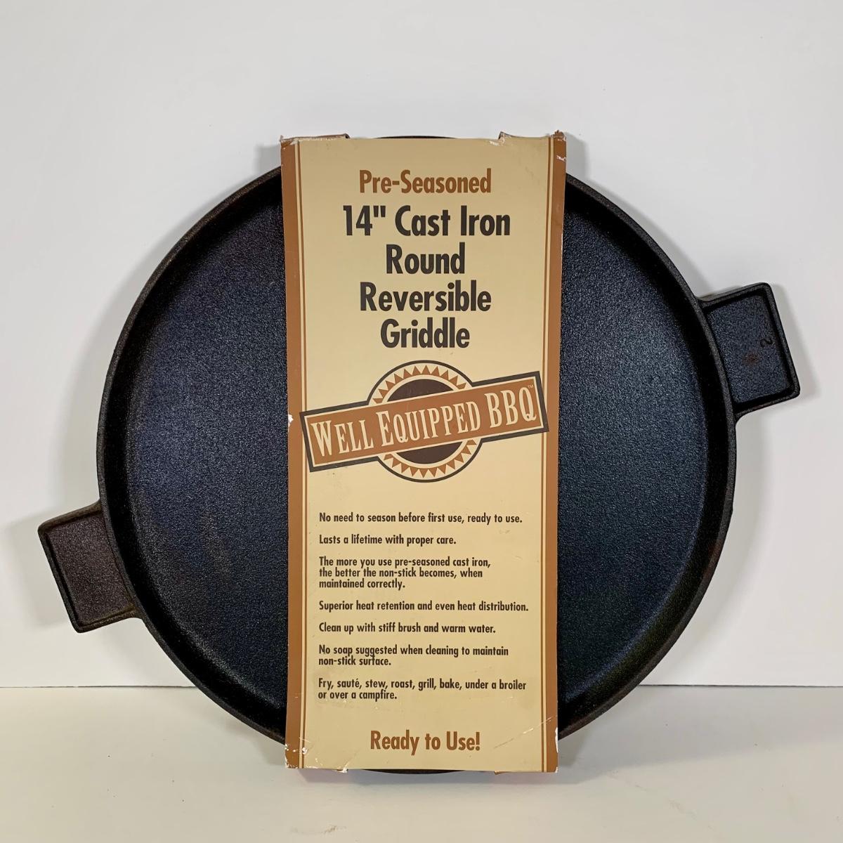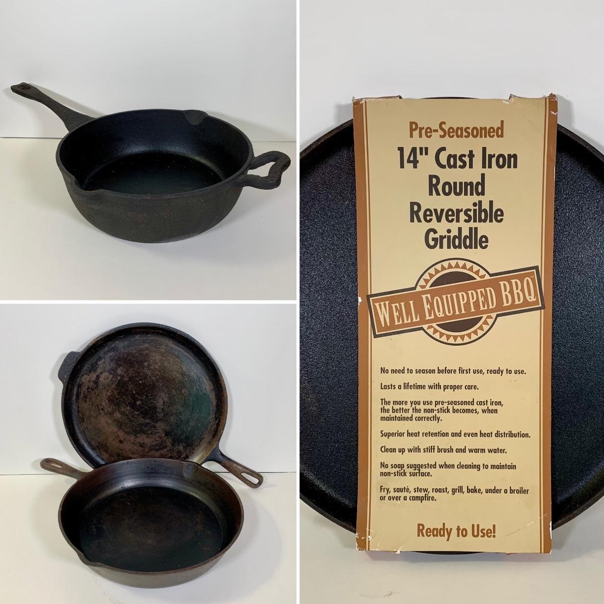 LOT 82: Cast Iron Collection: Paula Deen 12" Deep Dish Skillet, Well Equipped BBQ 14" Reversible Griddle, 10.5" Skillet, & 11" Griddle