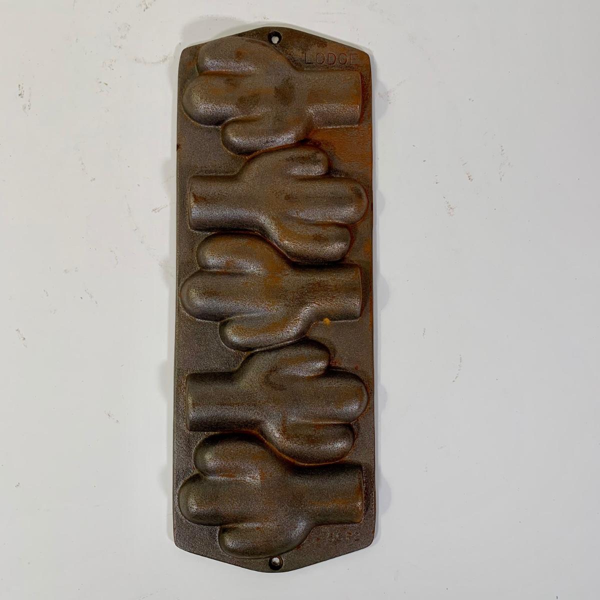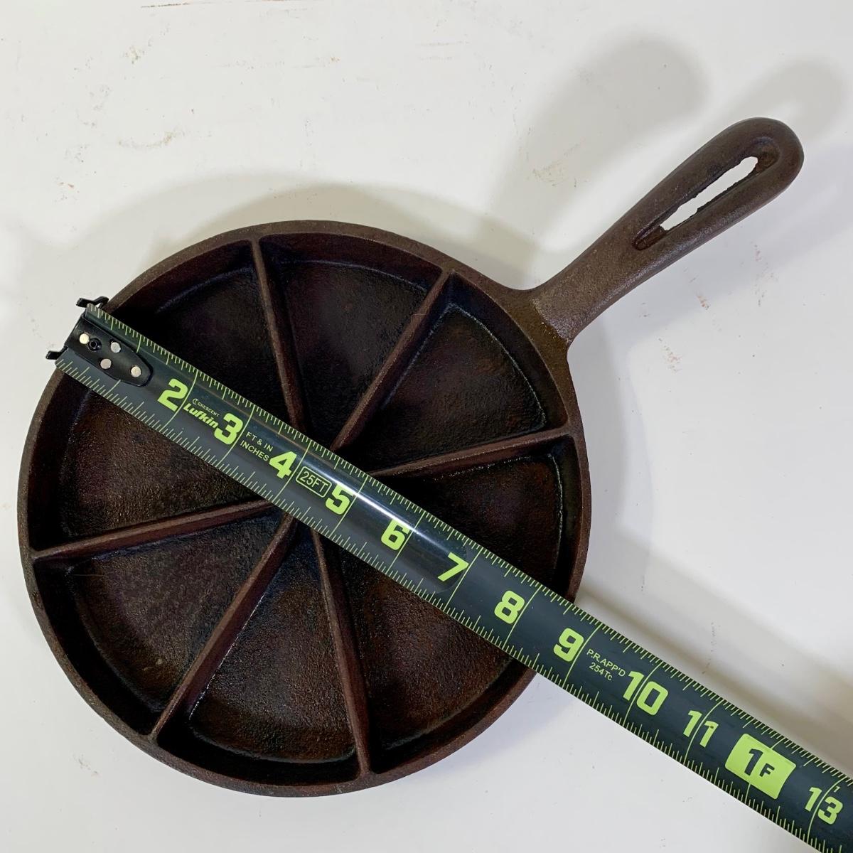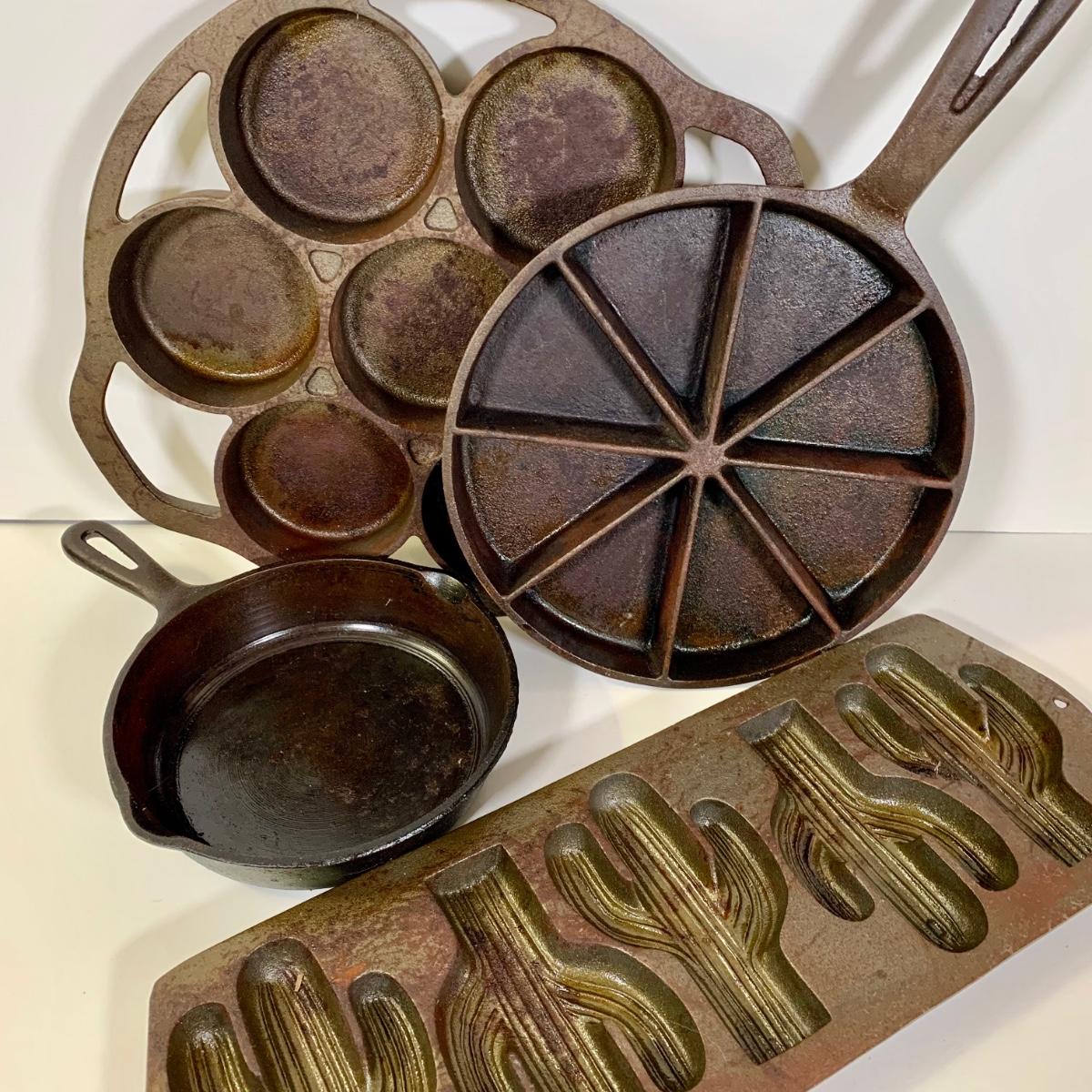 LOT 84: Cast Iron Collection: Cracker Barrel Biscuit Pan, Lodge Cactus Pan, 5.5" Skillet, & Wedge/ Scone Pan