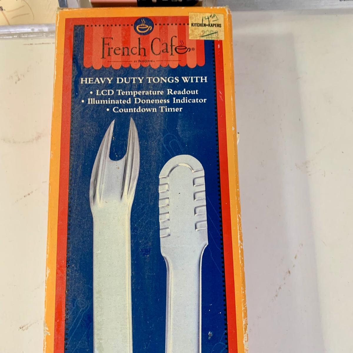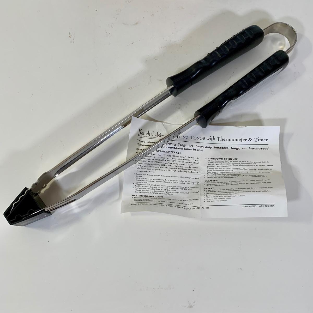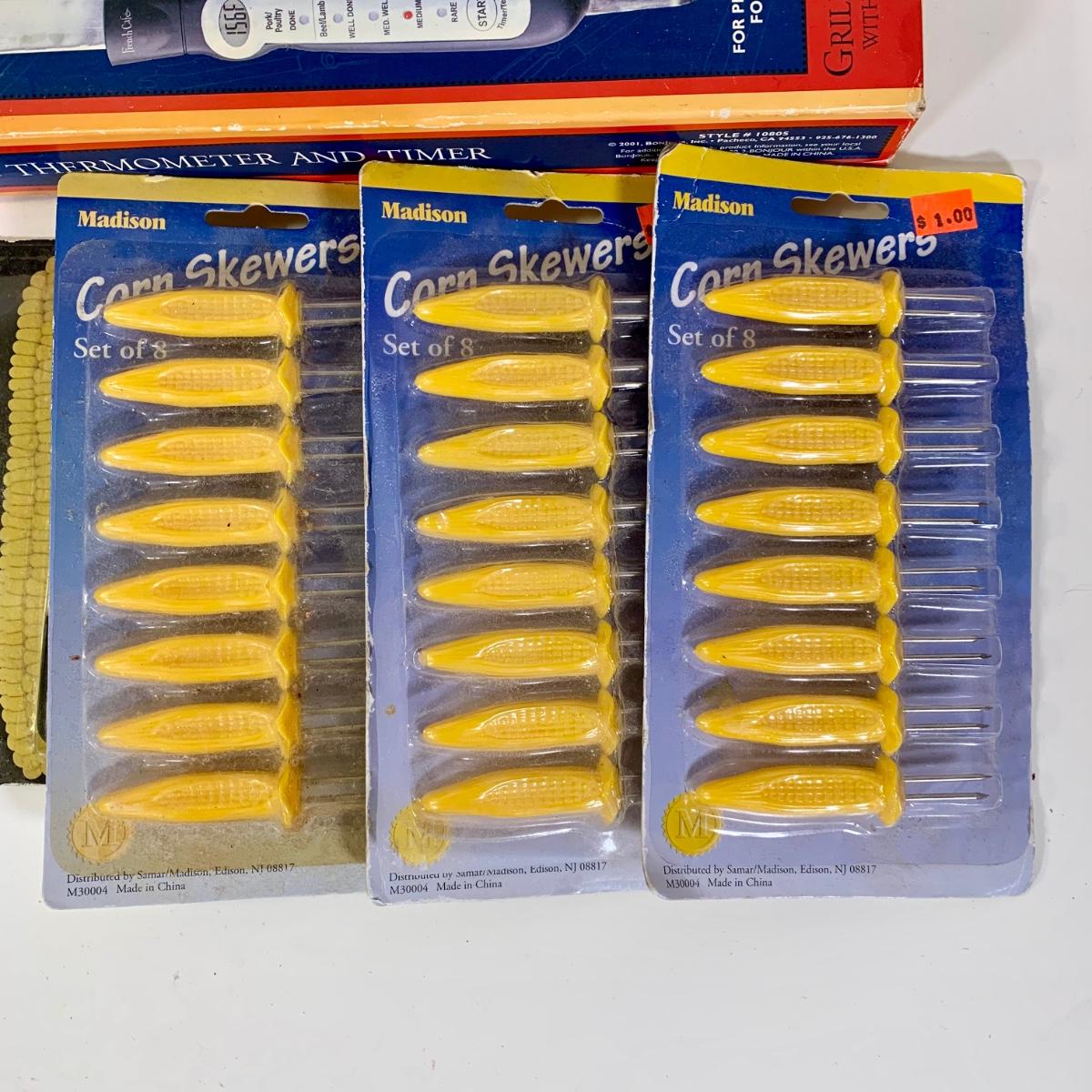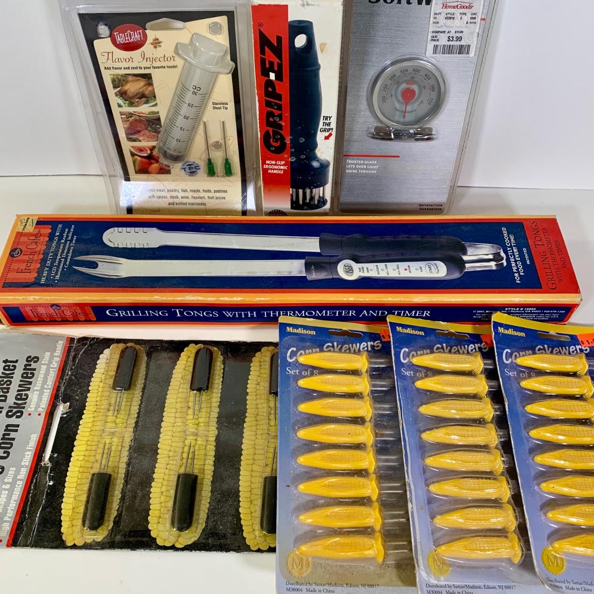 LOT 87: French Cafe Grilling Tongs w/ Thermometer & Timer, Corn Skewers, Flavor Injector, Meat Tenderiser, Oven Thermometer & More