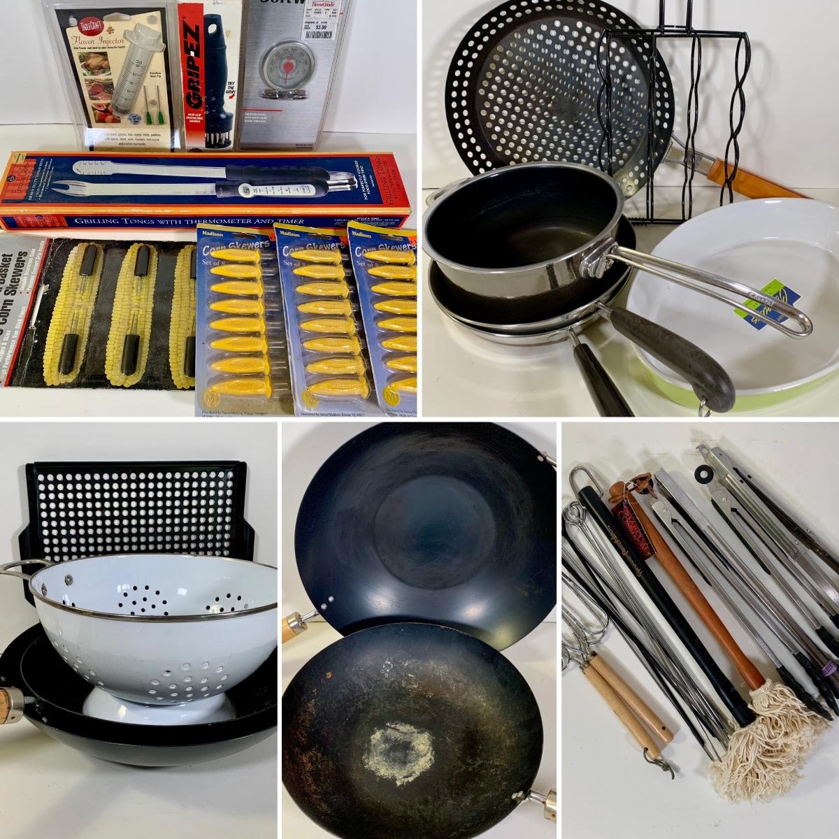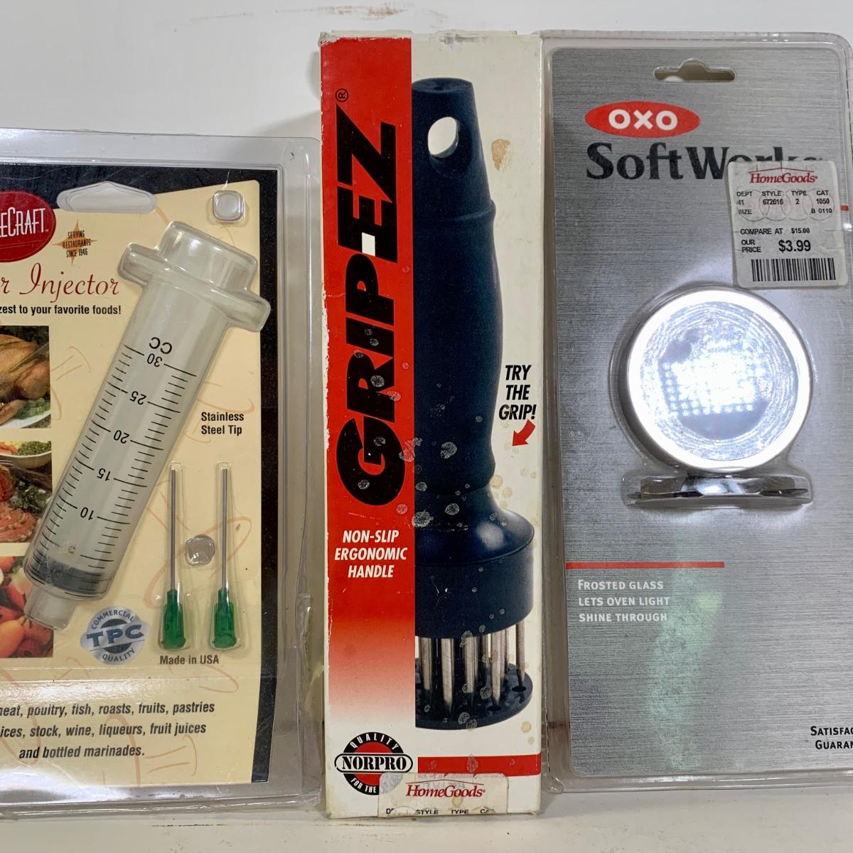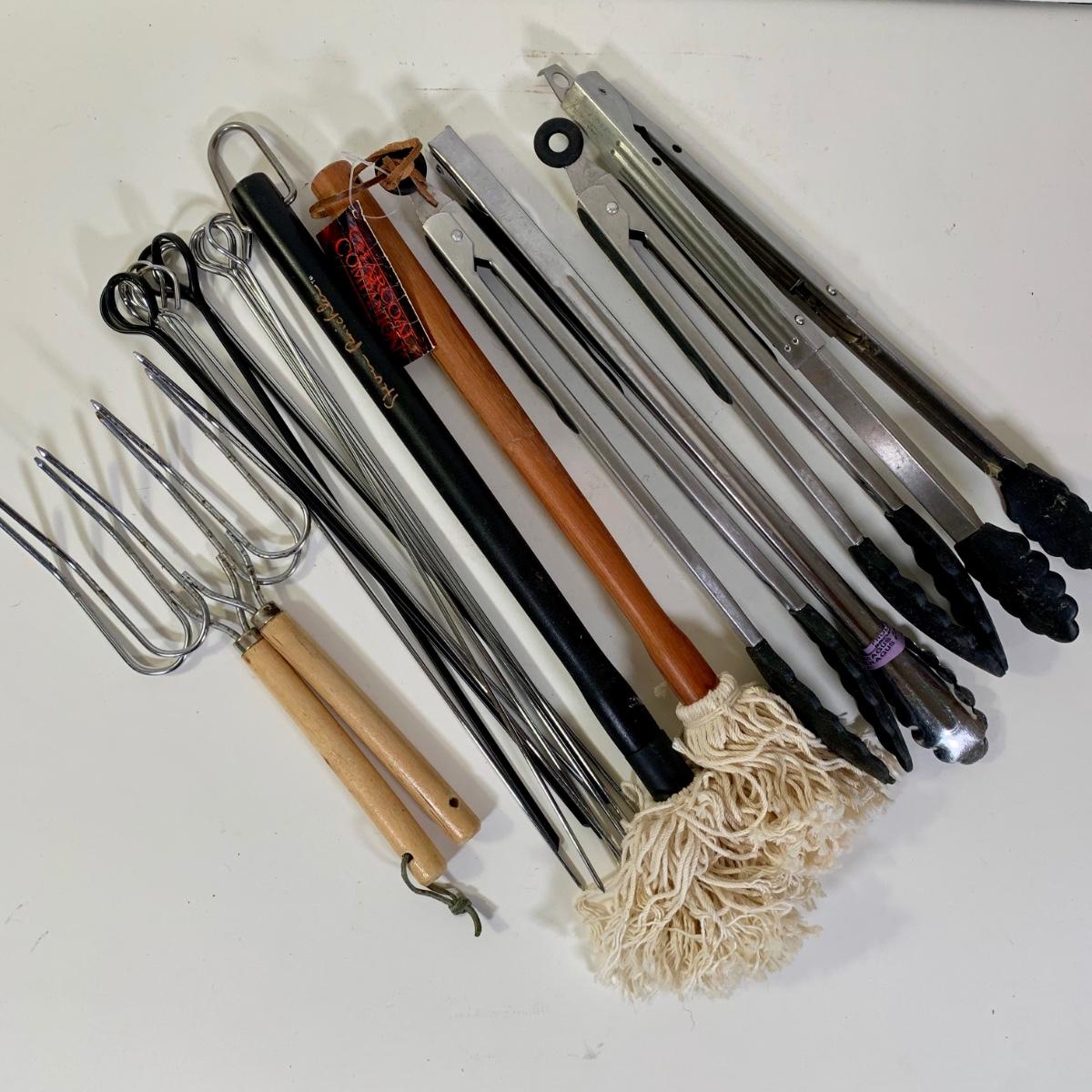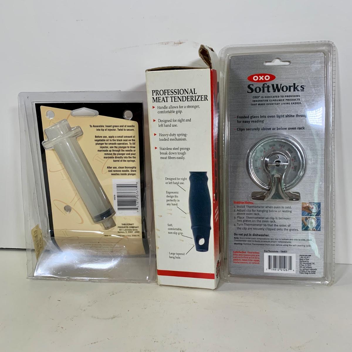 LOT 87: French Cafe Grilling Tongs w/ Thermometer & Timer, Corn Skewers, Flavor Injector, Meat Tenderiser, Oven Thermometer & More