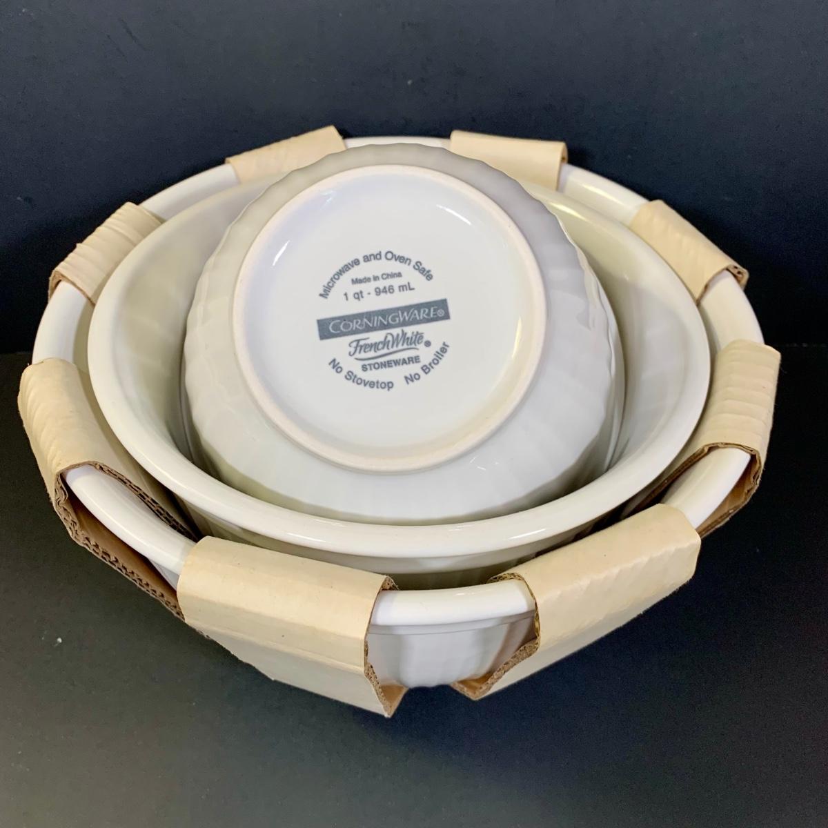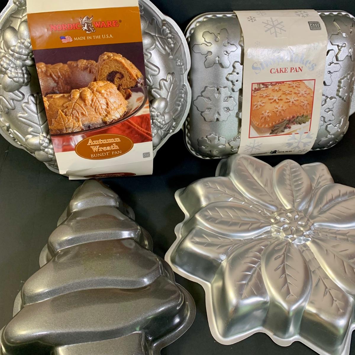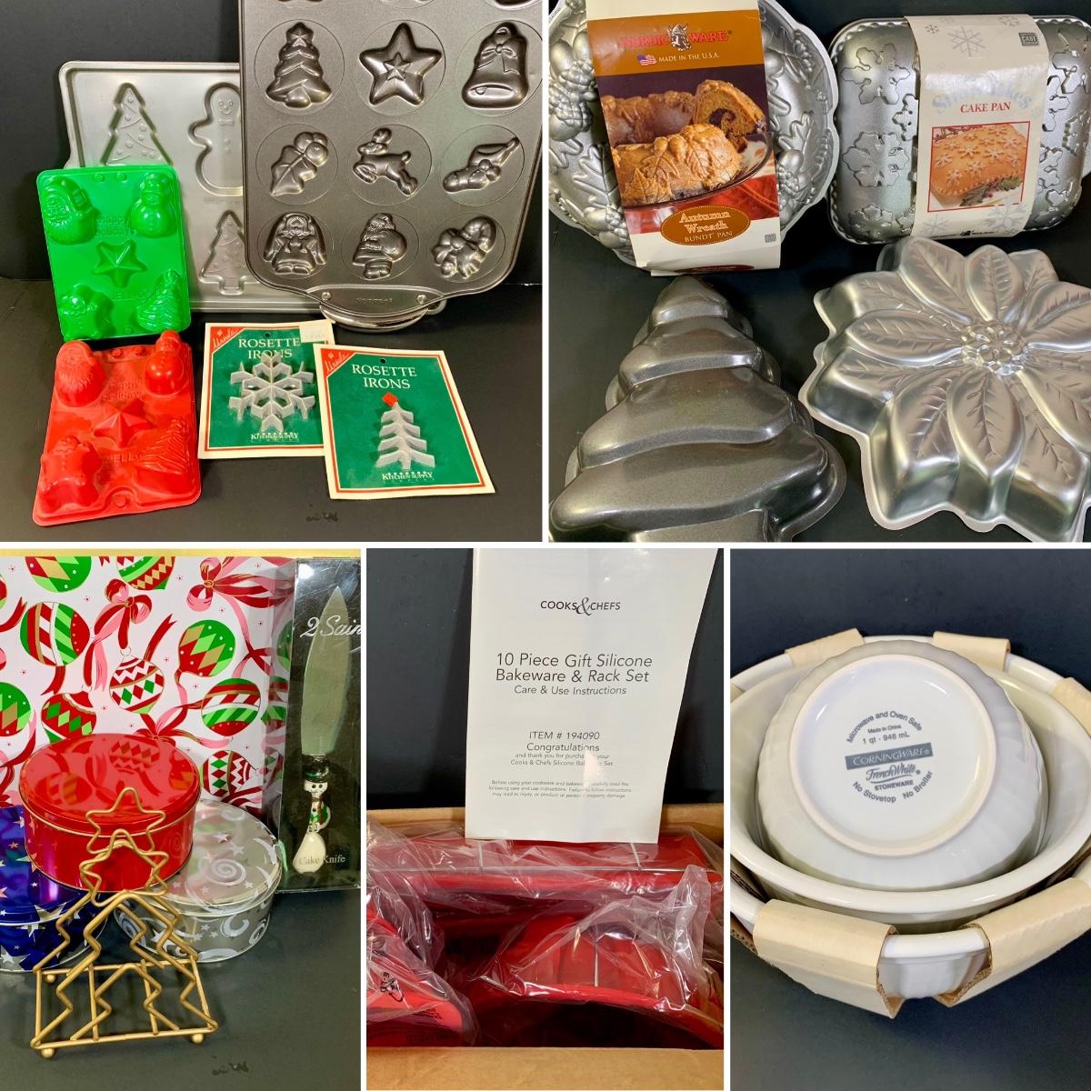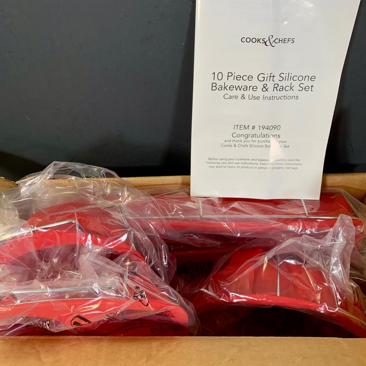 LOT 90: NIP Cooks & Chefs 10 Piece Gift Silicone Bakeware & Rack Set, CorningWare French White Stoneware Mixing Bowls, NordicWare Bunt, Cake Pans, & More