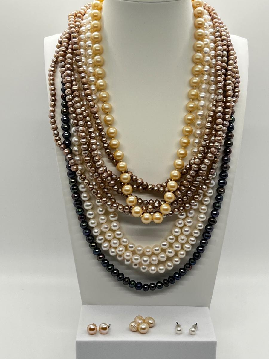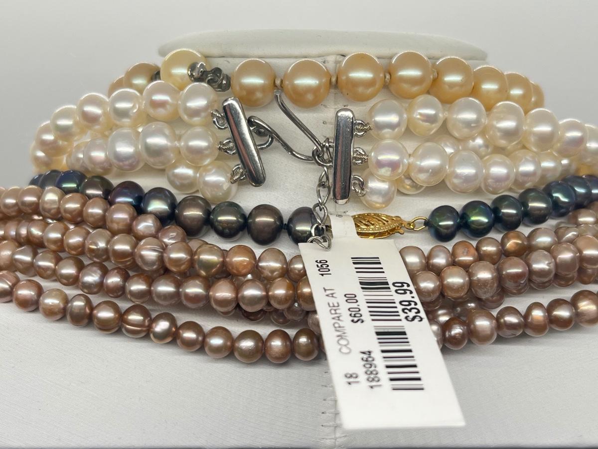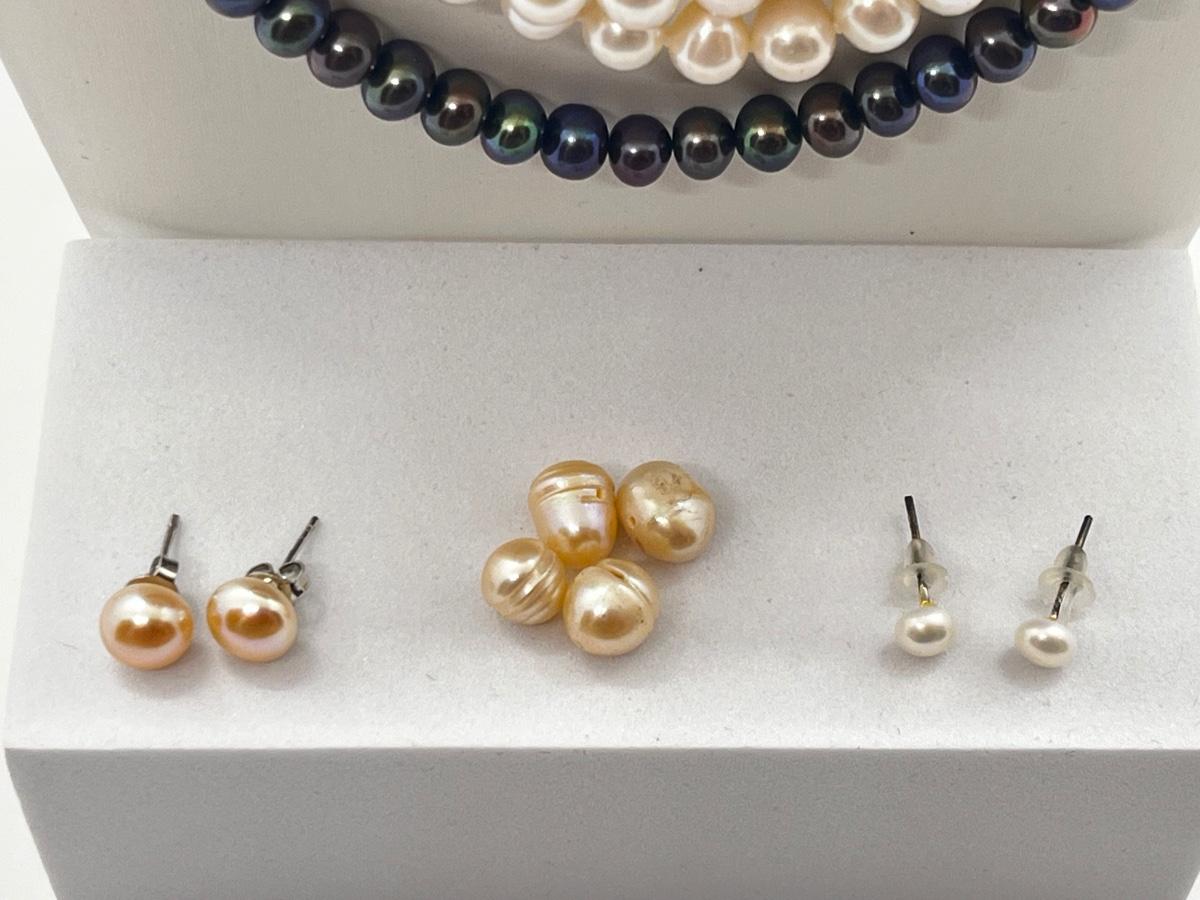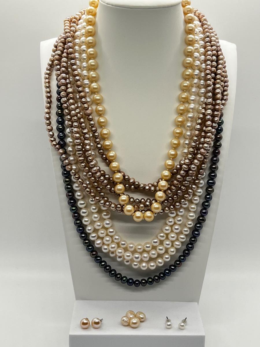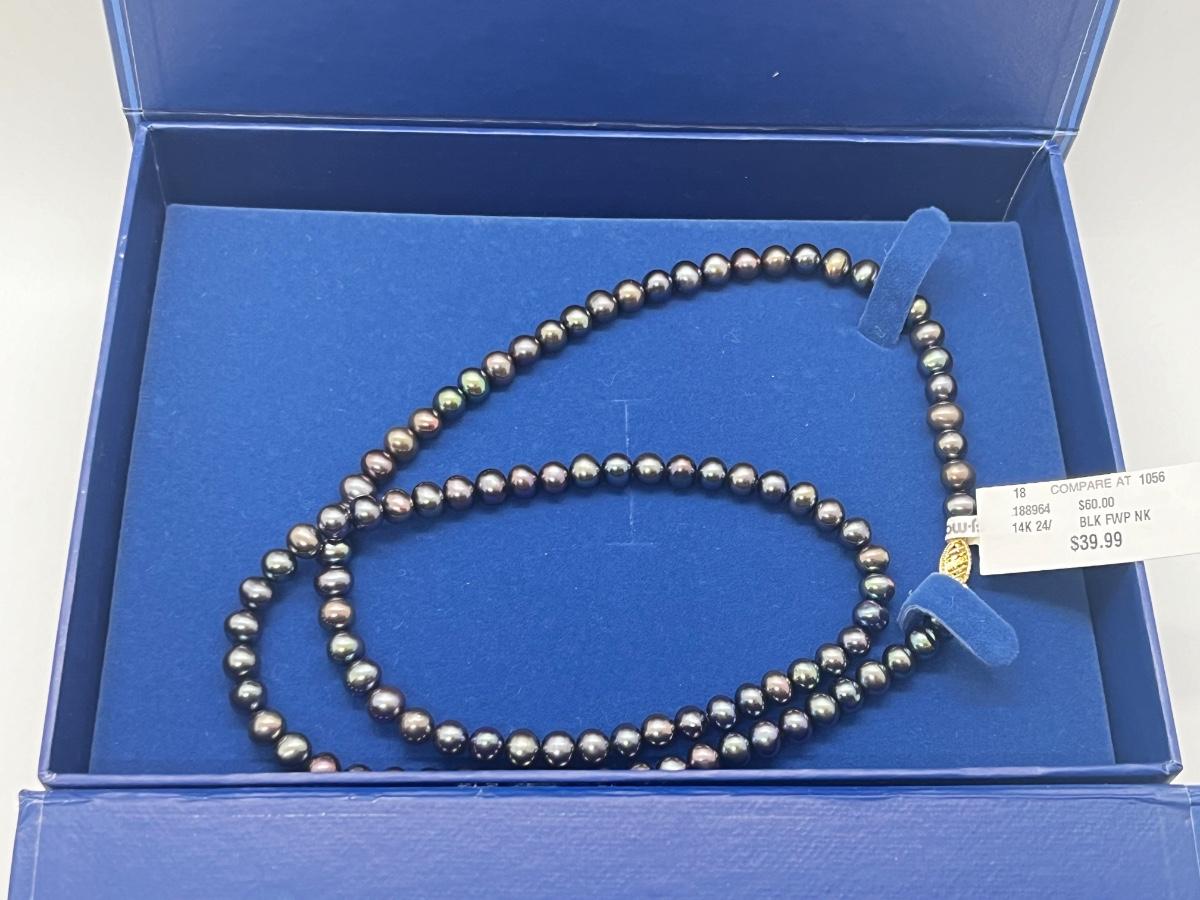 LOT 103J: Pearl Jewelry - 24" Black Pearl Necklace w/ 14K Gold Clasp, 20" Triple Strand and 100" Opera-Length Strand + Earrings