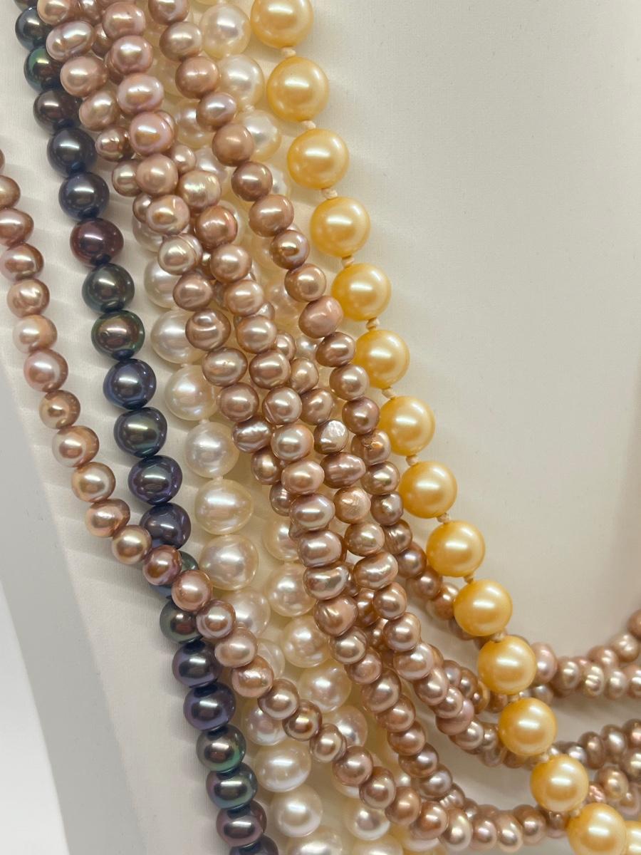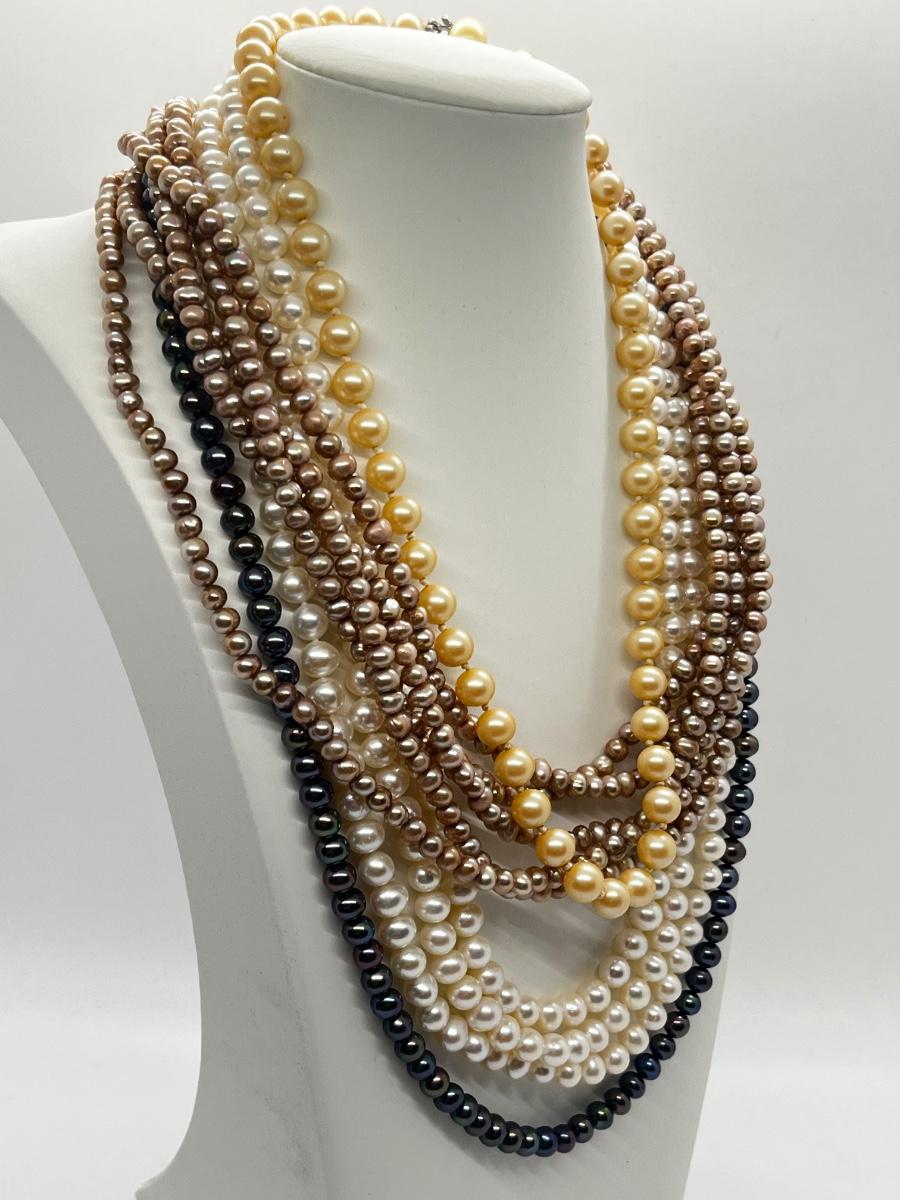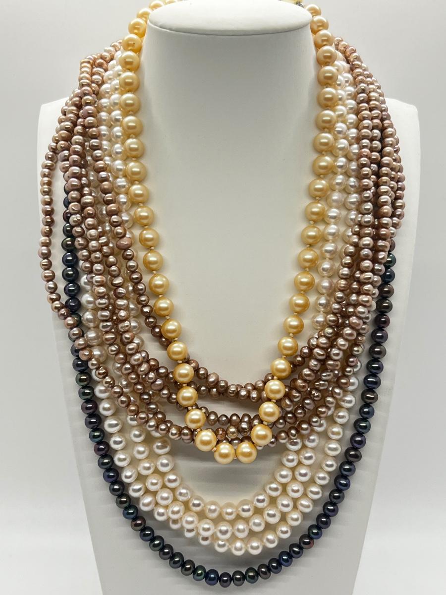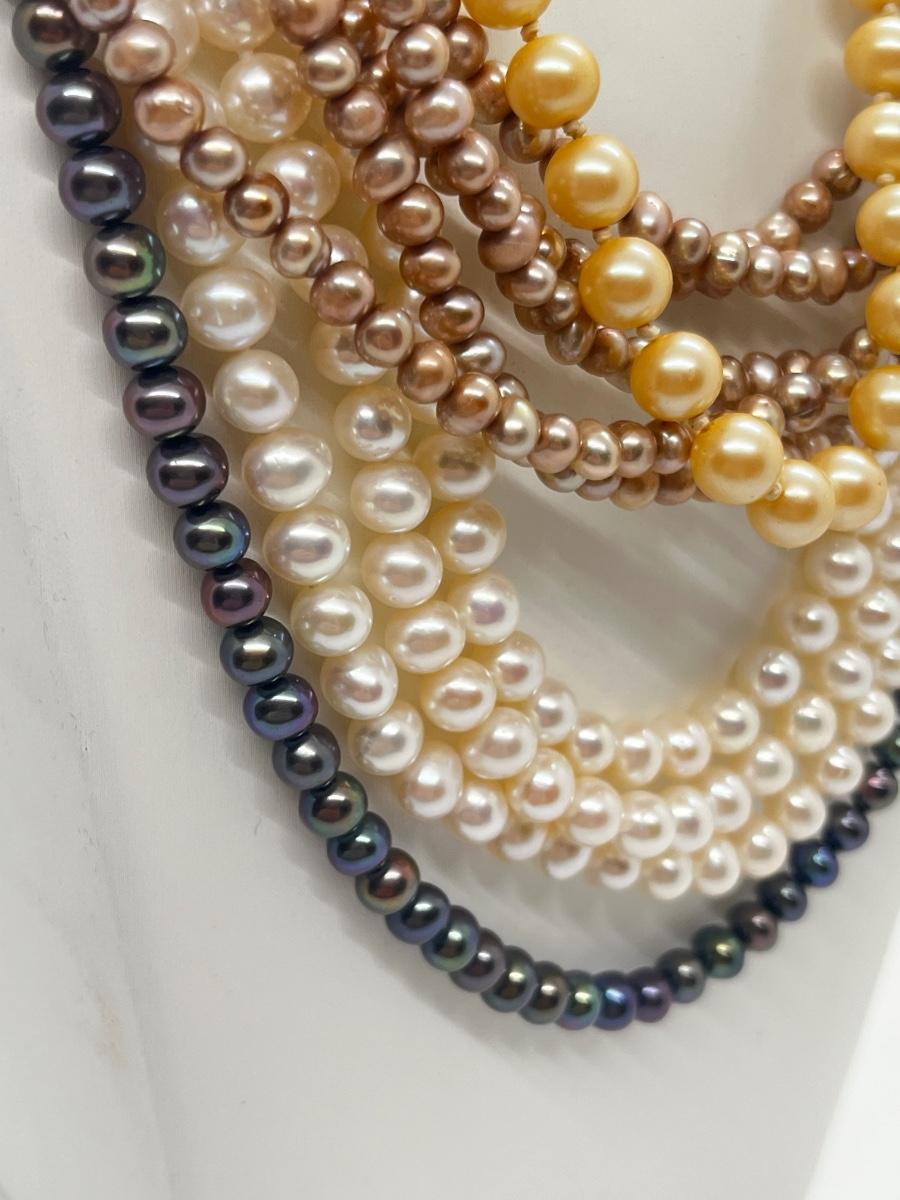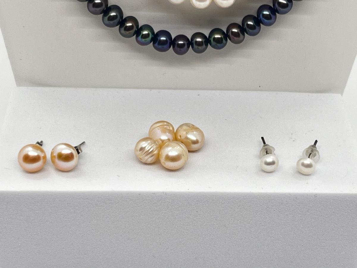 LOT 103J: Pearl Jewelry - 24" Black Pearl Necklace w/ 14K Gold Clasp, 20" Triple Strand and 100" Opera-Length Strand + Earrings