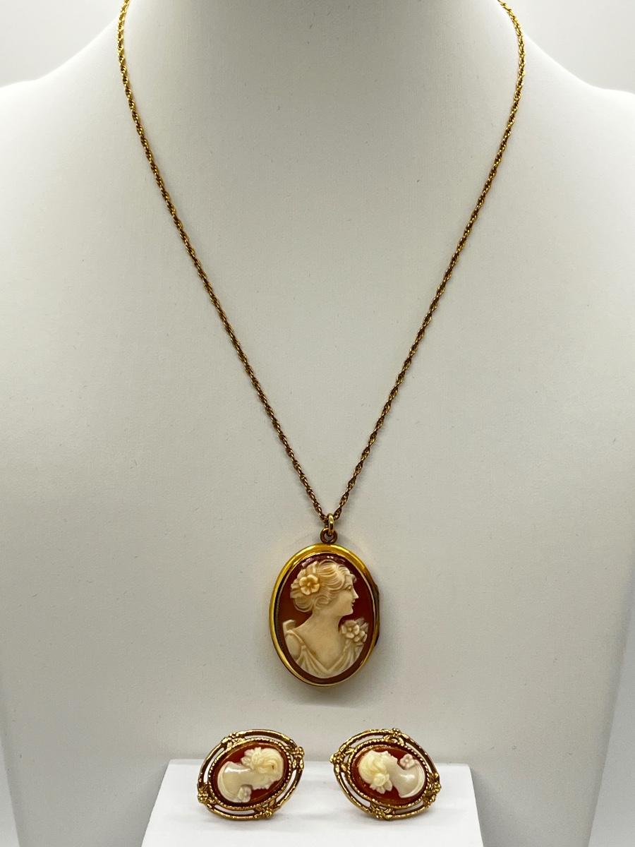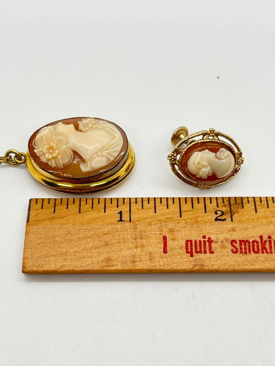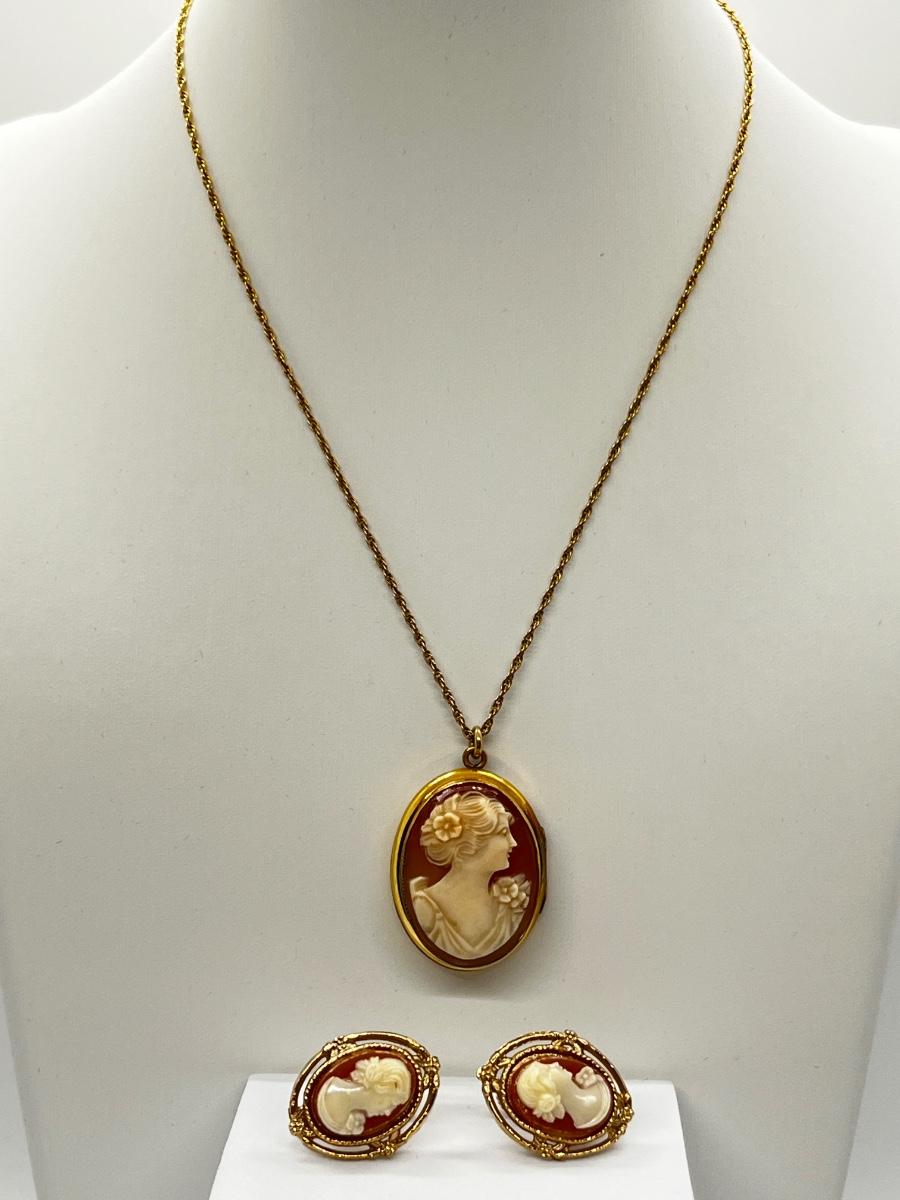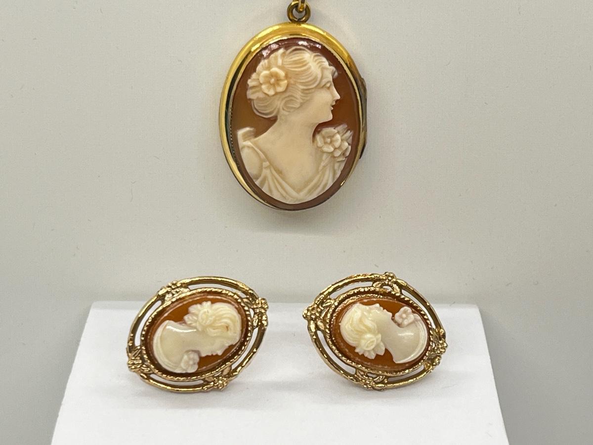 LOT 112J: 1/20 10K Gold Filled Vintage Cameo Locket w/ Costume Screwback Earrings