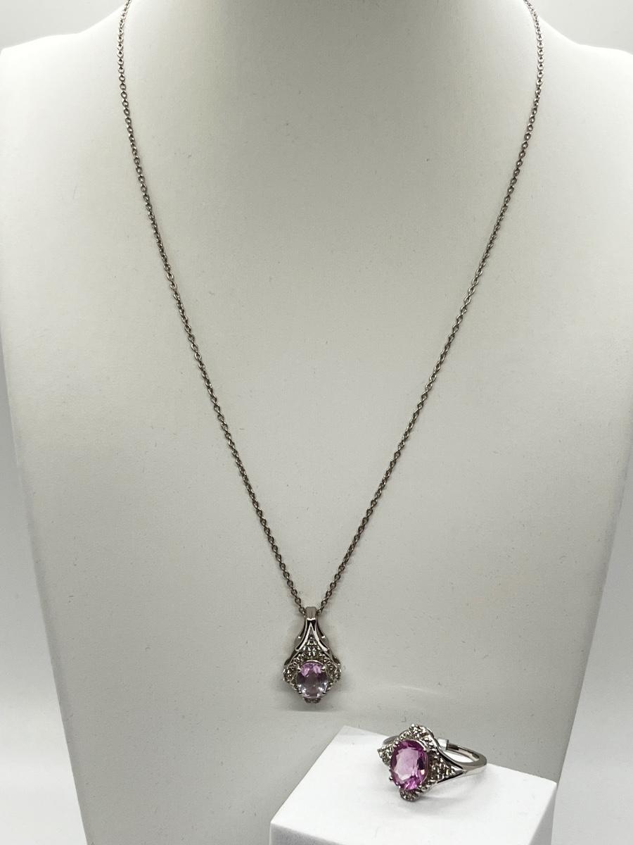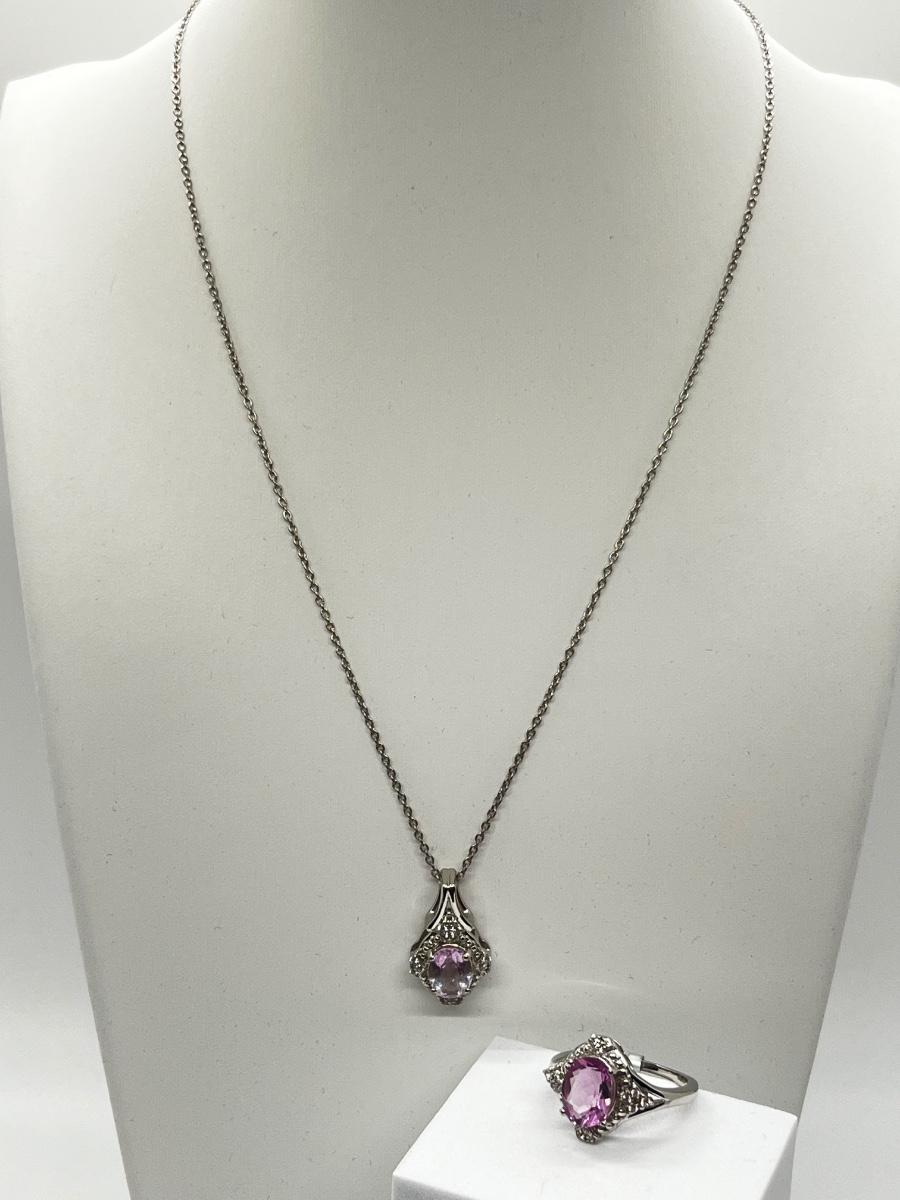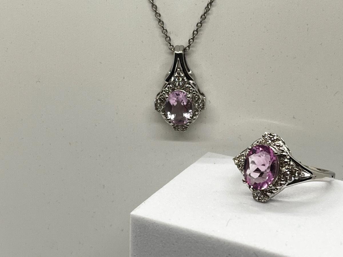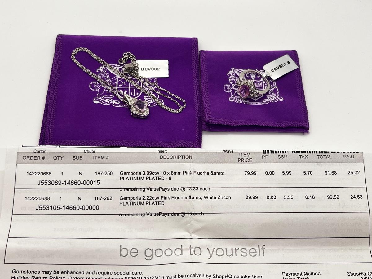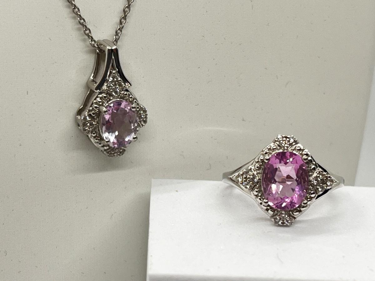 LOT 114J: NEW! Gemporia Platinum Plated Sterling Silver Pink Fluorite Jewelry Set - Size 8 Ring and Pendant on Adjustable-Length Chain