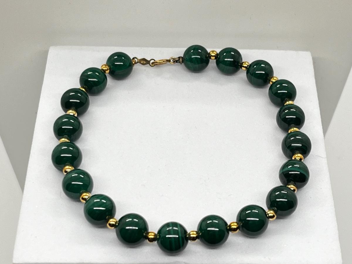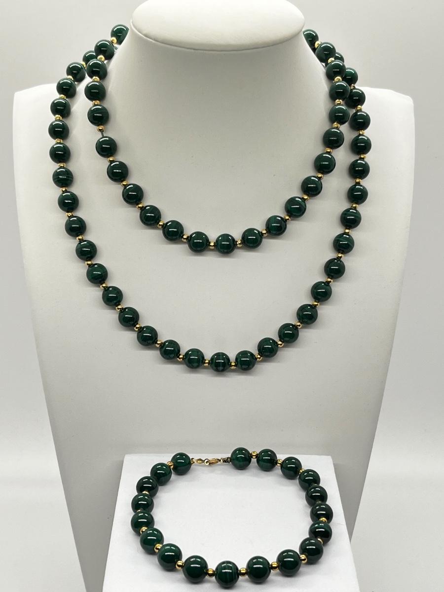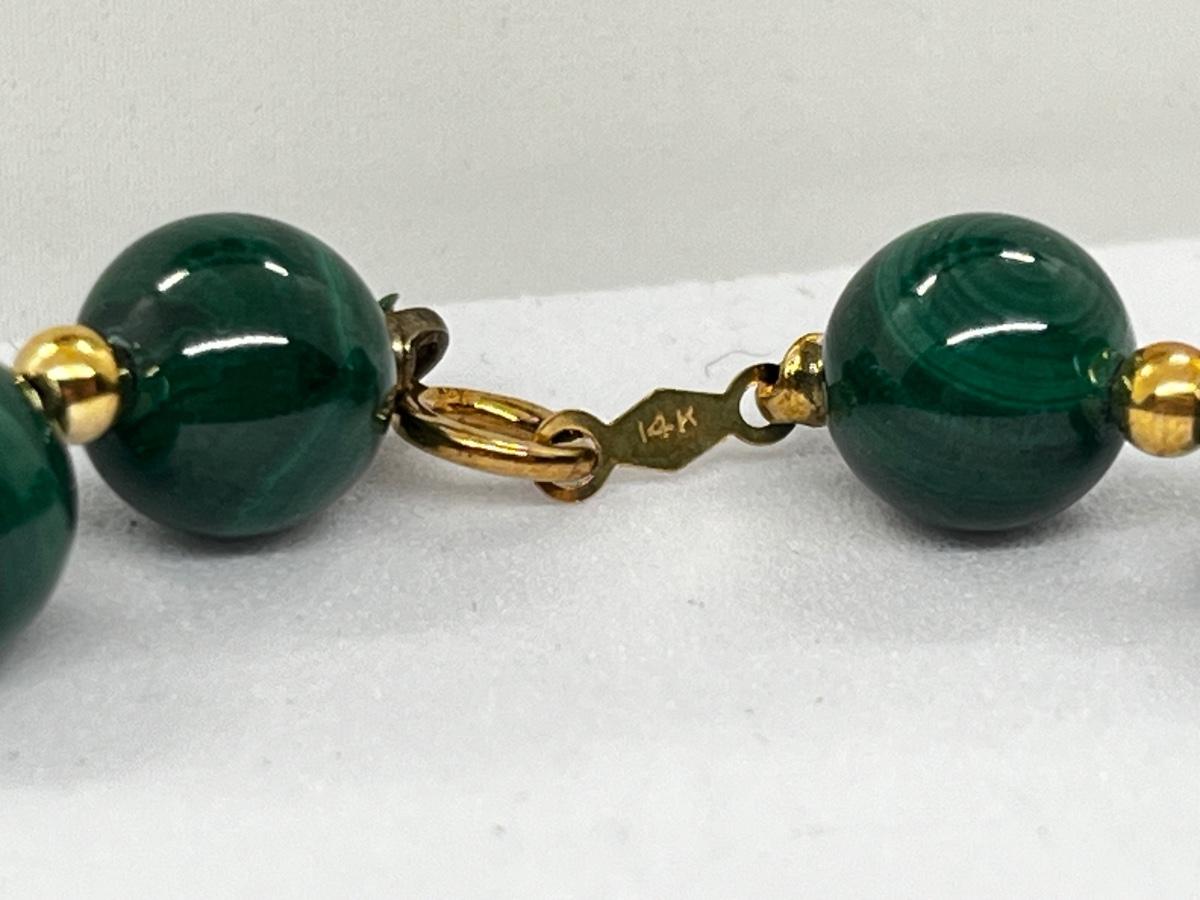 LOT 137: Classic 14K Gold & Malachite Beaded Necklace (30”) & Bracelet (8”)