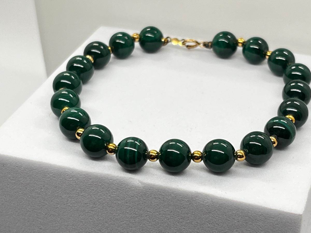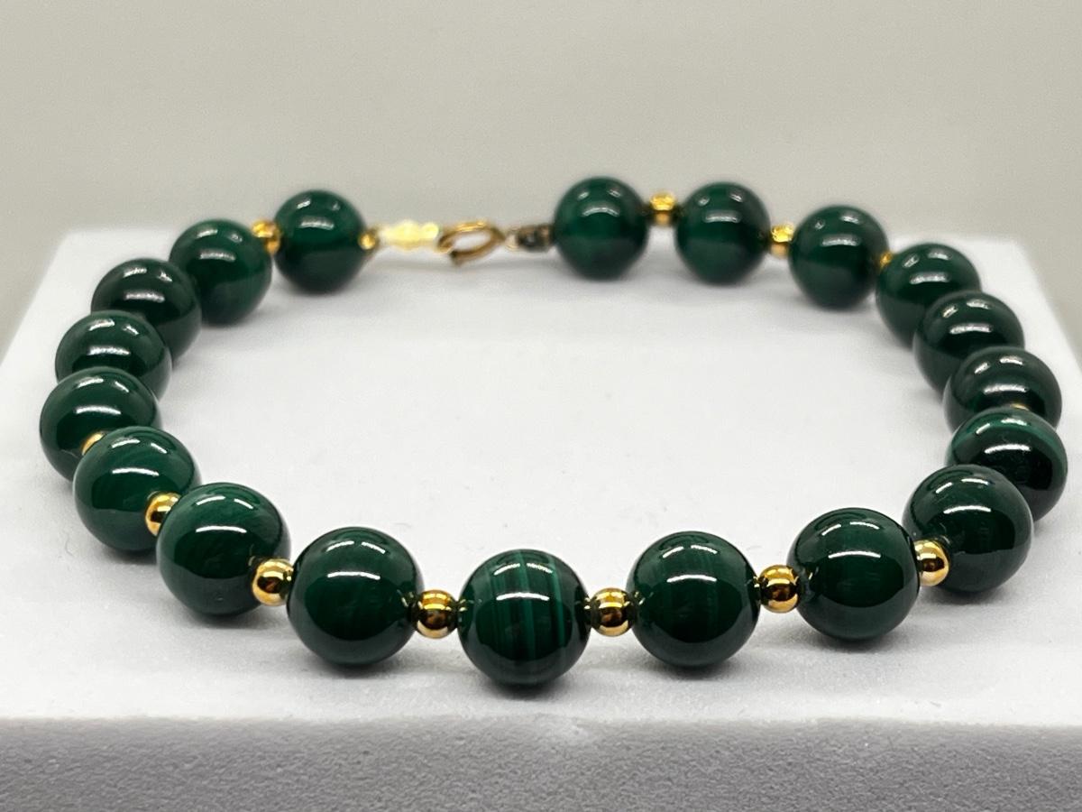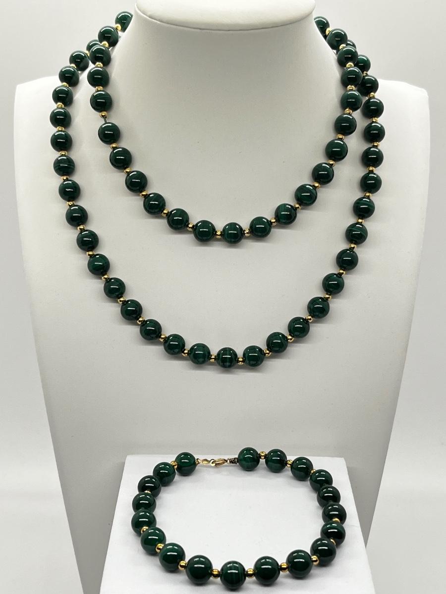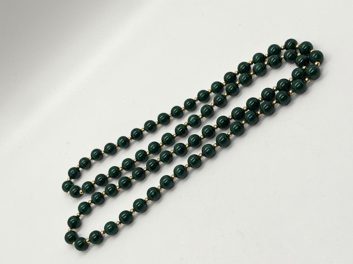 LOT 137: Classic 14K Gold & Malachite Beaded Necklace (30”) & Bracelet (8”)