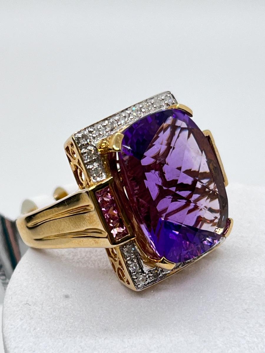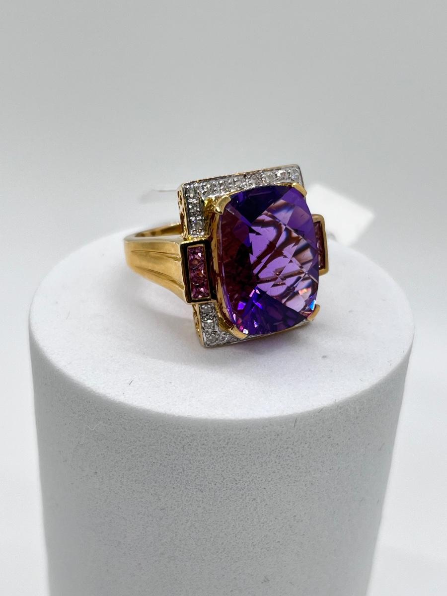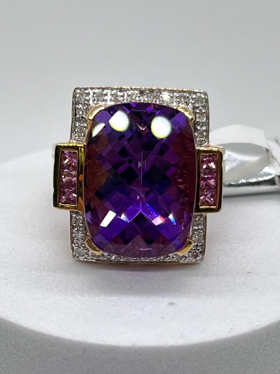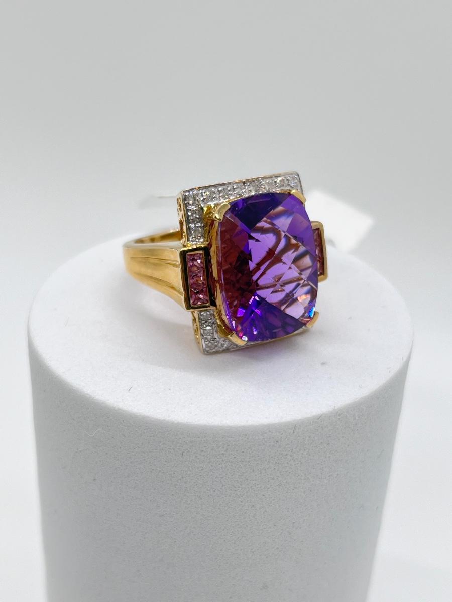 LOT 162J:NEW! Delightful Size 8 14K Gold Cocktail Ring with Huge Cushion-Cut Amethyst Flanked by Pink Topaz and Diamonds - 11 gtw