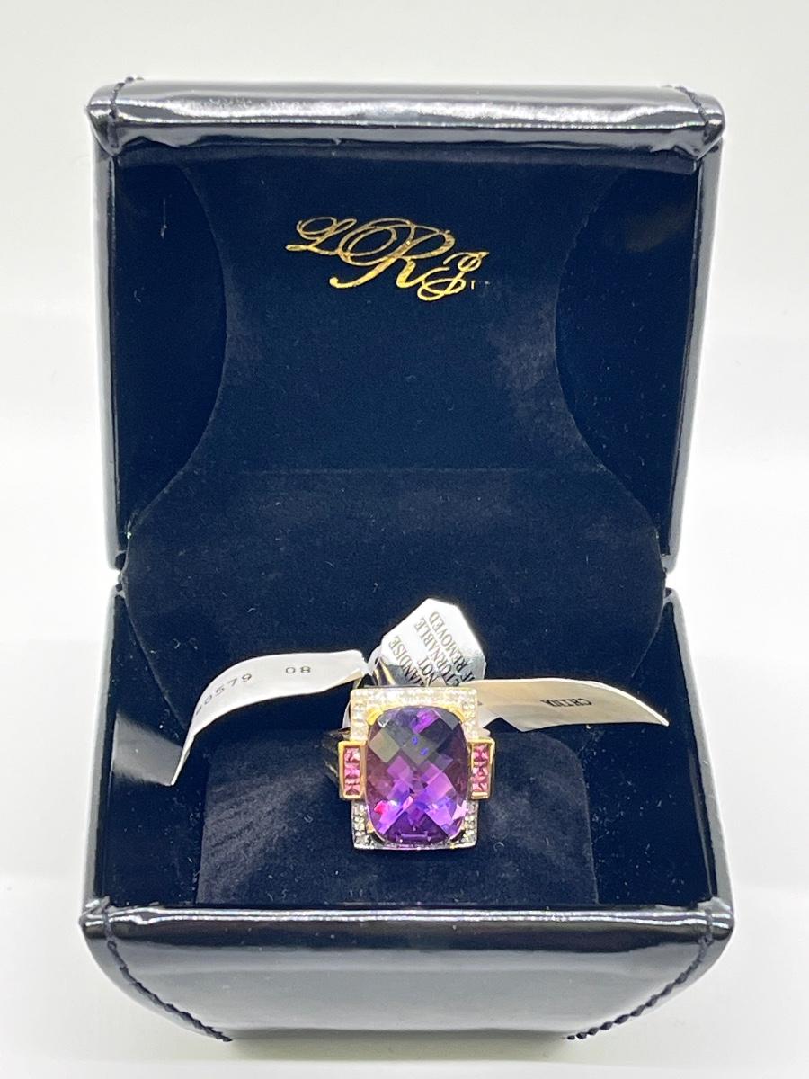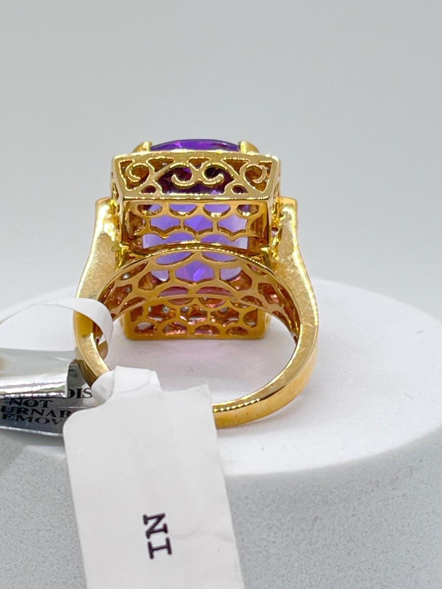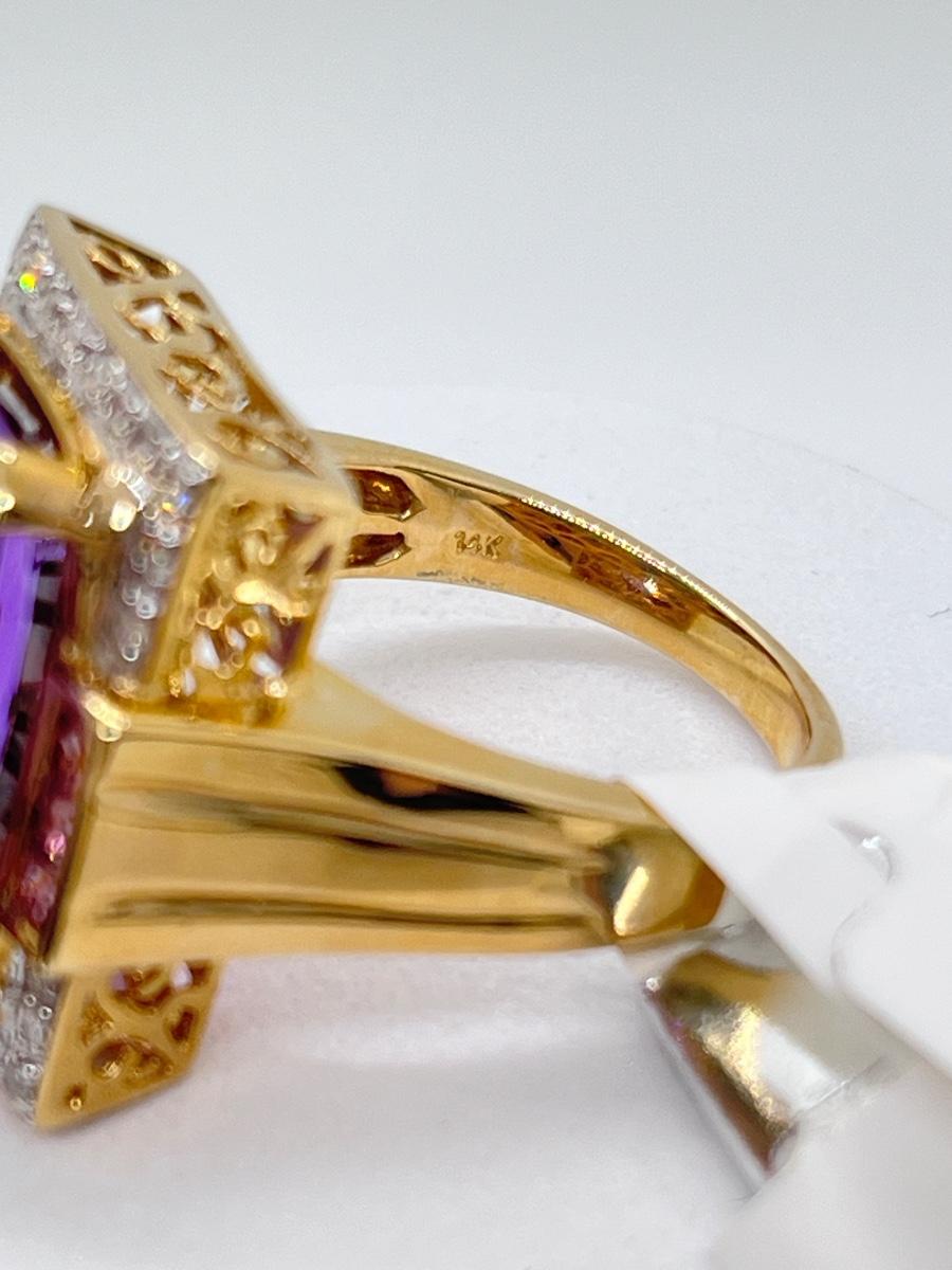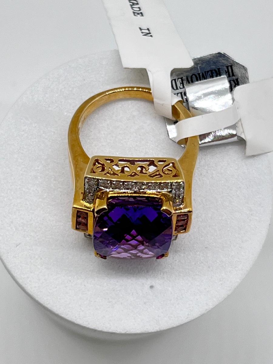 LOT 162J:NEW! Delightful Size 8 14K Gold Cocktail Ring with Huge Cushion-Cut Amethyst Flanked by Pink Topaz and Diamonds - 11 gtw