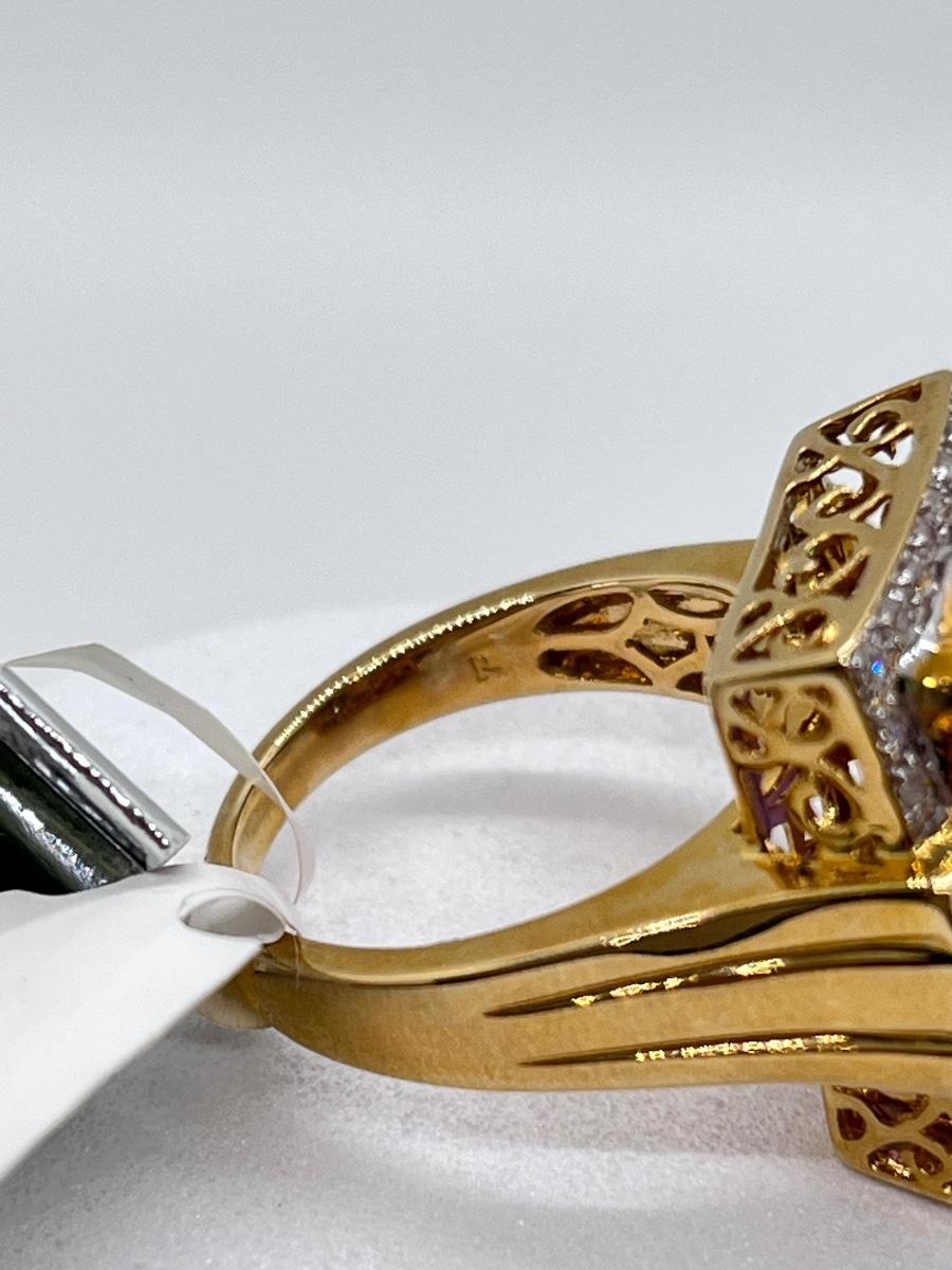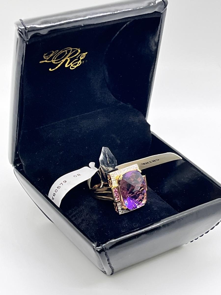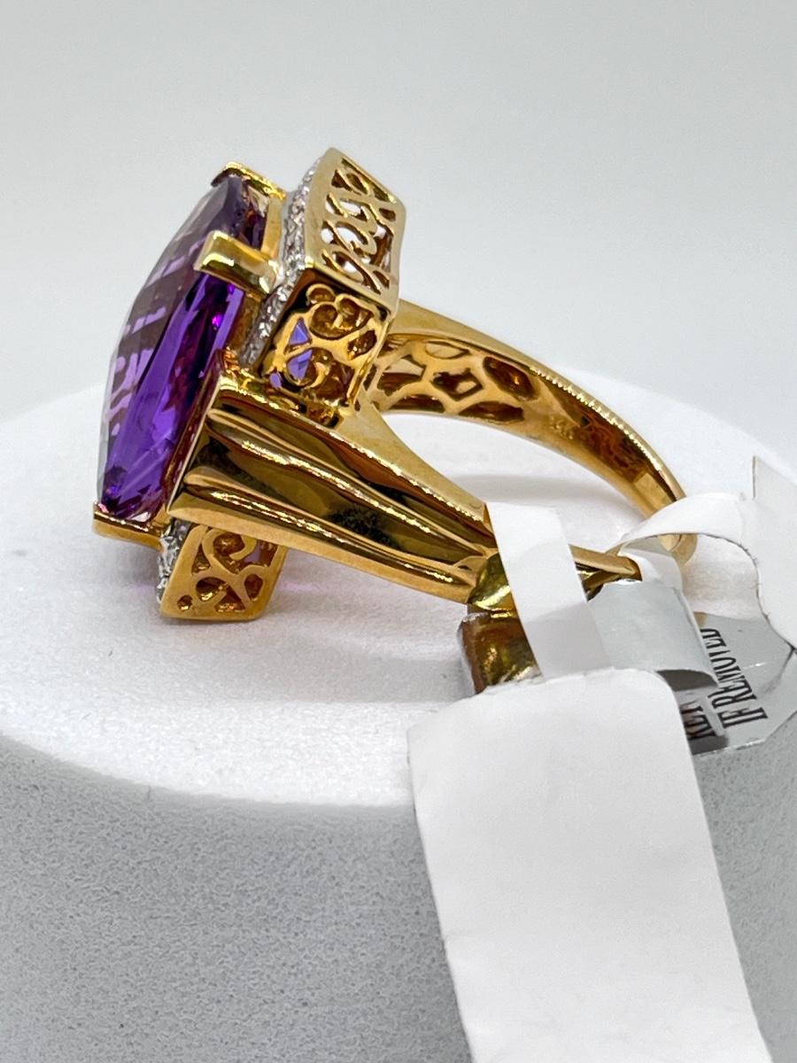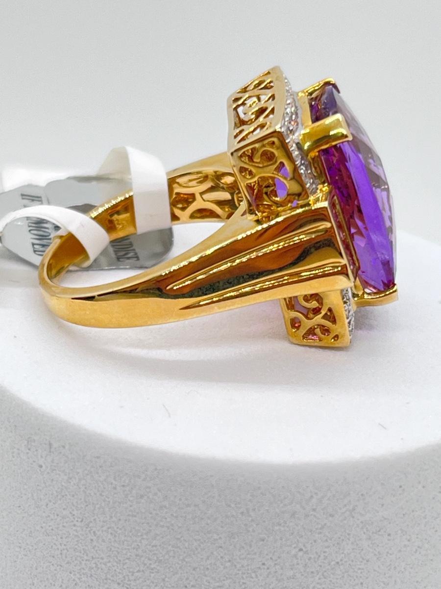 LOT 162J:NEW! Delightful Size 8 14K Gold Cocktail Ring with Huge Cushion-Cut Amethyst Flanked by Pink Topaz and Diamonds - 11 gtw