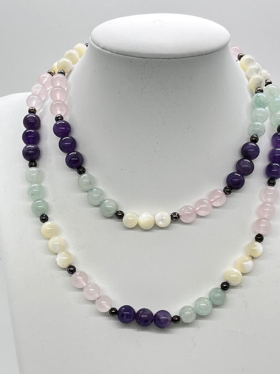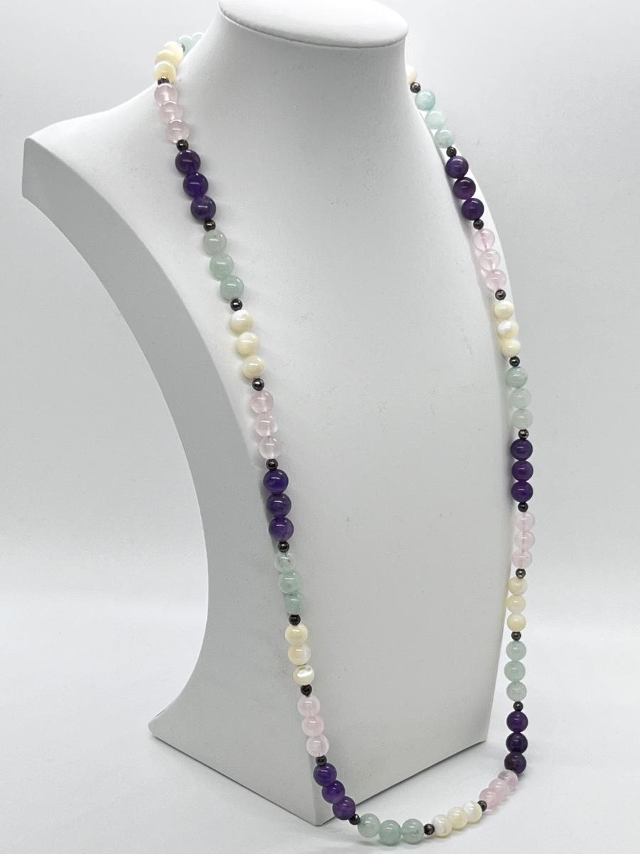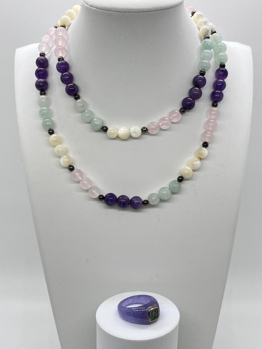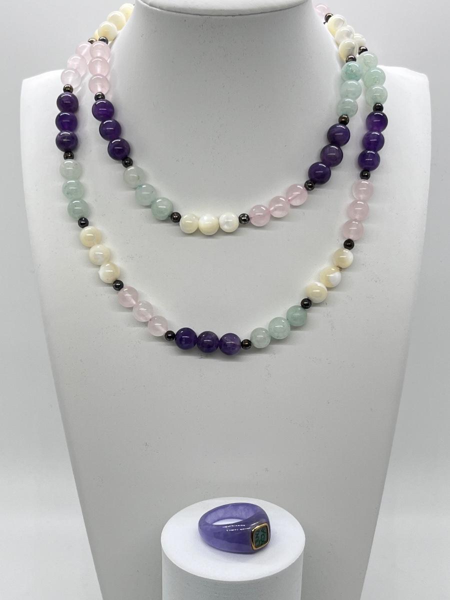 LOT 170J: Pretty Lavender Jade Ring Size 8 + 30" Multi-Gemstone Necklace