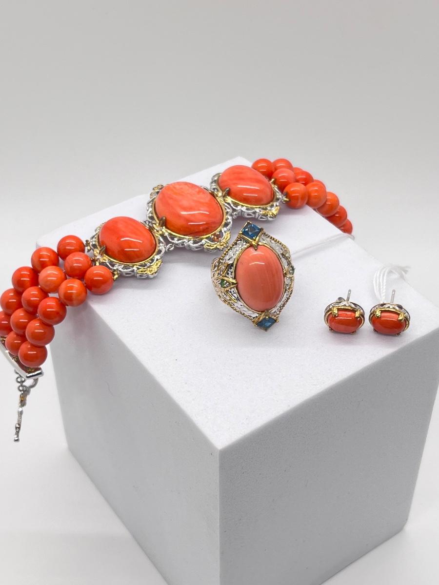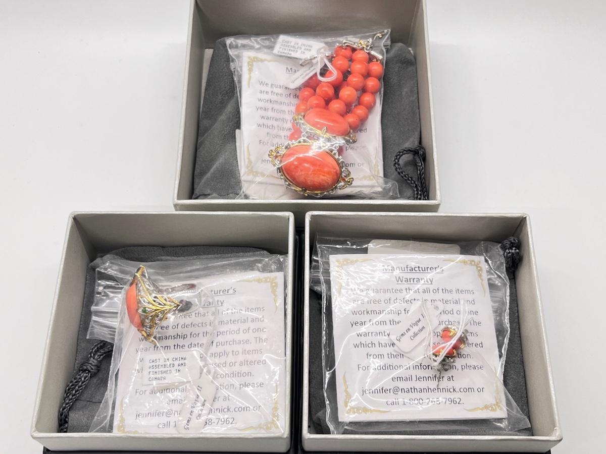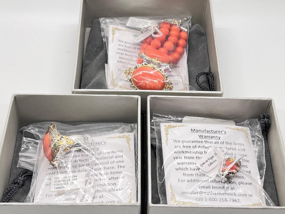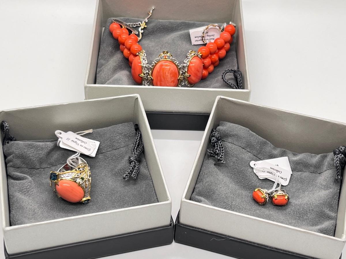 LOT 171J: NEW! Stunning Sterling and Palladium Salmon Colored Coral - 7" Bracelet, Ring Size 8 and Post Earrings-All New by Gems En Vogue