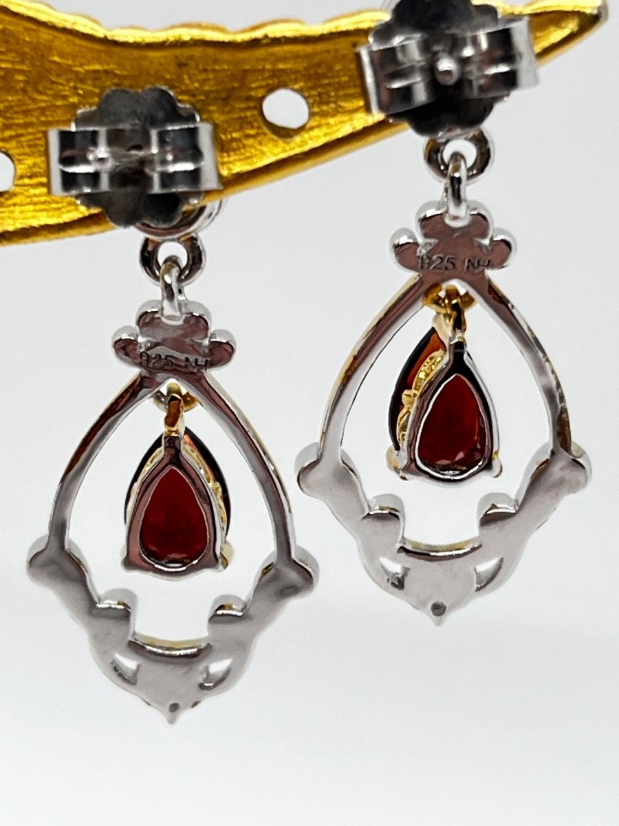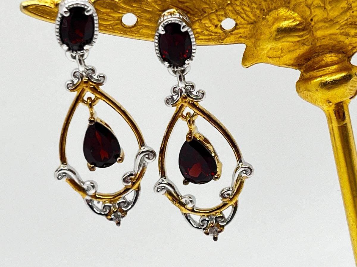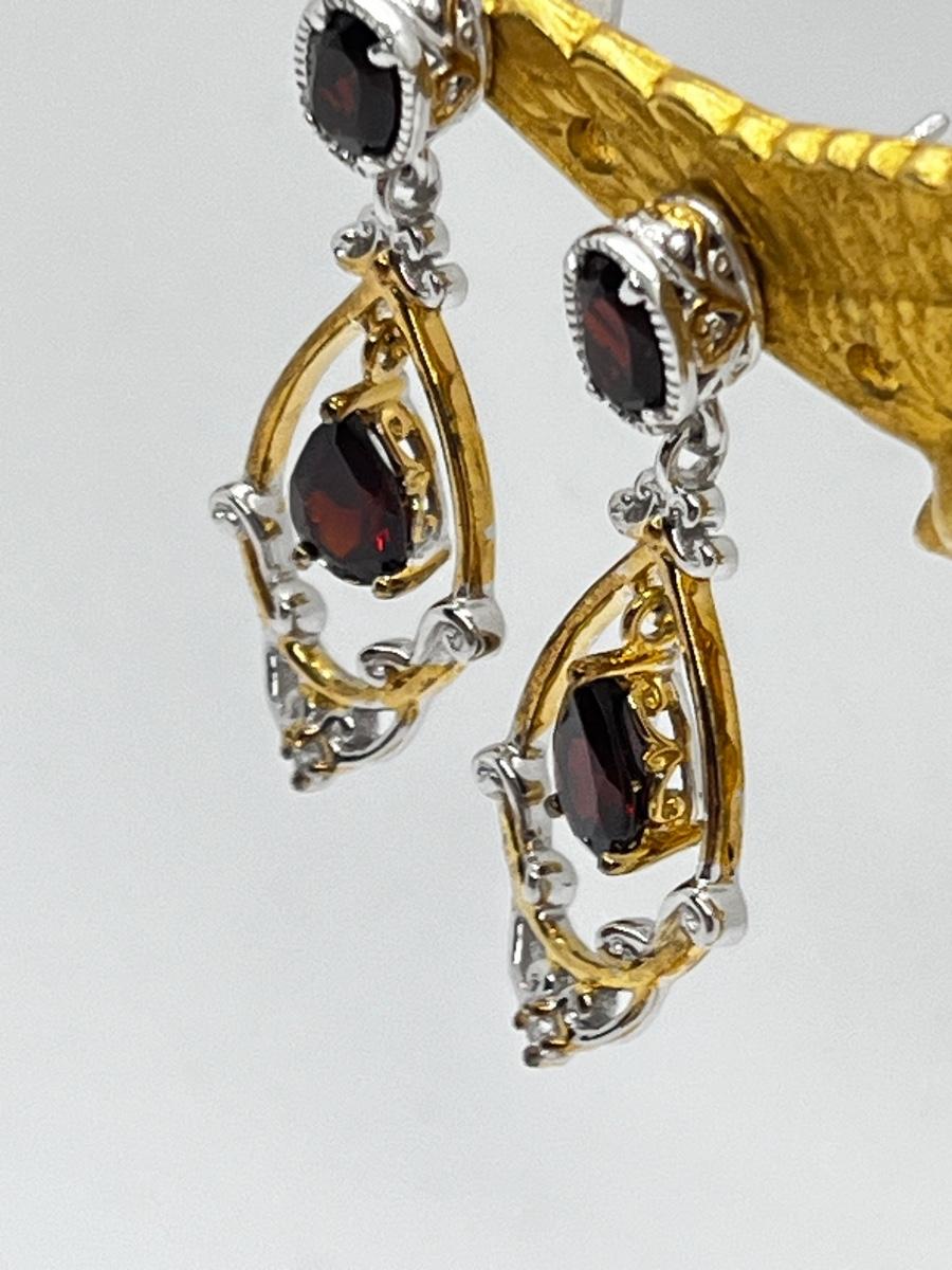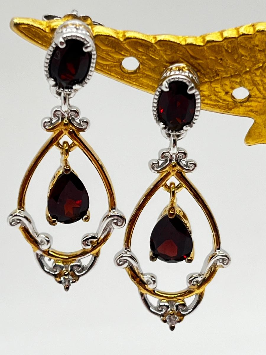 LOT 183J: NEW! Spectacular Garnet Filigree Two Toned Drop Earrings-18K Gold overlay on 925 Sterling and Palladium Almondite Garnet Gems en Vogue