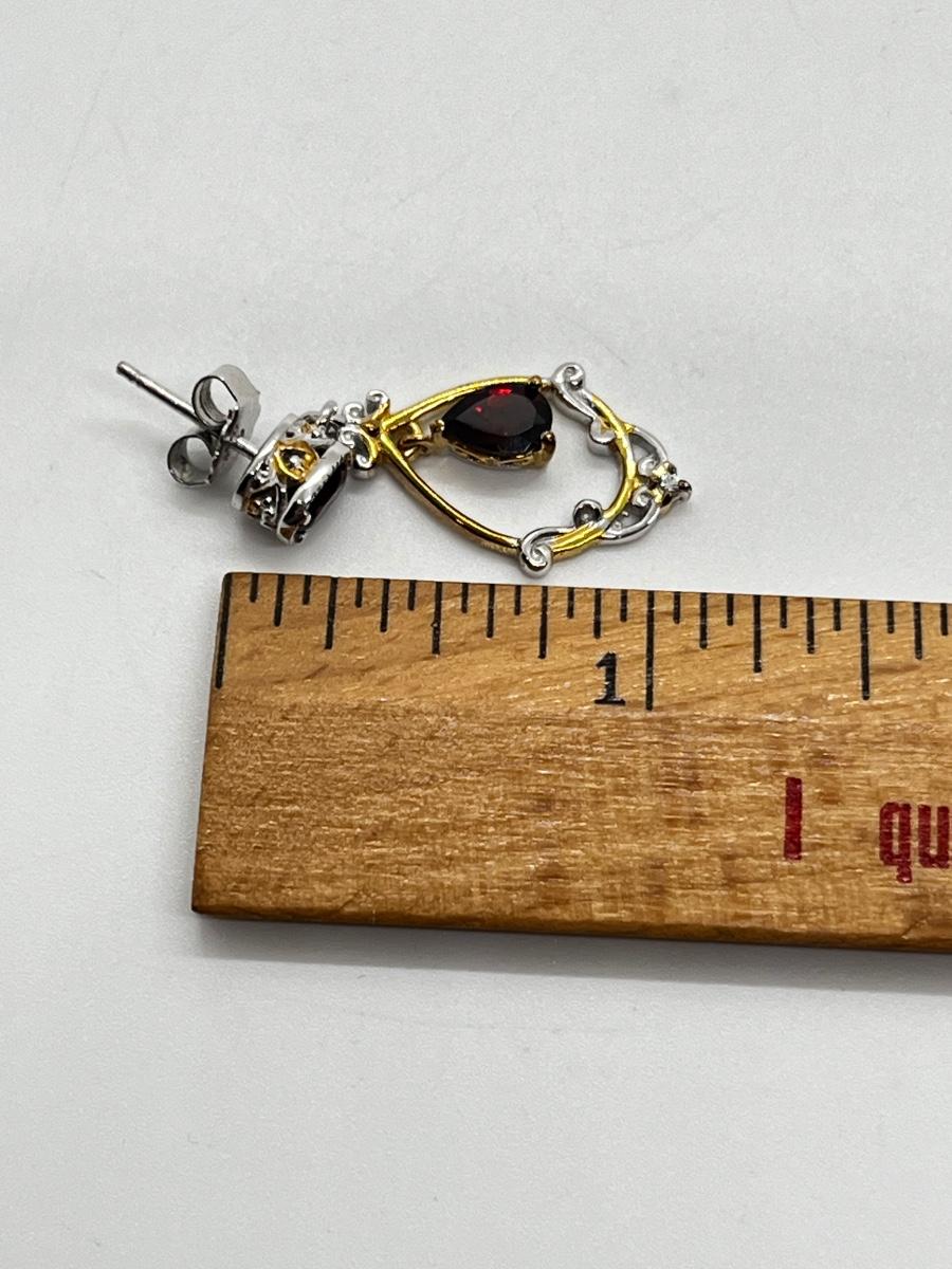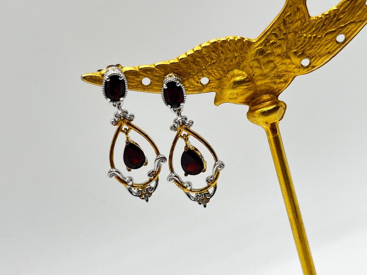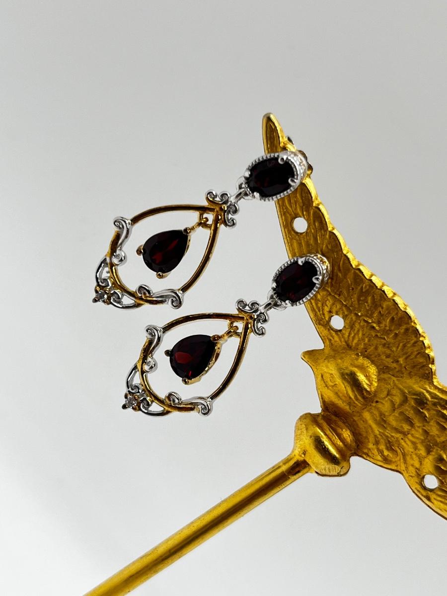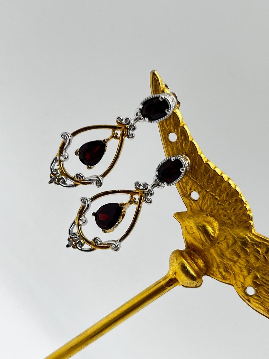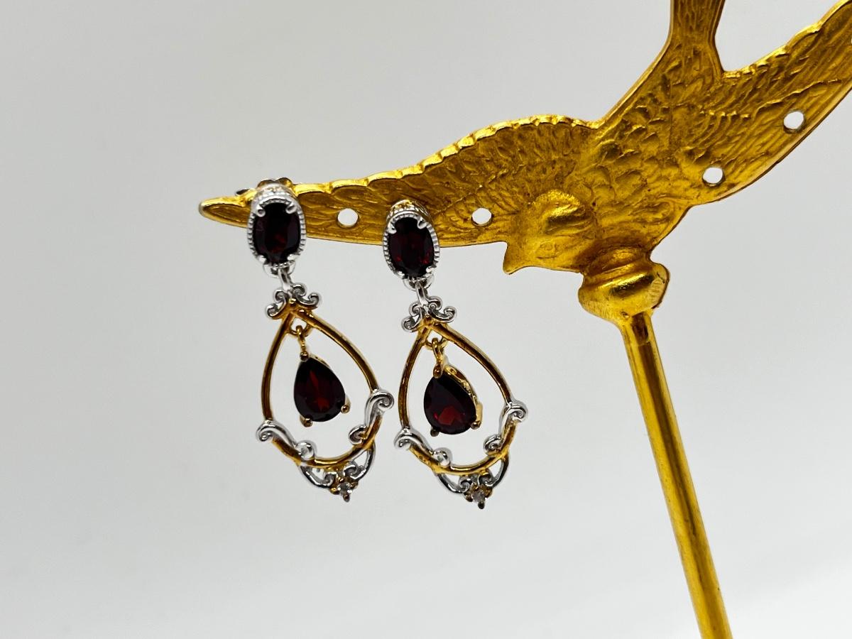 LOT 183J: NEW! Spectacular Garnet Filigree Two Toned Drop Earrings-18K Gold overlay on 925 Sterling and Palladium Almondite Garnet Gems en Vogue