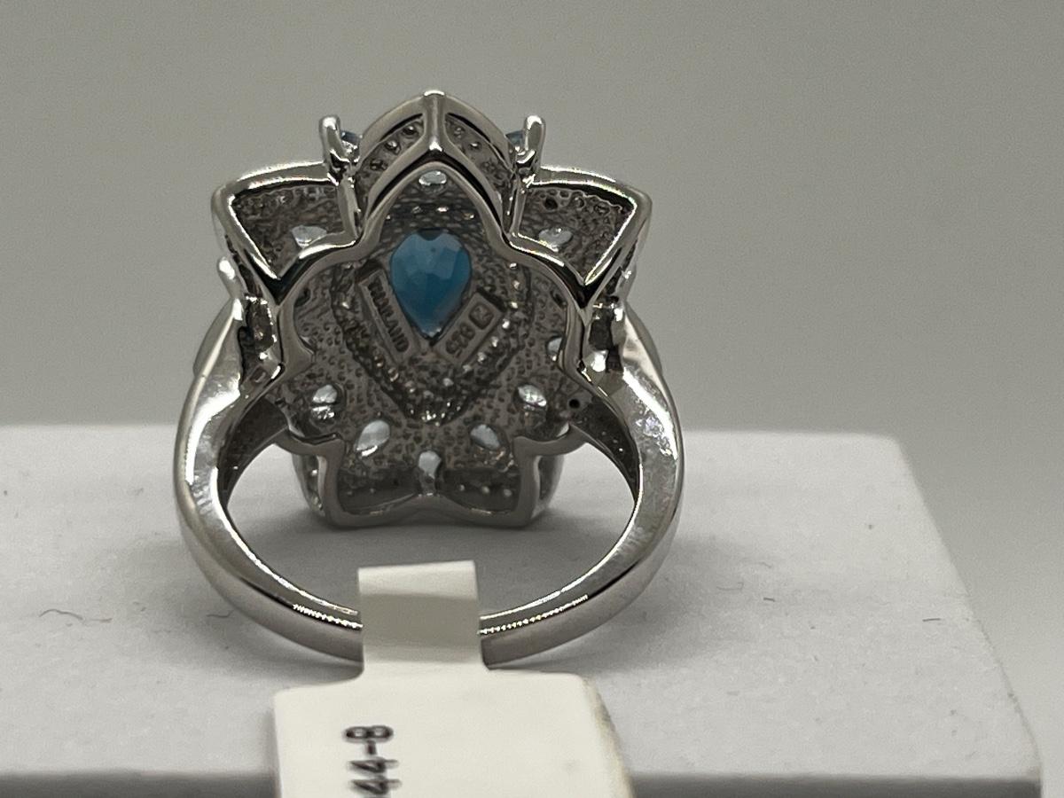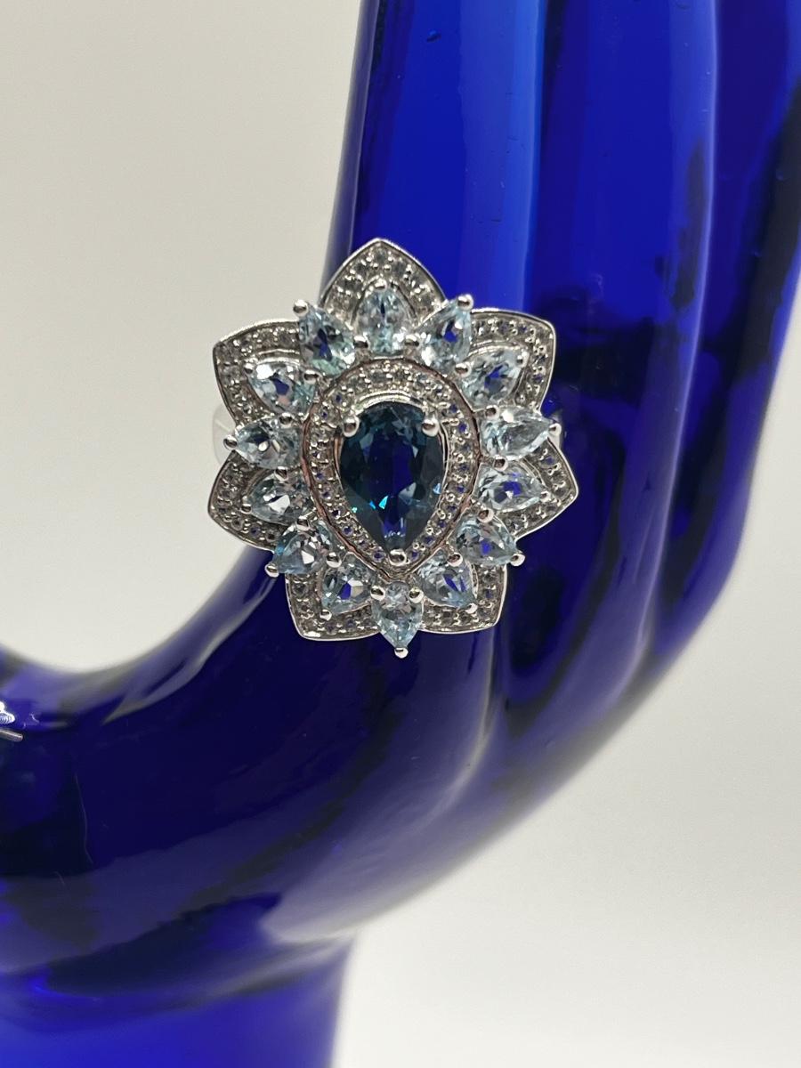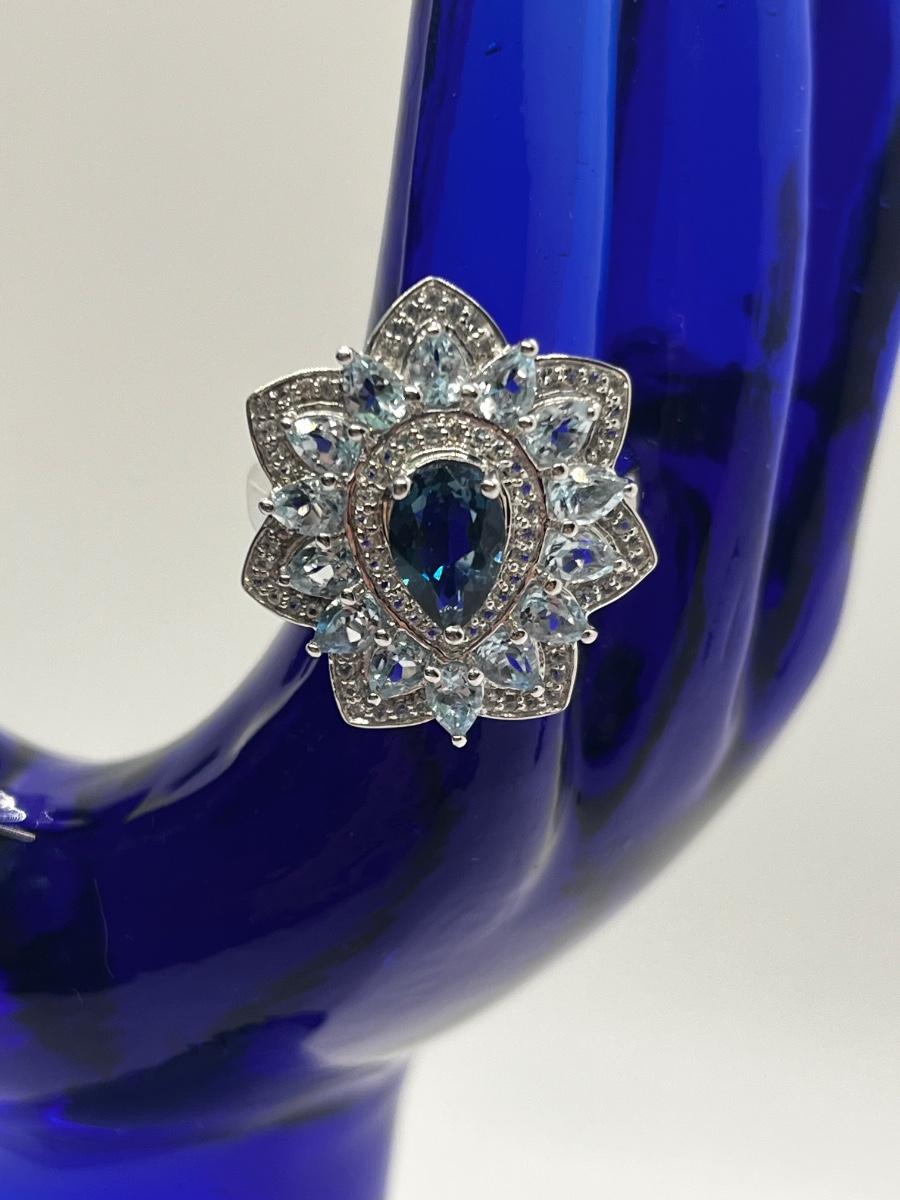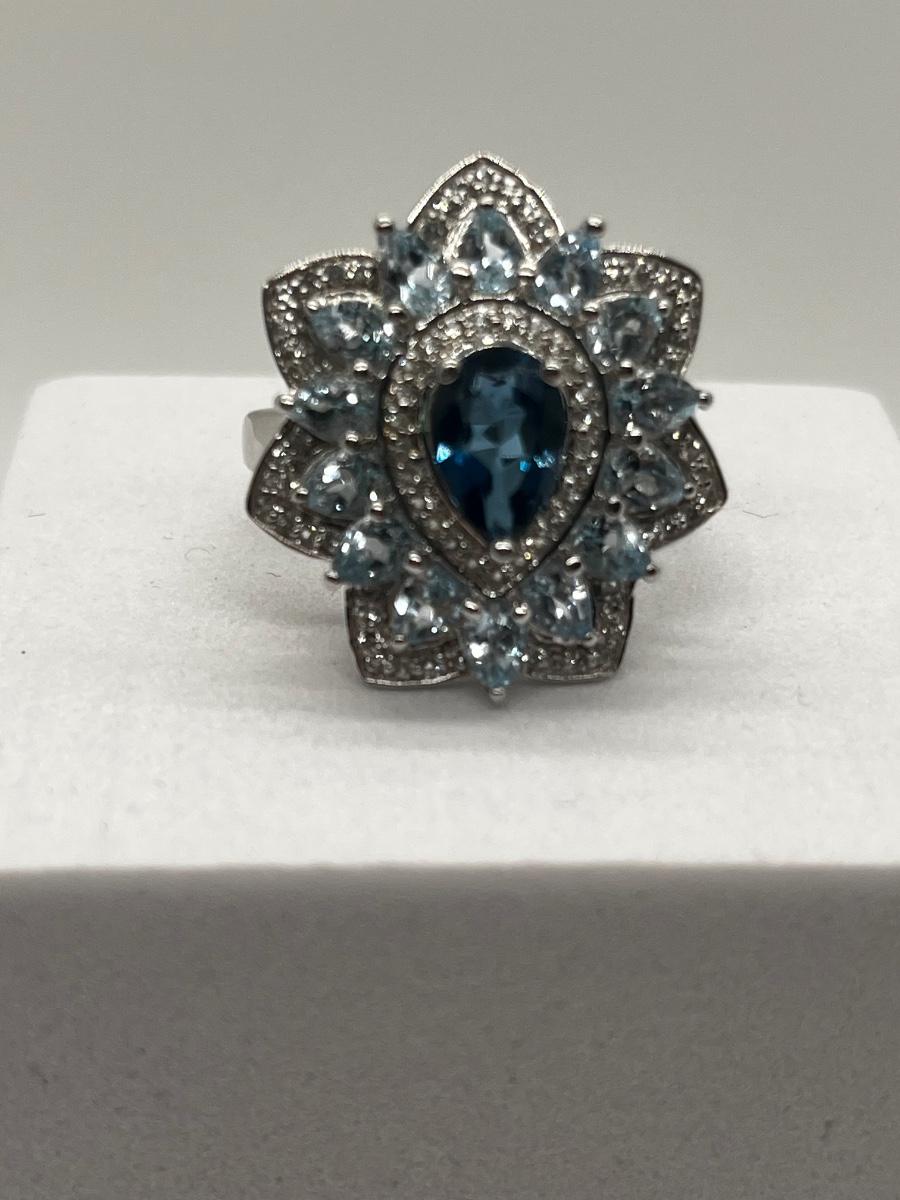 LOT 210:: New! 925 Sterling Ring Pear Shape London Blue Topaz surrounded by Diamond Halo and Sky Blue Topaz and diamonds chips all along the edges! Gorgeous!