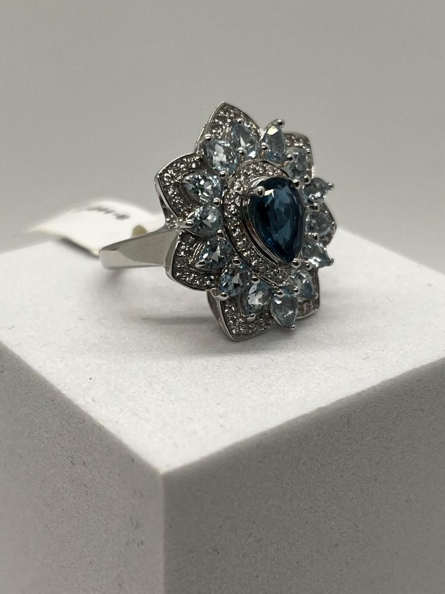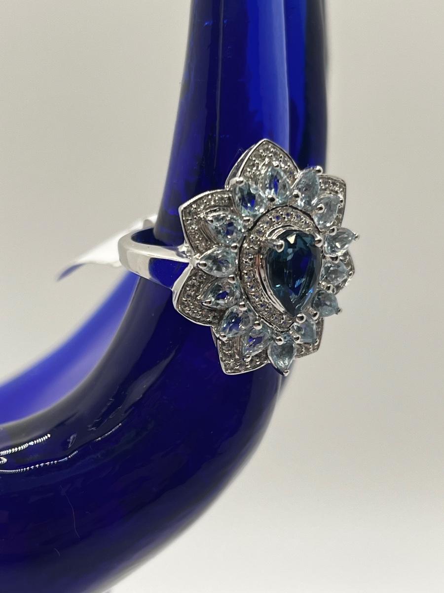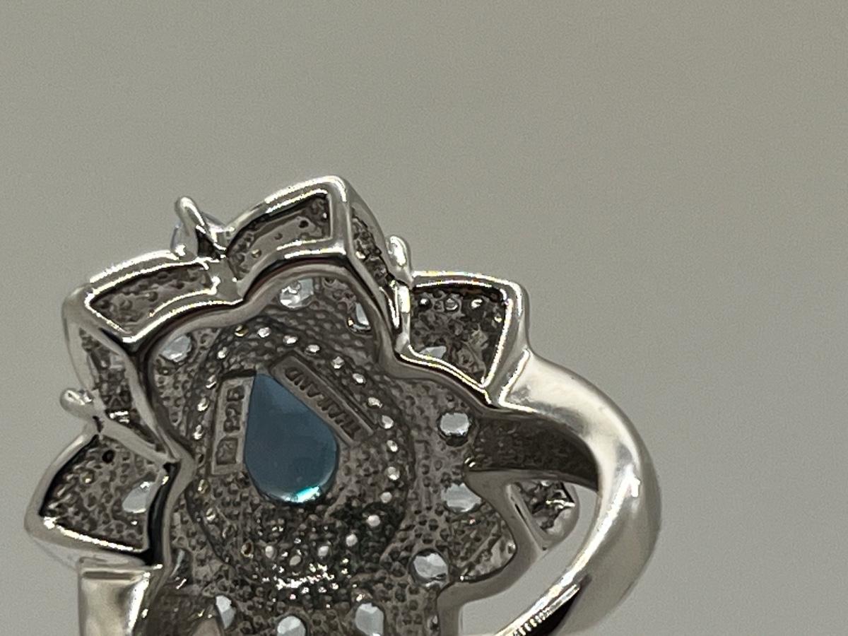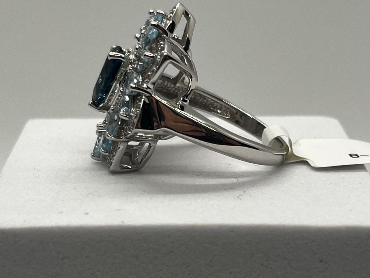 LOT 210:: New! 925 Sterling Ring Pear Shape London Blue Topaz surrounded by Diamond Halo and Sky Blue Topaz and diamonds chips all along the edges! Gorgeous!