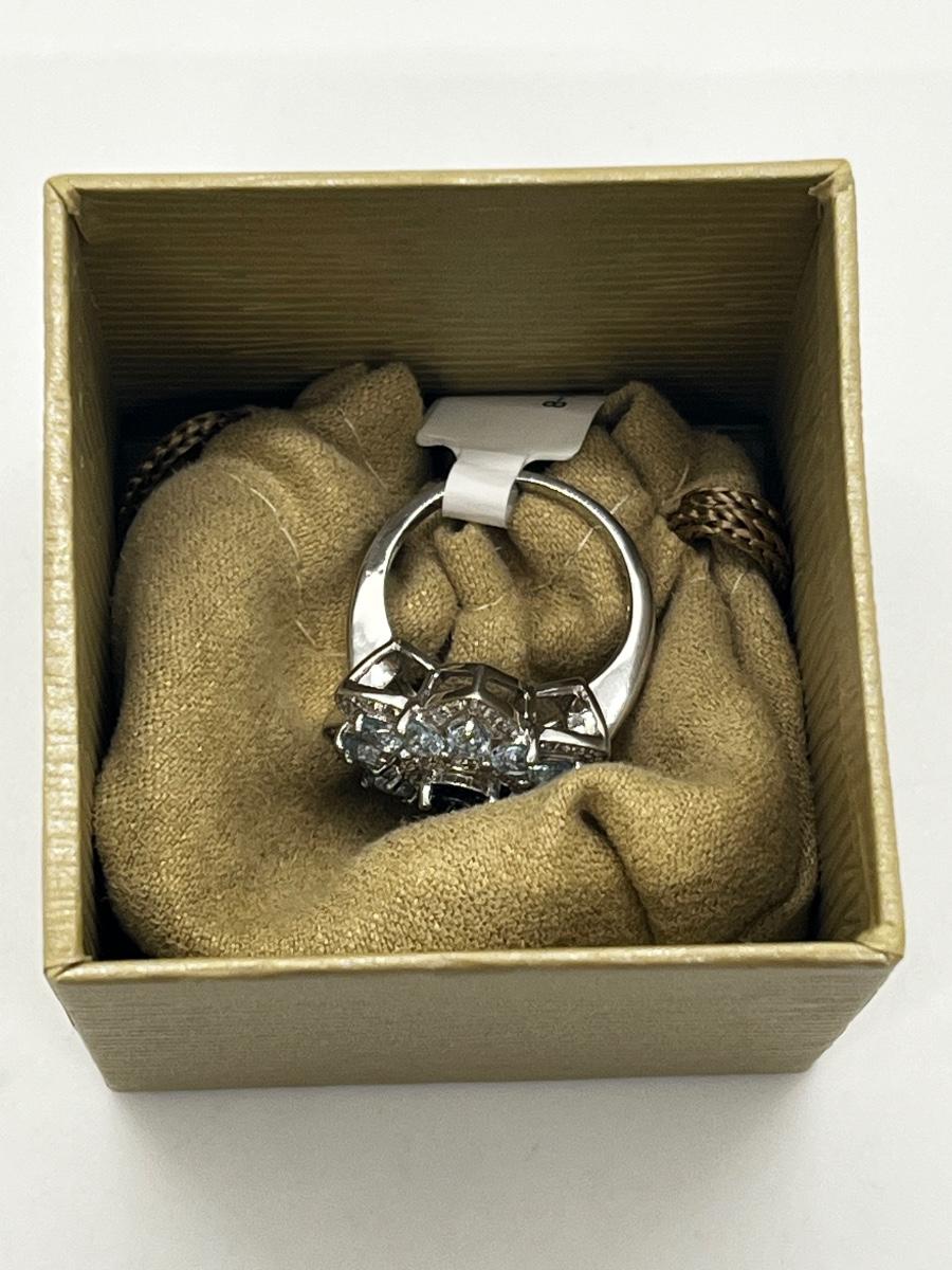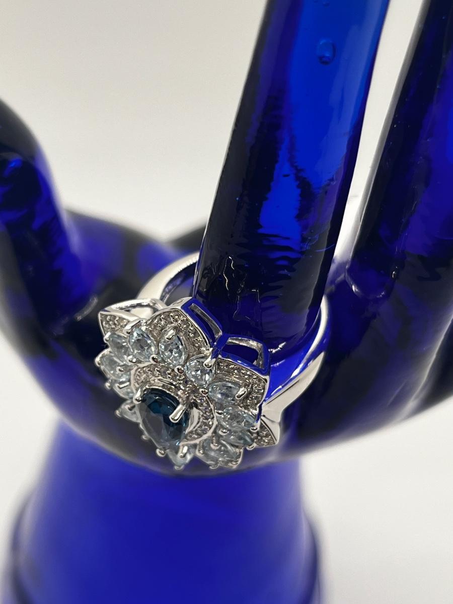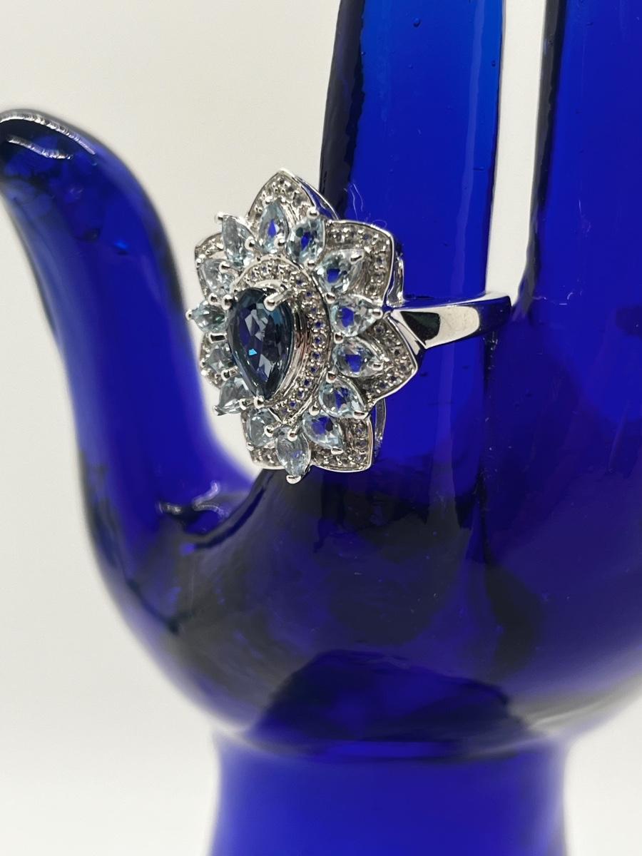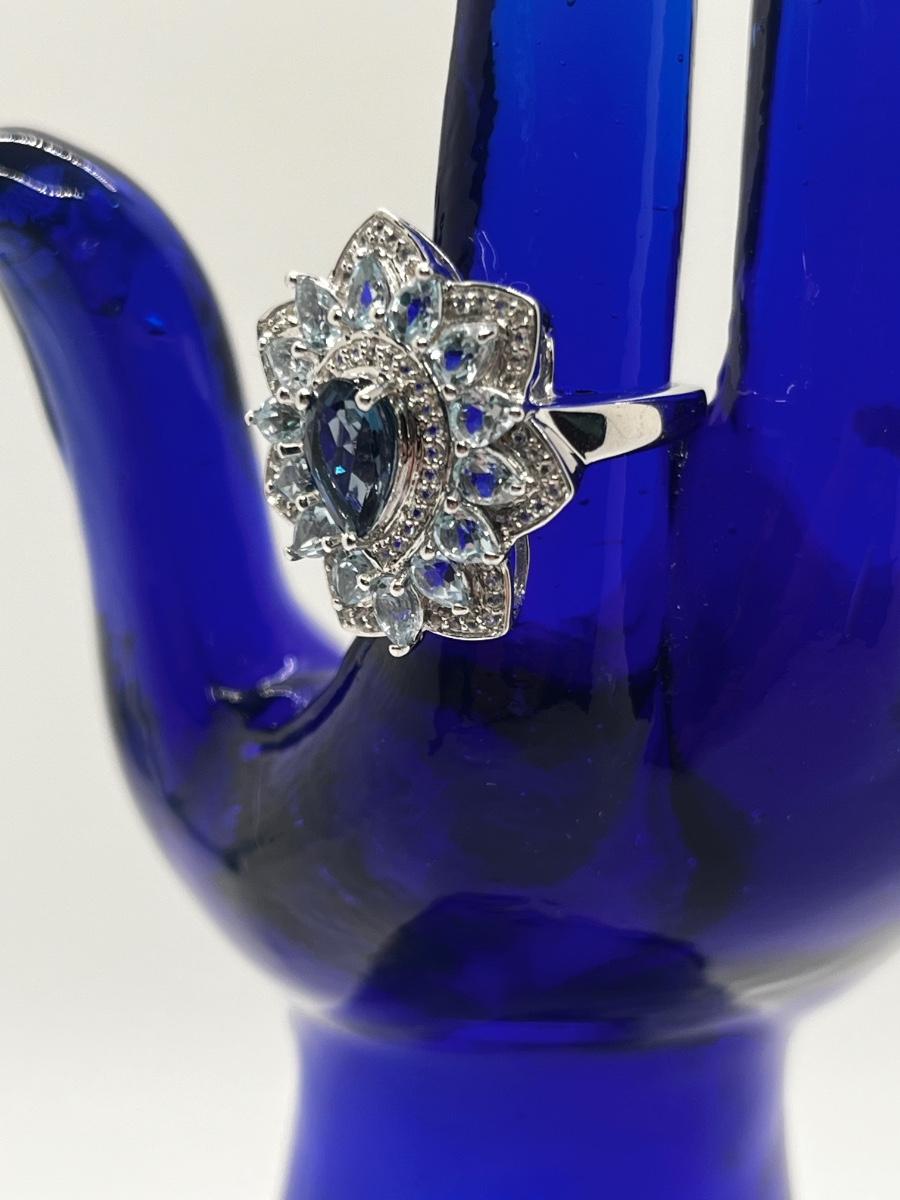 LOT 210:: New! 925 Sterling Ring Pear Shape London Blue Topaz surrounded by Diamond Halo and Sky Blue Topaz and diamonds chips all along the edges! Gorgeous!
