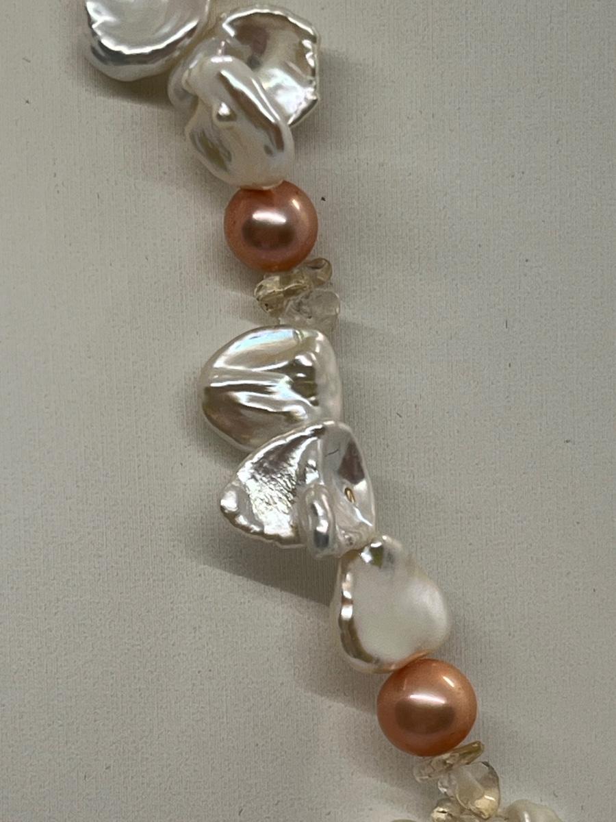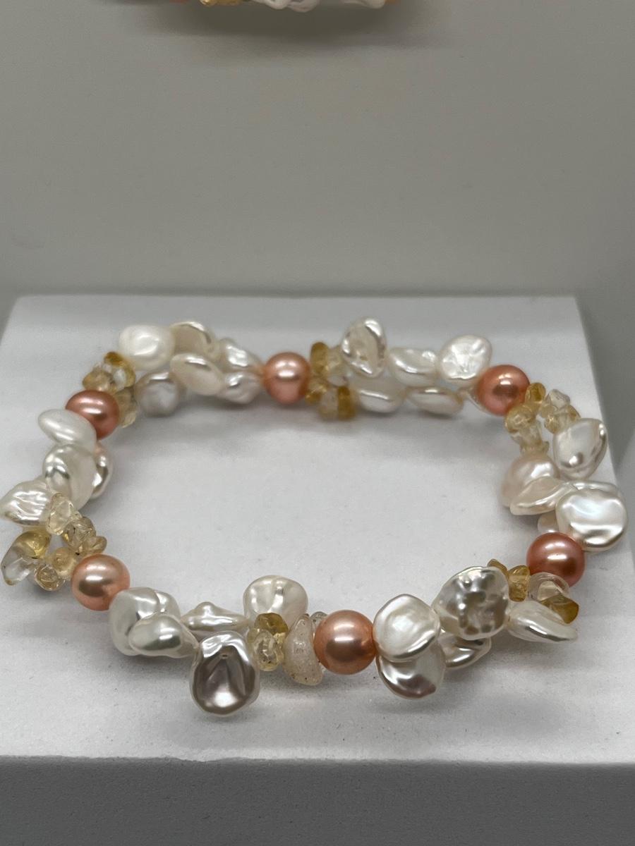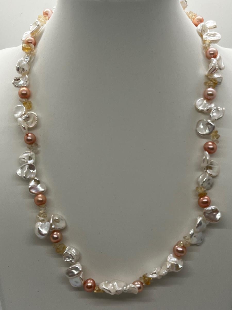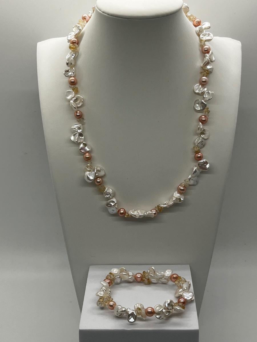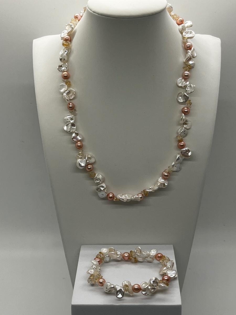 LOT 220J: NEW! Rhodium Over Sterling Silver, Citrine nuggets with White and Peach Cultured Pearl Jewelry Set - 18" Neckkace, 7-1/4" Bracelet