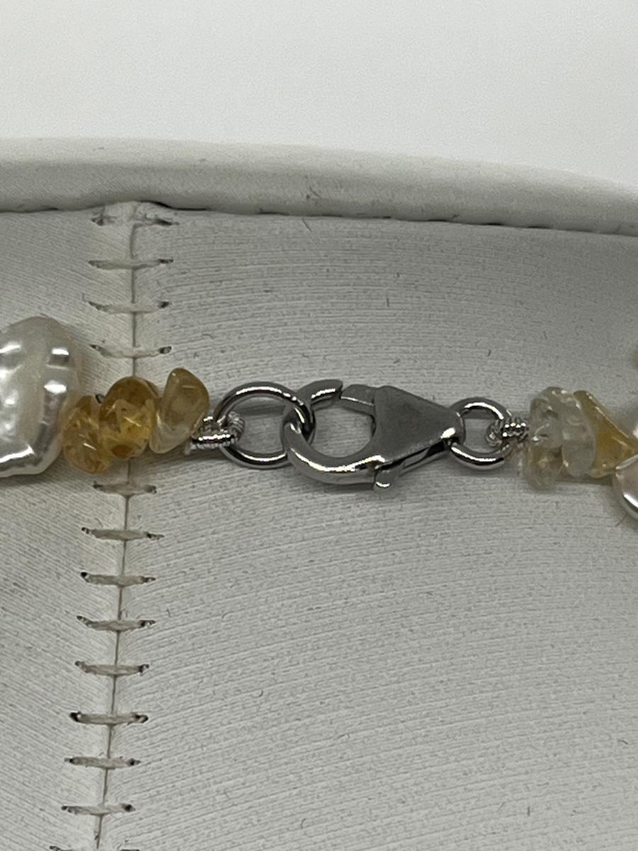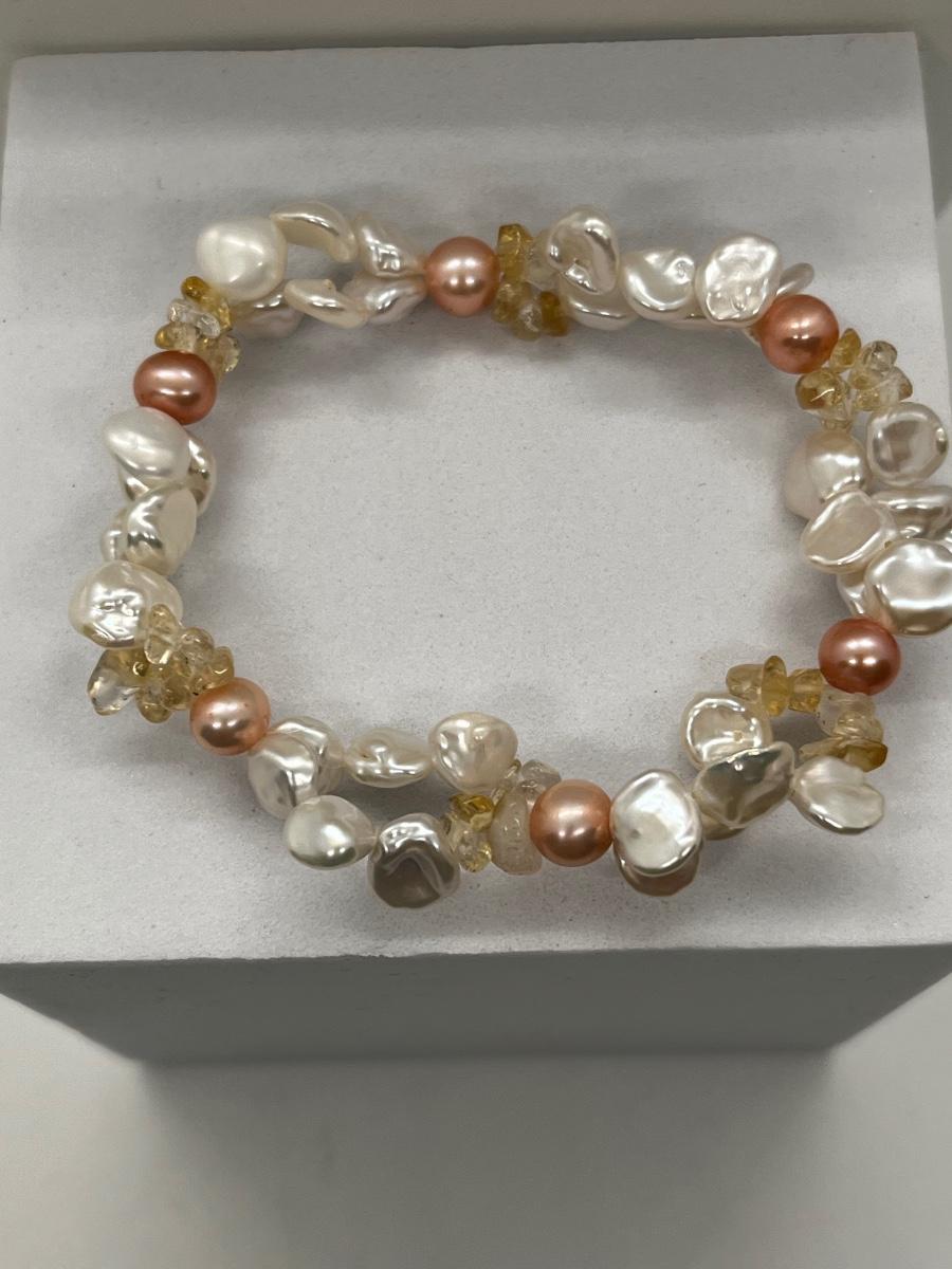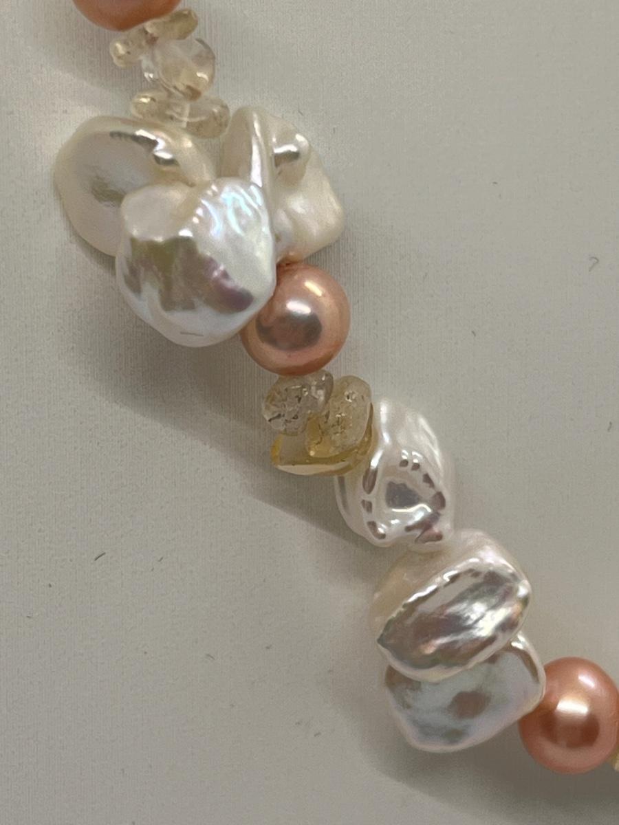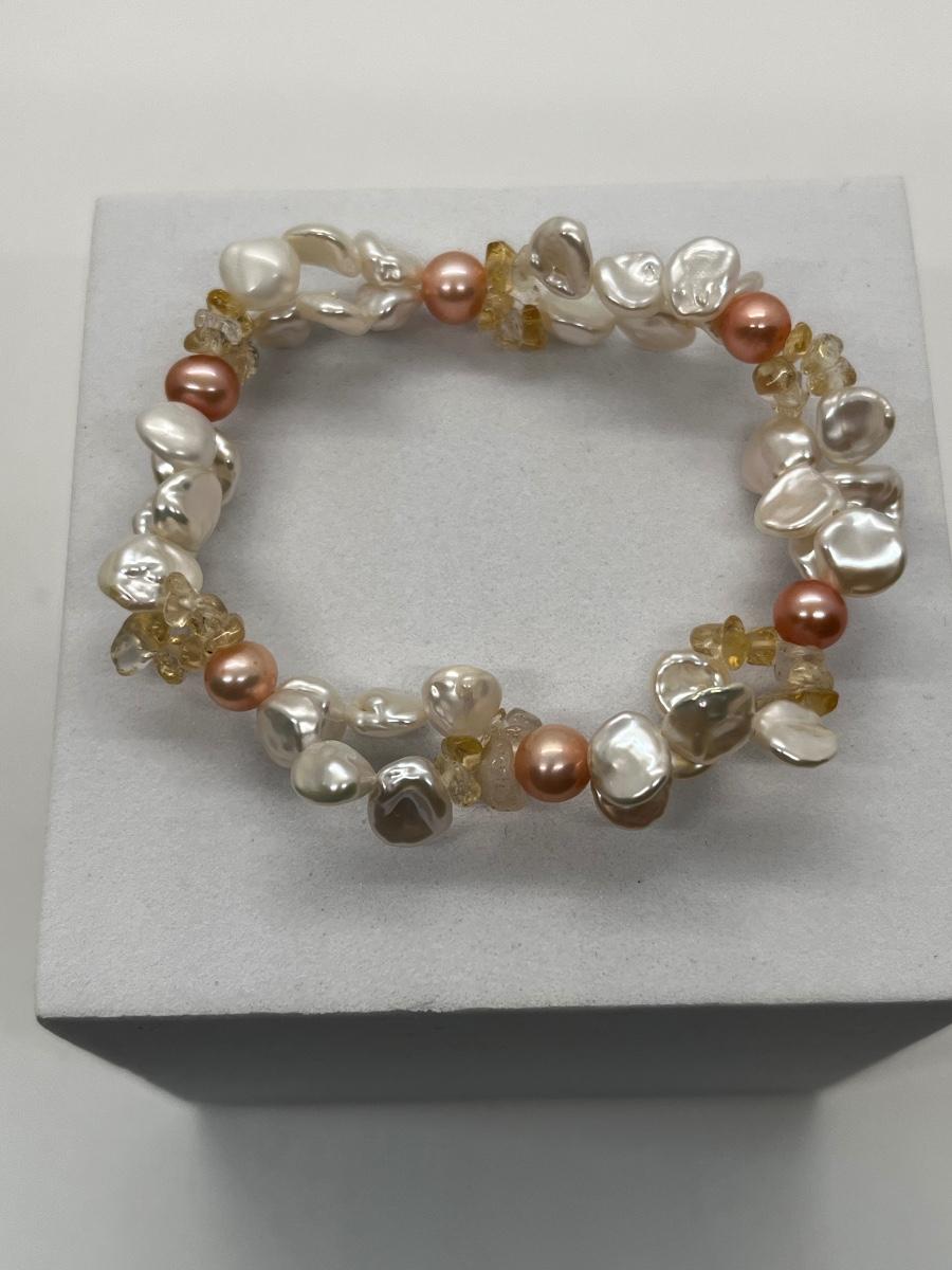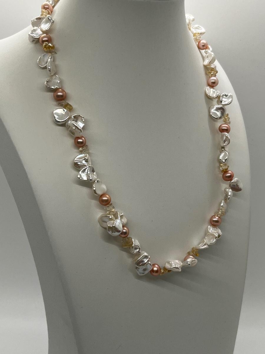 LOT 220J: NEW! Rhodium Over Sterling Silver, Citrine nuggets with White and Peach Cultured Pearl Jewelry Set - 18" Neckkace, 7-1/4" Bracelet