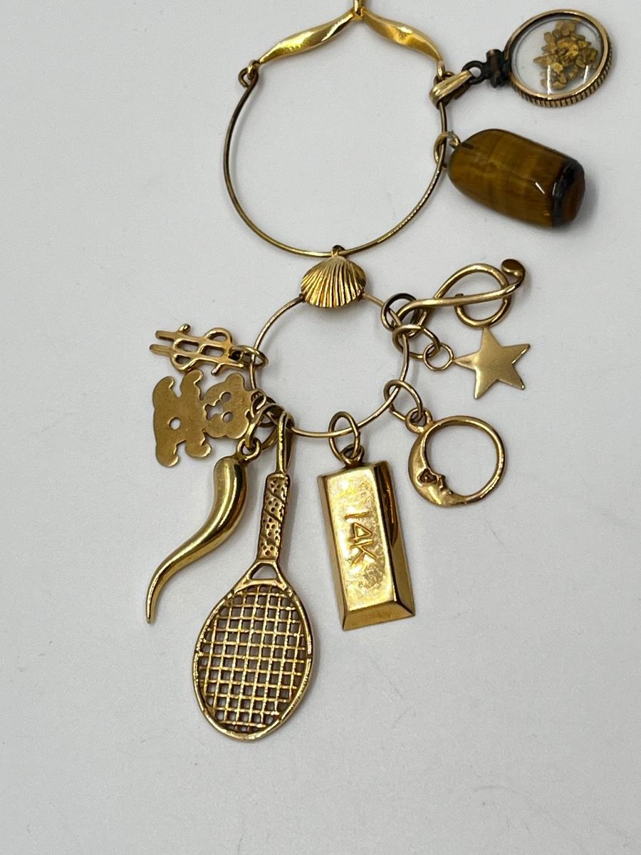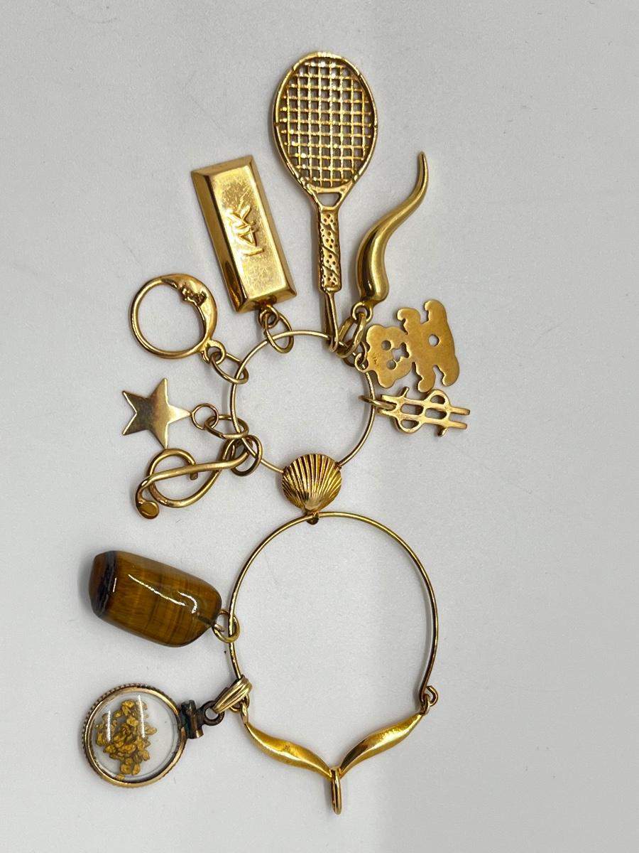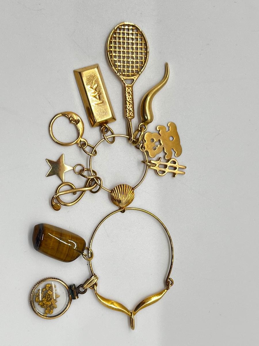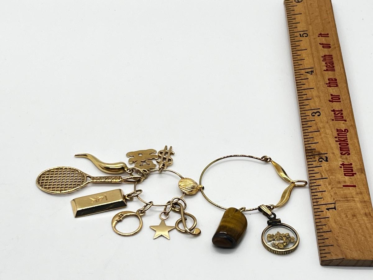 LOT 252J: 14K Double Gold Charm Holder Pendant w/ Eight 14K Charms - 8.6 g and 2 others unmarked