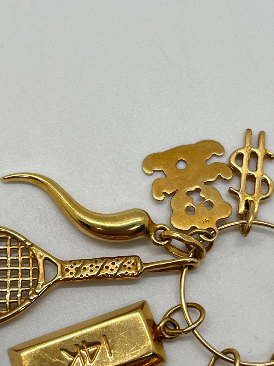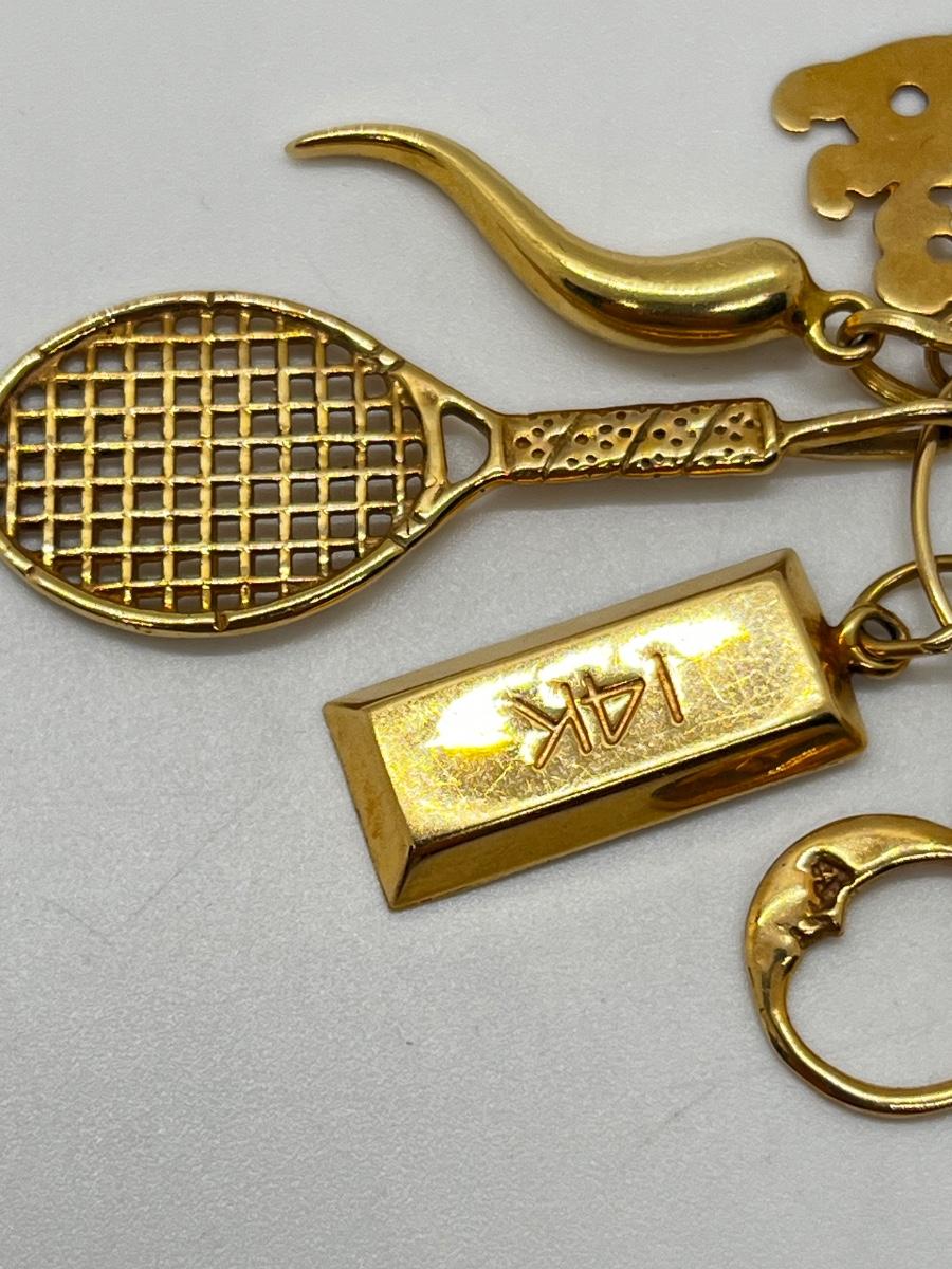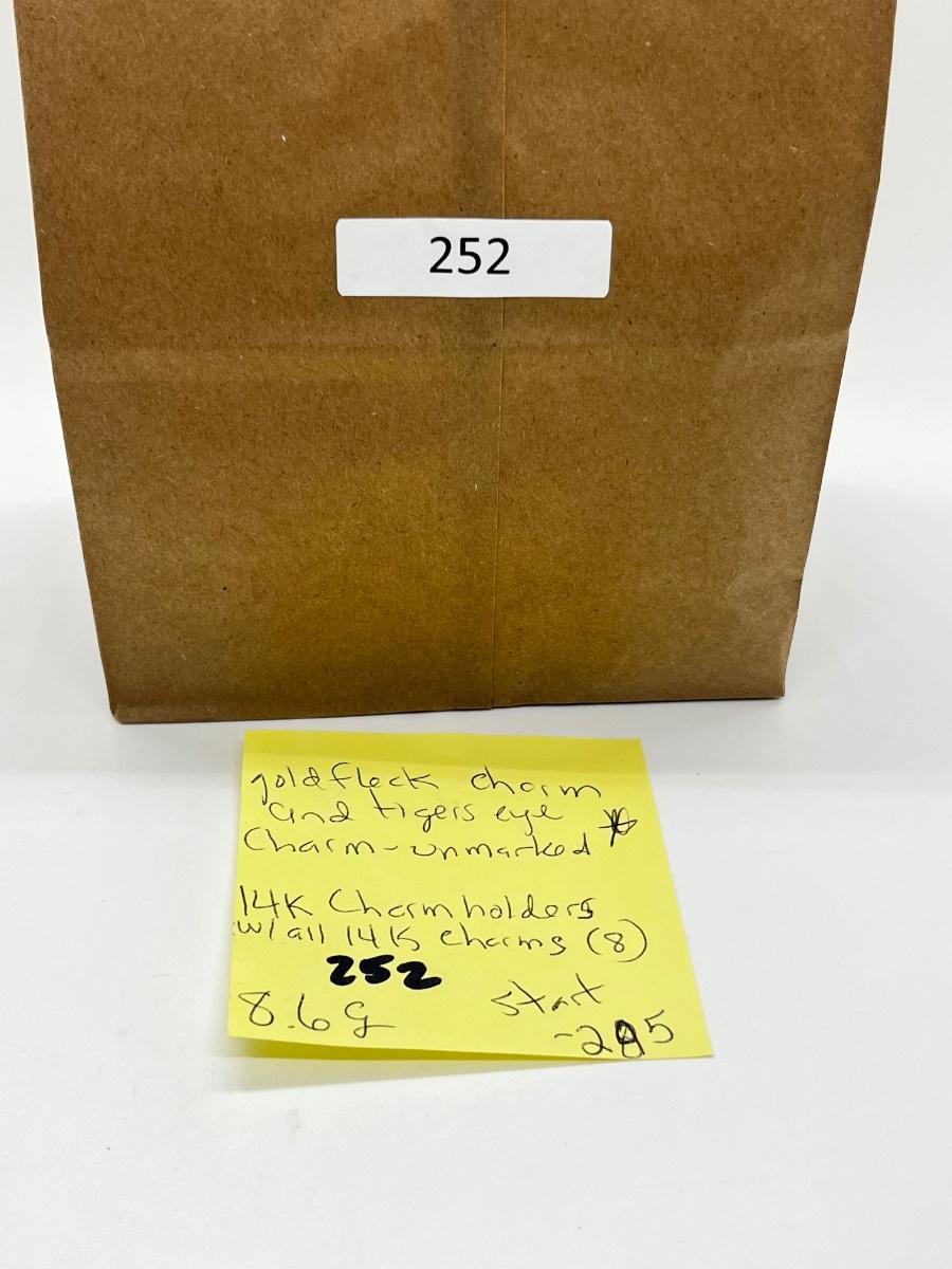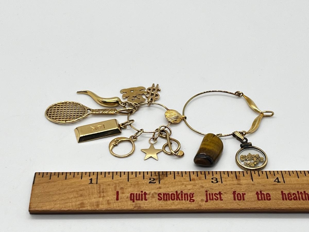 LOT 252J: 14K Double Gold Charm Holder Pendant w/ Eight 14K Charms - 8.6 g and 2 others unmarked