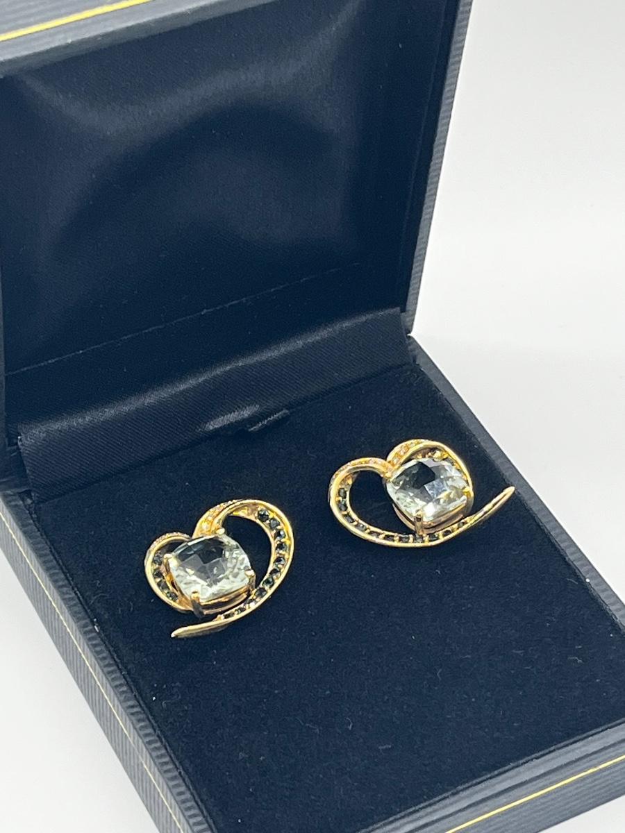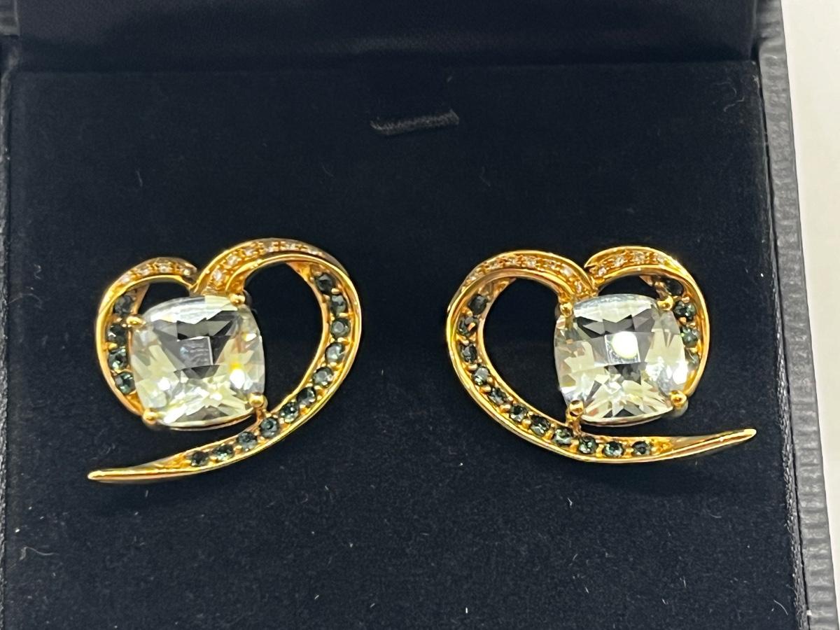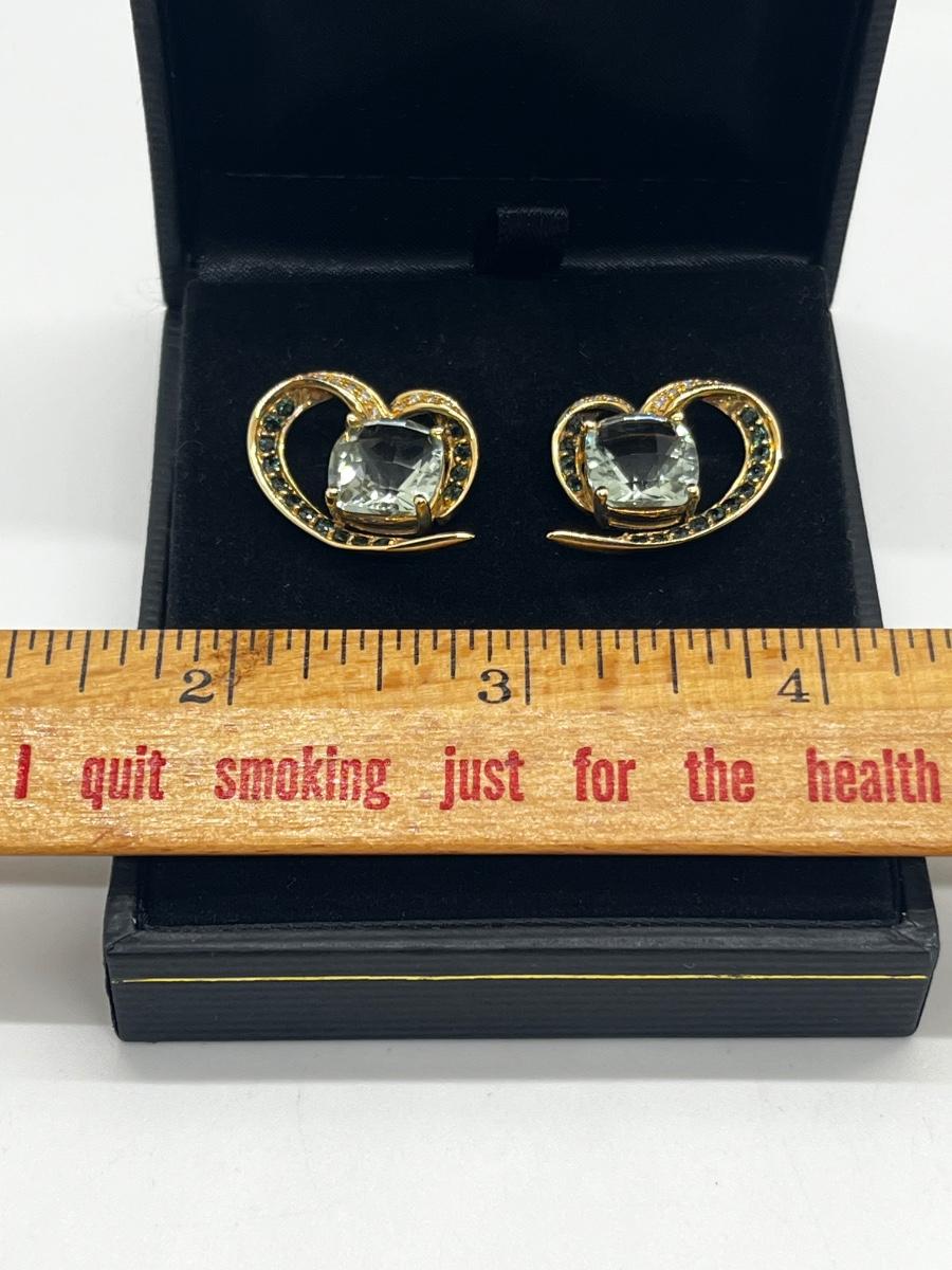 LOT 253J: Big and Beautiful 14K Gold & Diamond Heart Earrings w/ Green Amethyst - 8.6 gtw