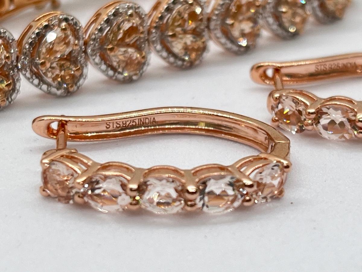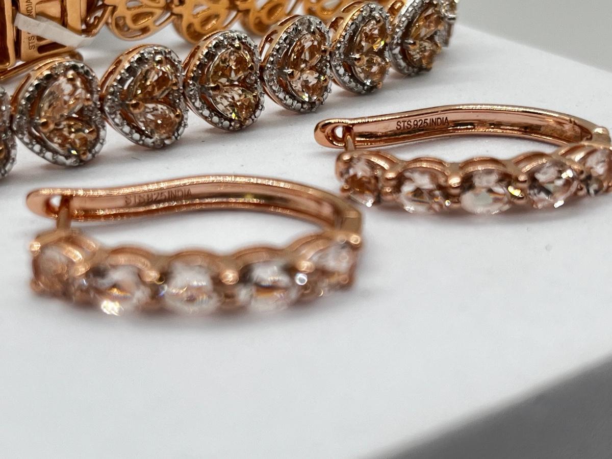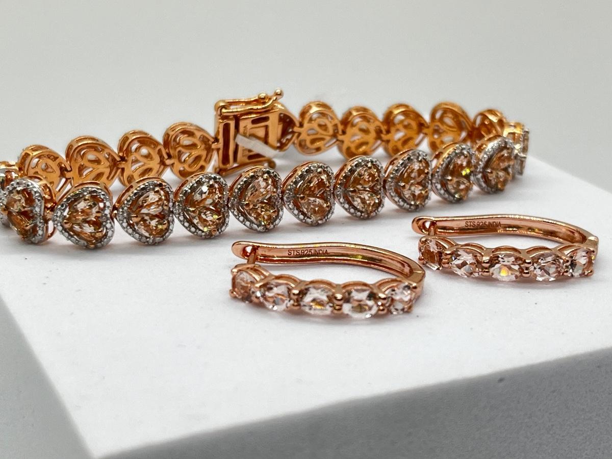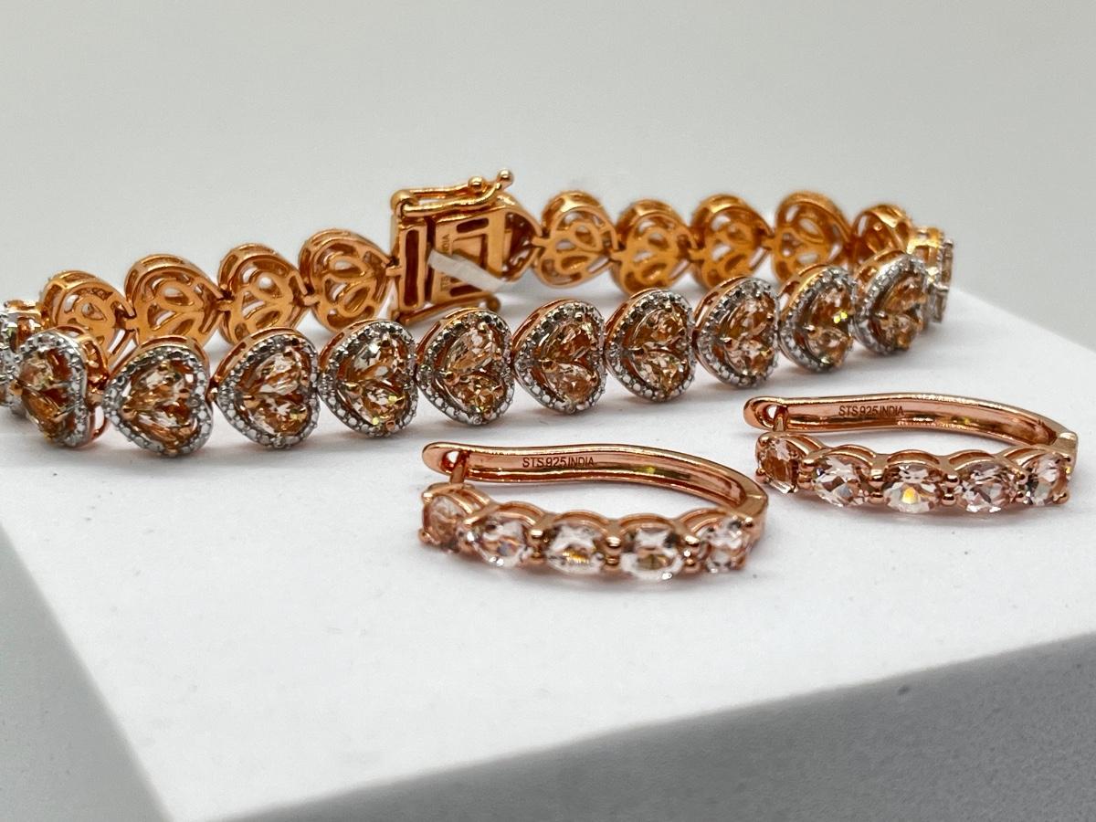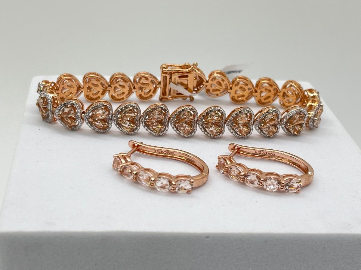LOT 297J: New! 925 Morganite and Diamond Heart Shaped Tennis Bracelet and Matching Earrings with oval cut gems - Sterling Silver with 18k Rose gold overlay