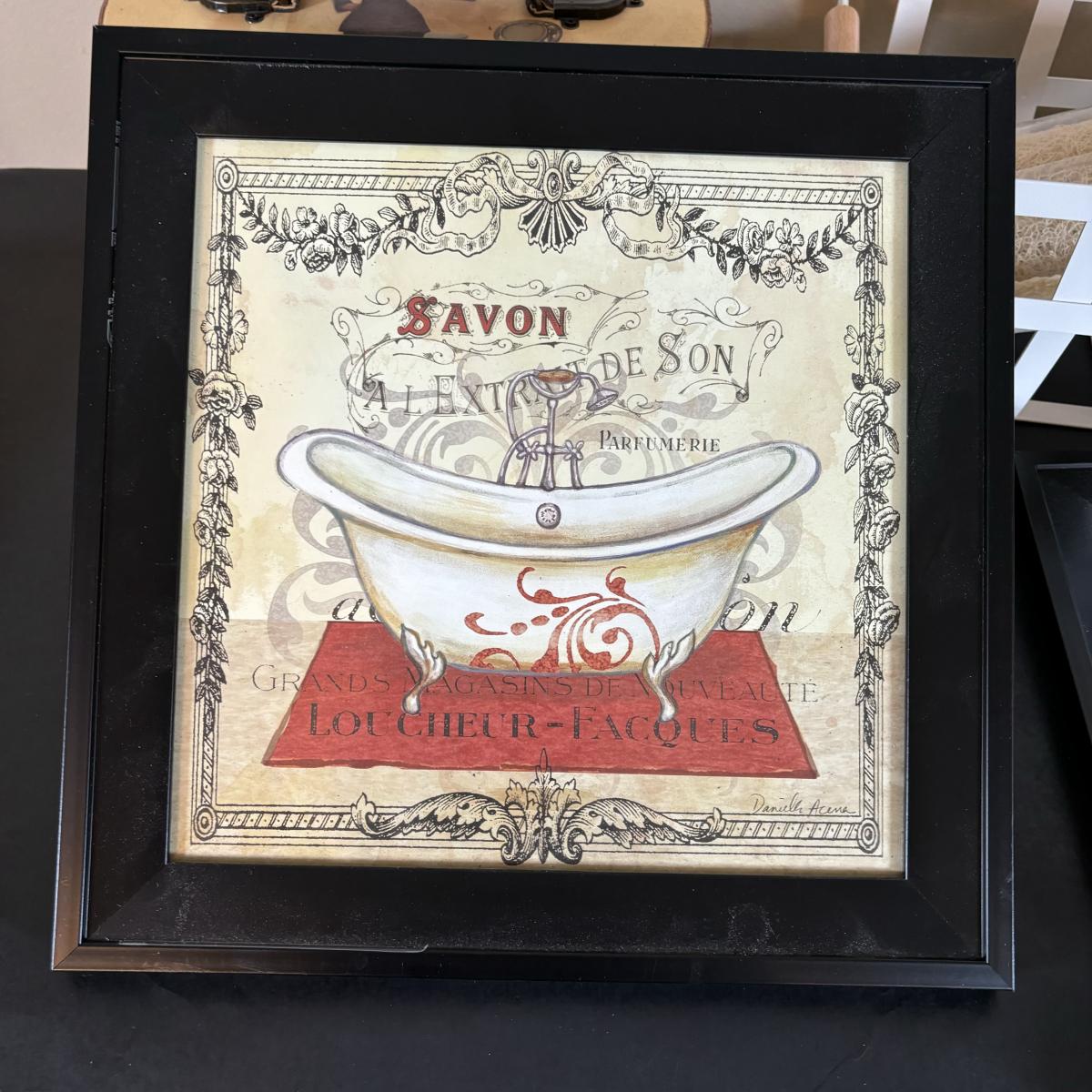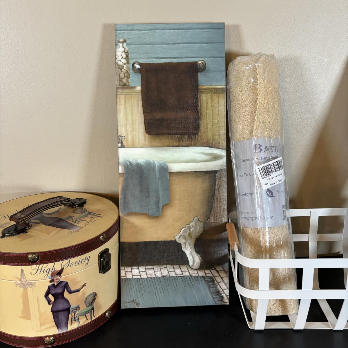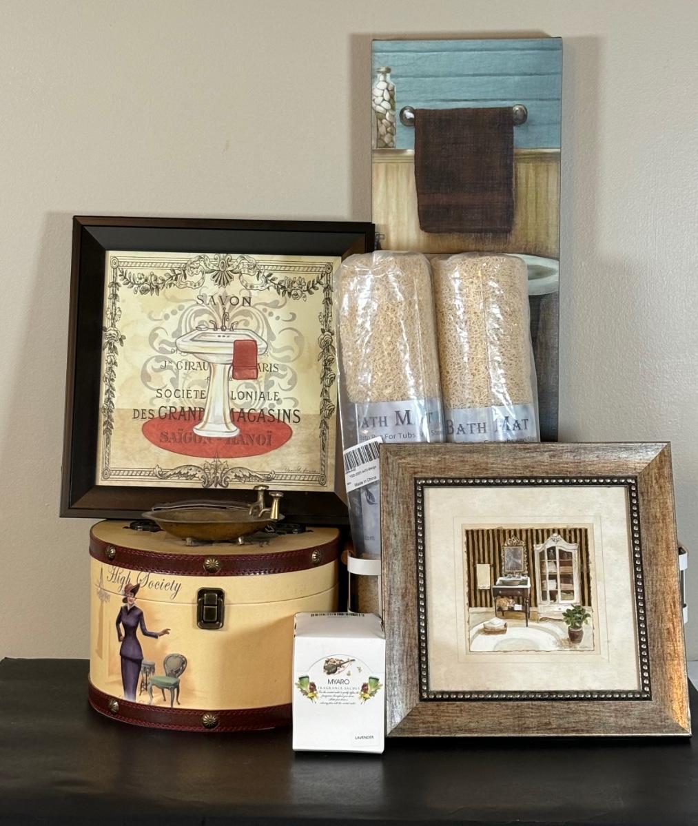 LOT 8: Paris Inspired Bathroom Decor with Wall Art, Hat Box and More