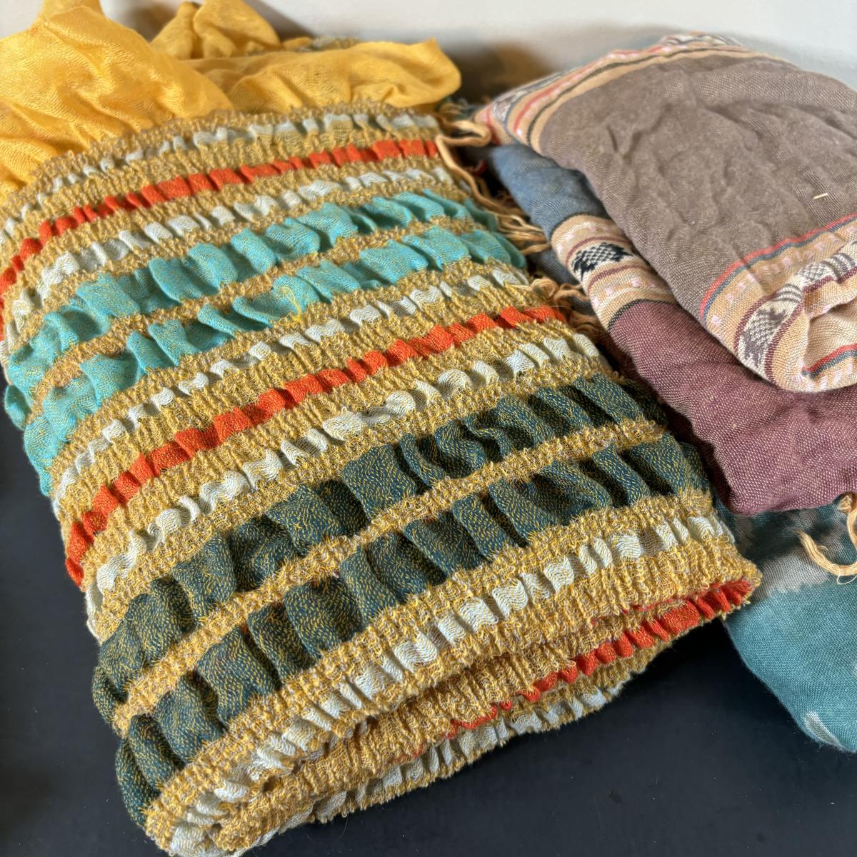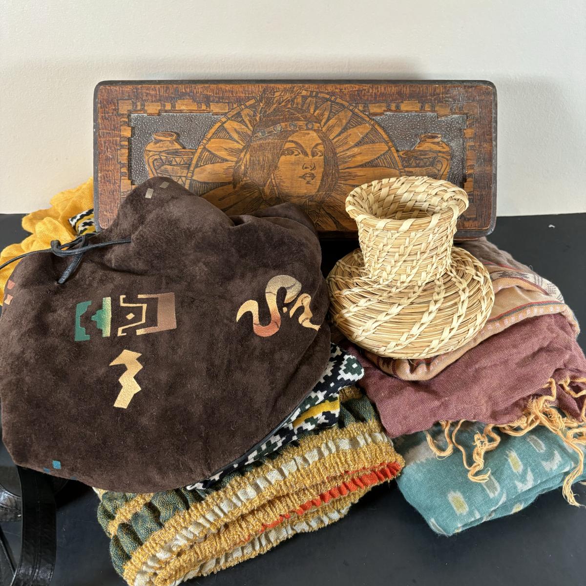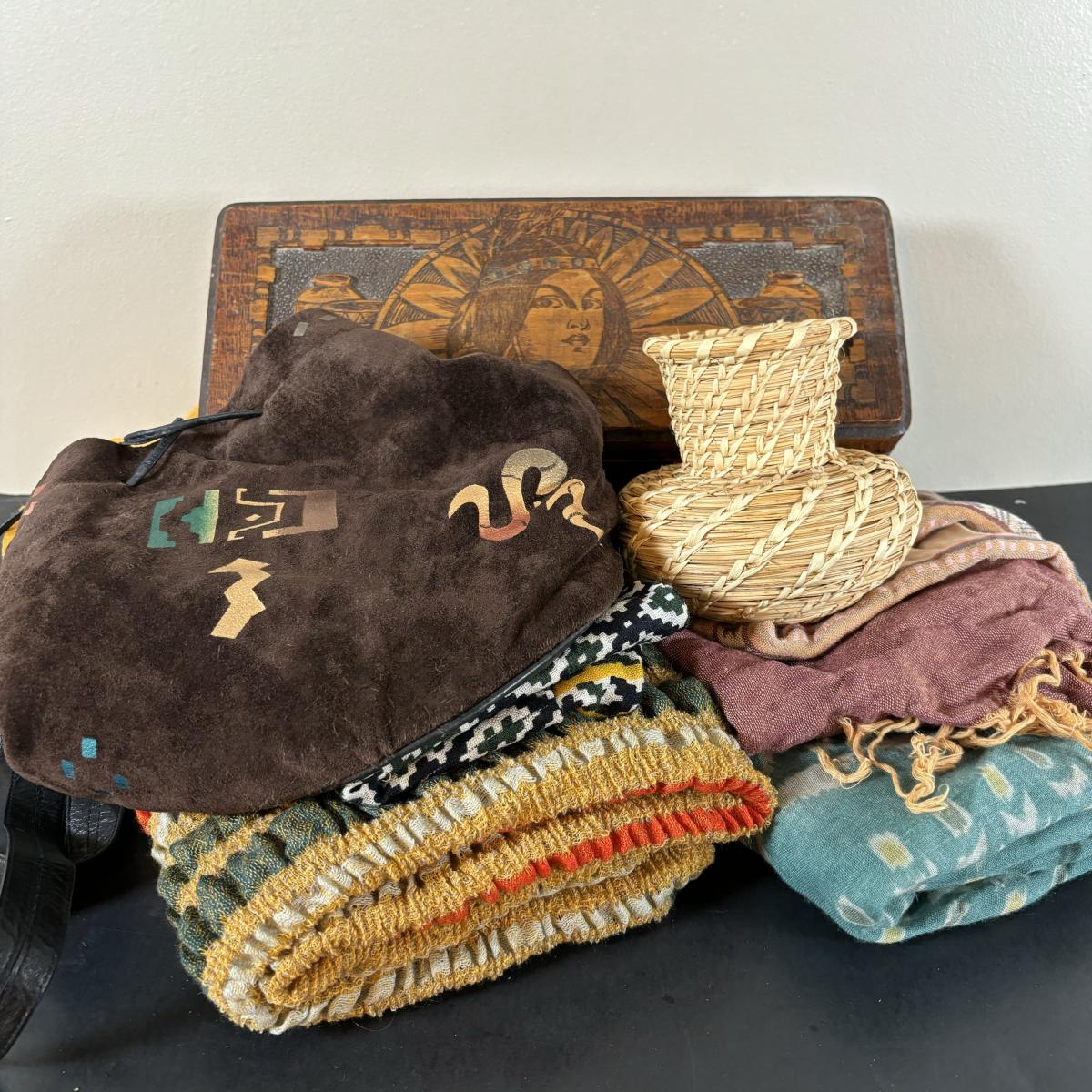 LOT 11: Native American/Southwestern Inspired Collection Including Blankets, Basket, Box and Bag