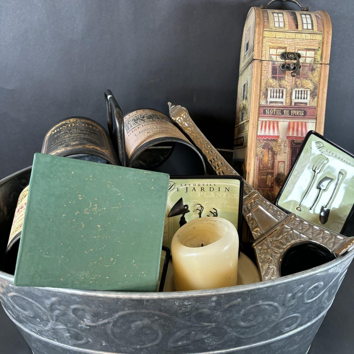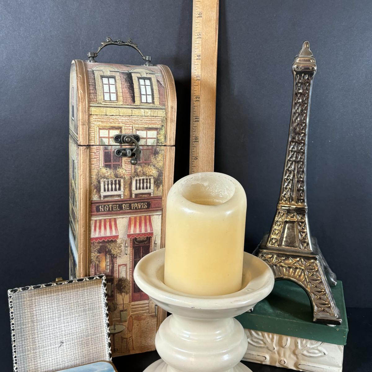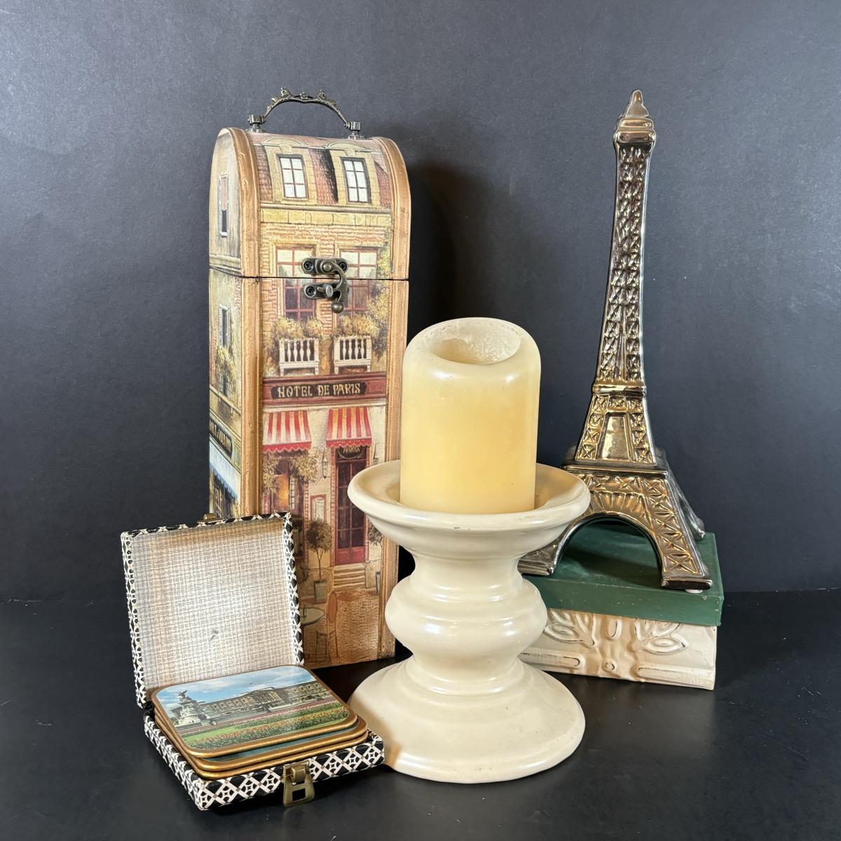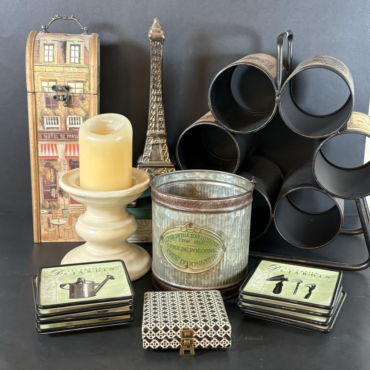LOT:13: Paris Inspired Home Decor Including a Wine Rack, Coasters, Tins and More