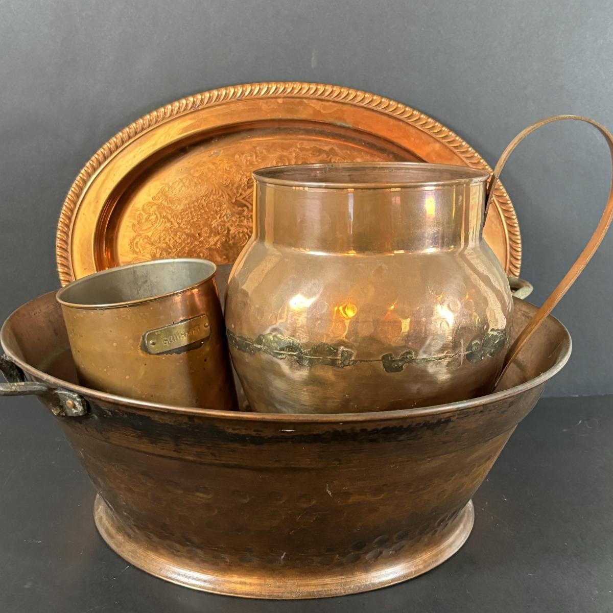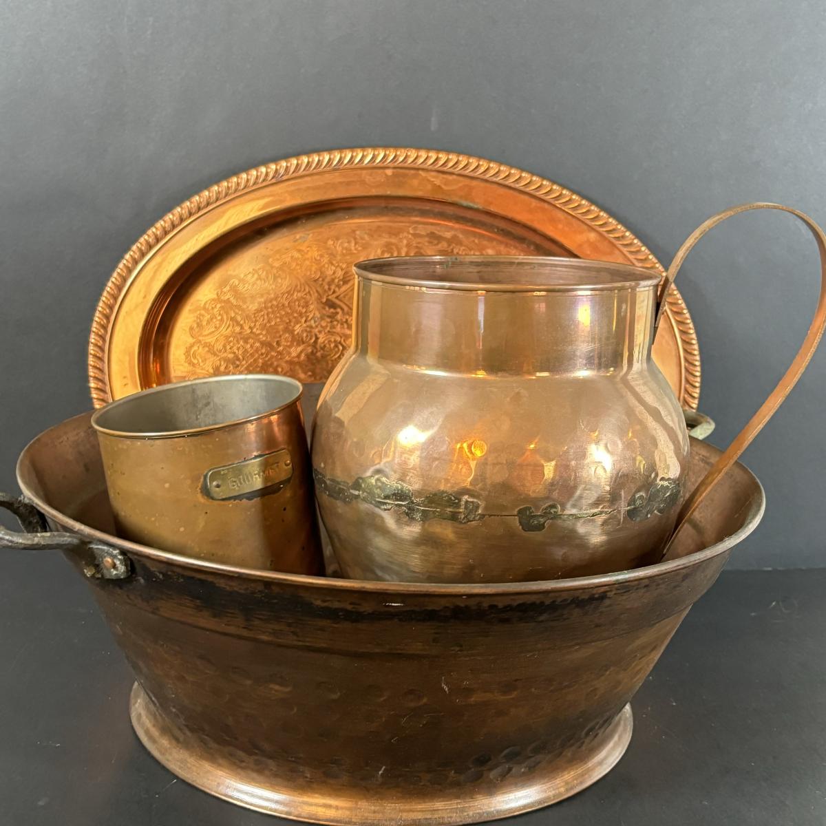 LOT 15: Assortment of Copper - Tray, Jug, Canister and Bowl