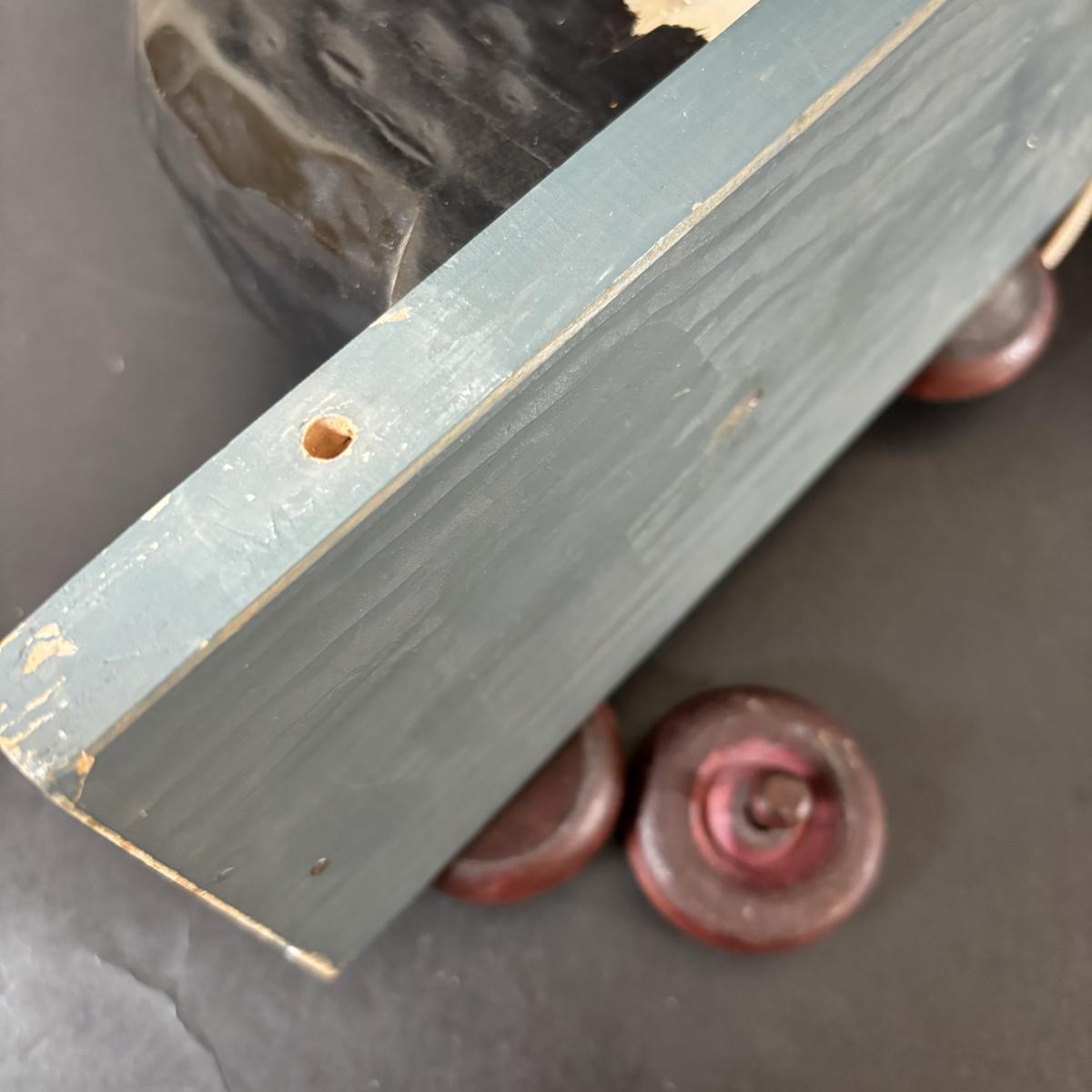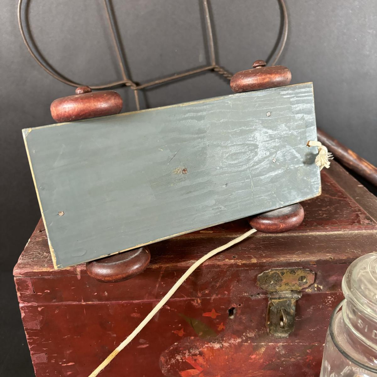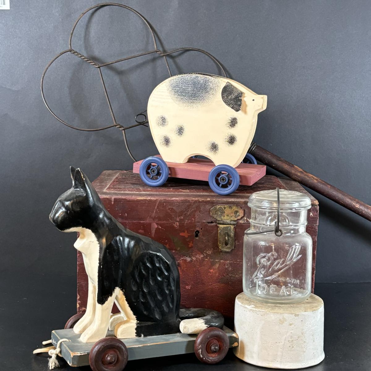 LOT 16: Antique Style Wooden Pull Toys, Wood Box, Ball Jar, Rug Beater and More