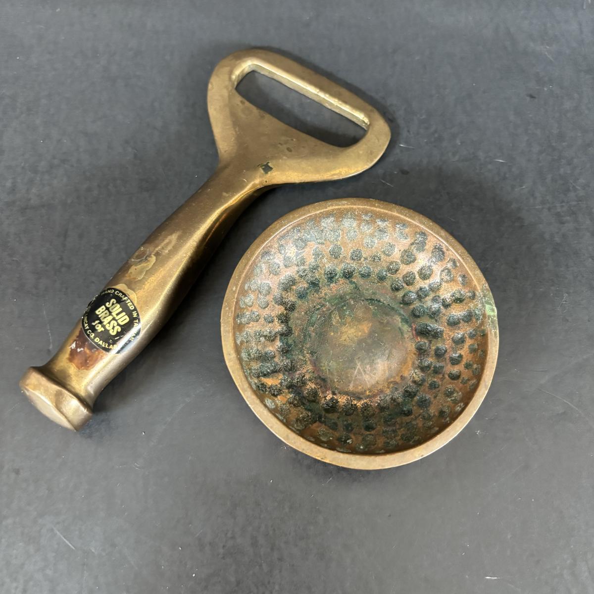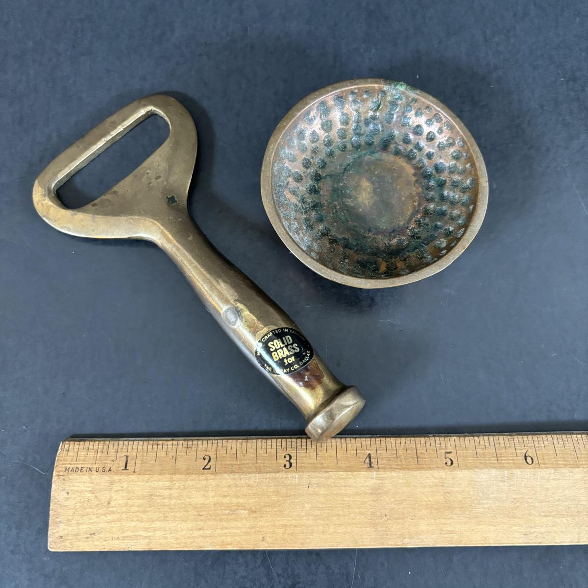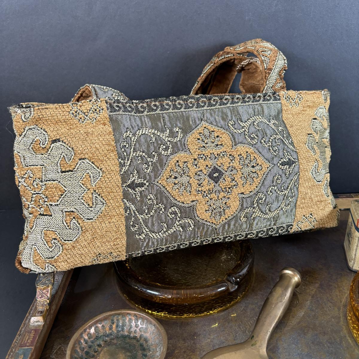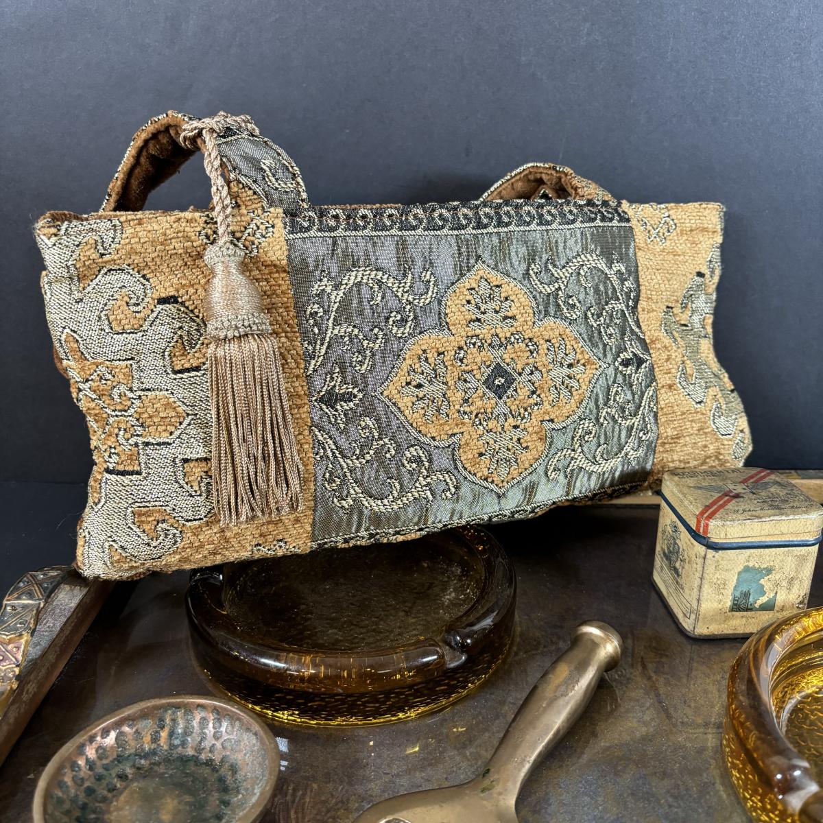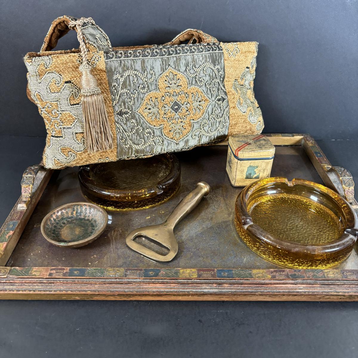 LOT 24: Vintage Pieces of Eight Tray, Tapestry Style Bag Amber Ashtrays, Tobacco Box, Brass Bottle Opener and More