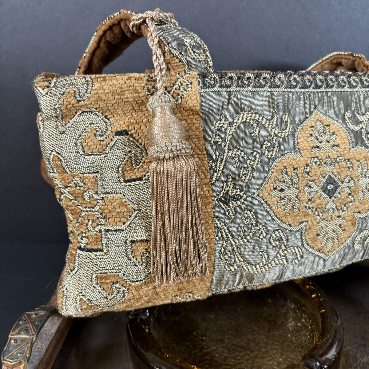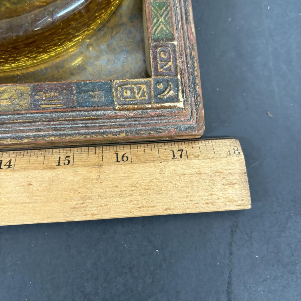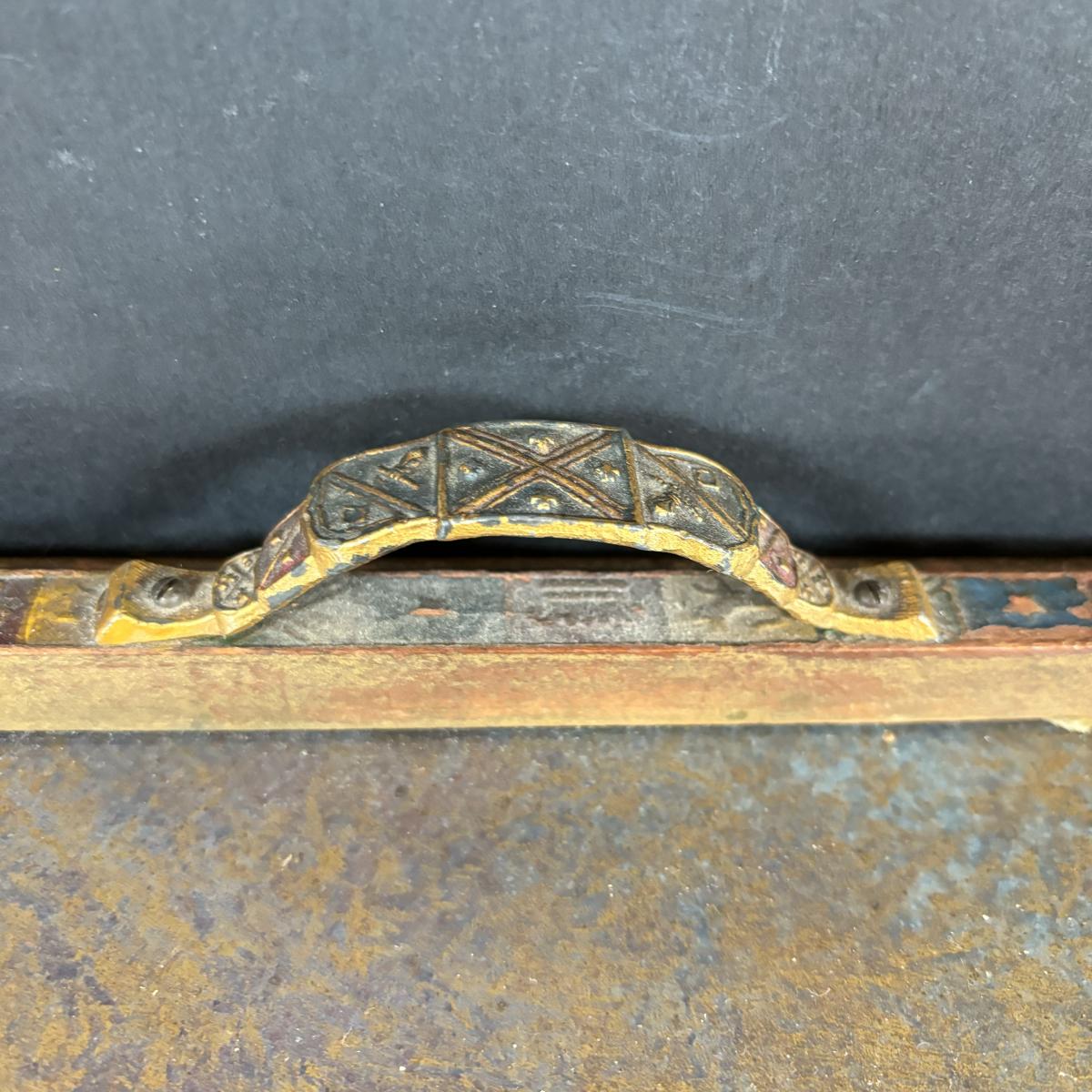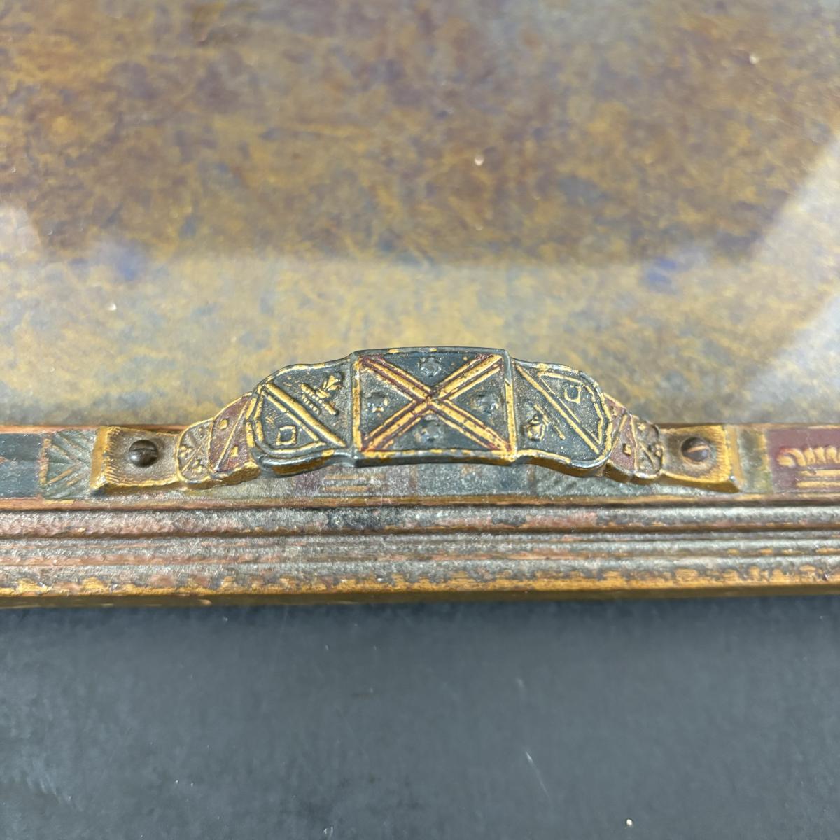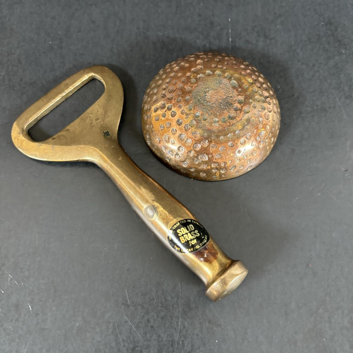 LOT 24: Vintage Pieces of Eight Tray, Tapestry Style Bag Amber Ashtrays, Tobacco Box, Brass Bottle Opener and More