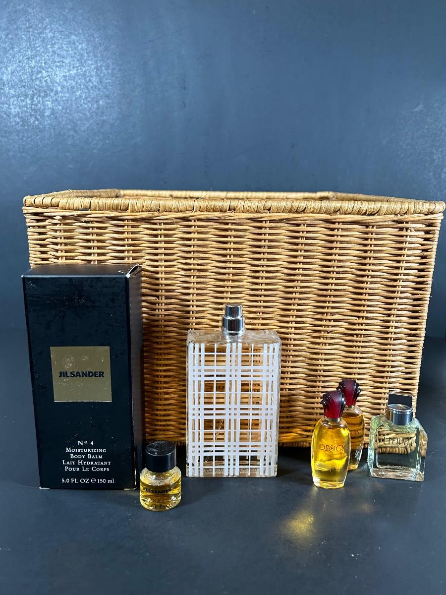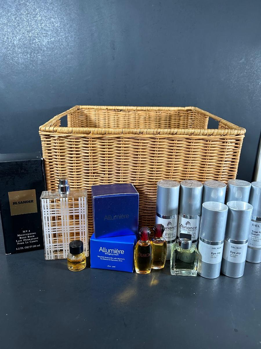 LOT 55: Basket of High End Skin Care & Perfume - Burberry Perfume, Jill Sander Body Balm, Allumiere Anti Aging Cream, Del-Mar, Vibrance Skin Care